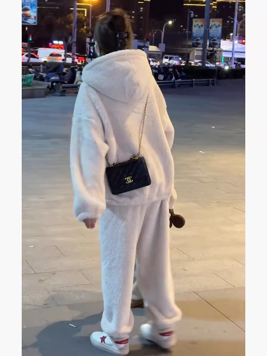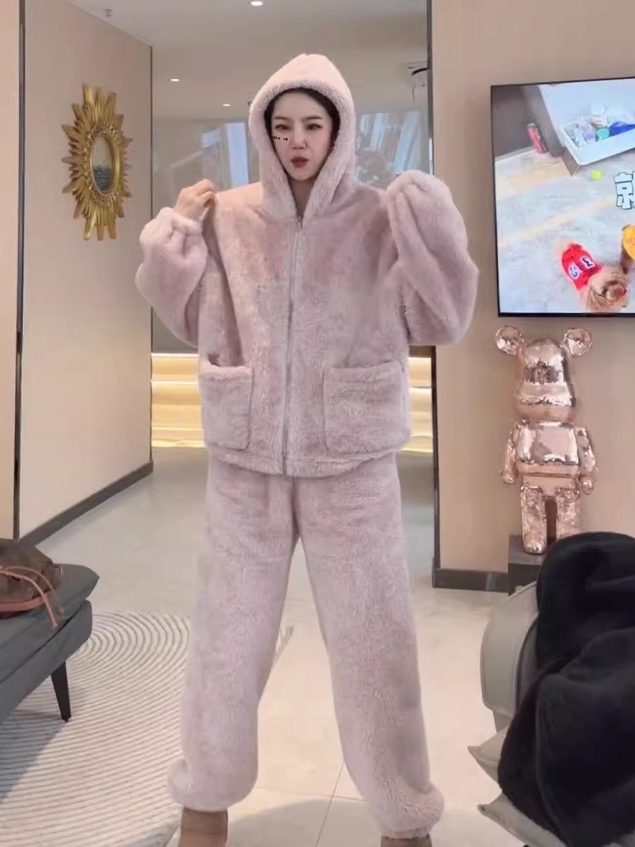 한국 스타일 캐주얼 후드 봉제 자켓 여성 2024 년 겨울 새 느슨한 기모 홈 옷 투피스 세트