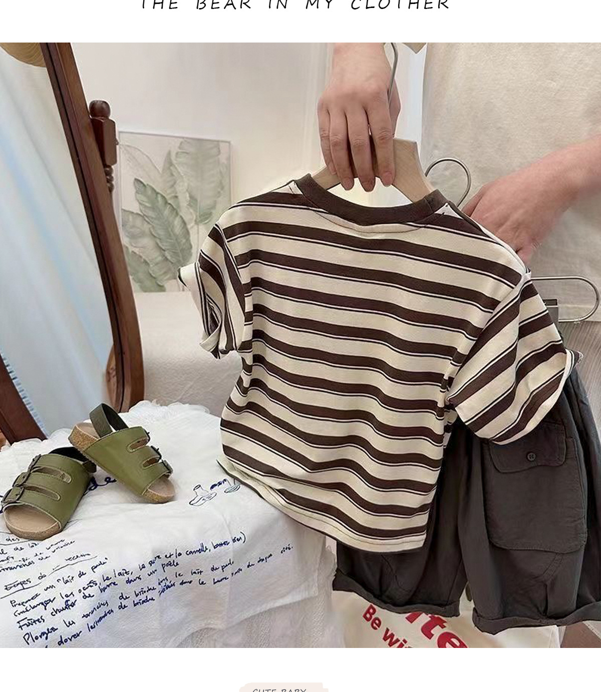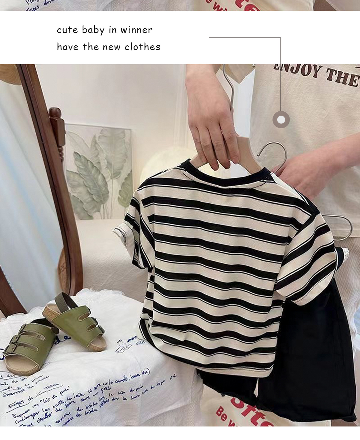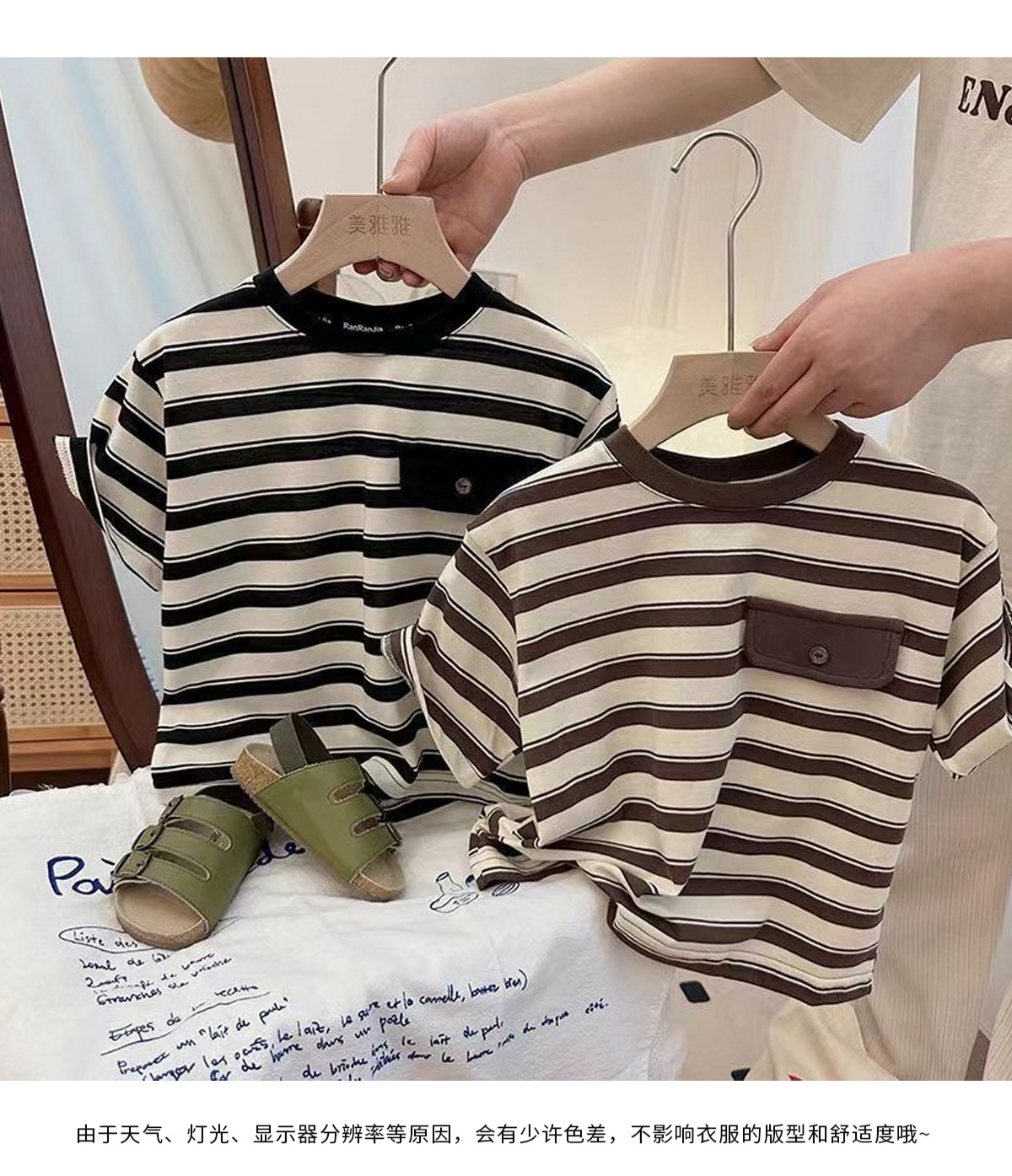 한국 줄무늬 소년 소녀 여름 색상 일치 라운드 넥 캐주얼 짧은 소매 티셔츠 새로운 한국 어린이 하프 슬리브 탑스토어 가기