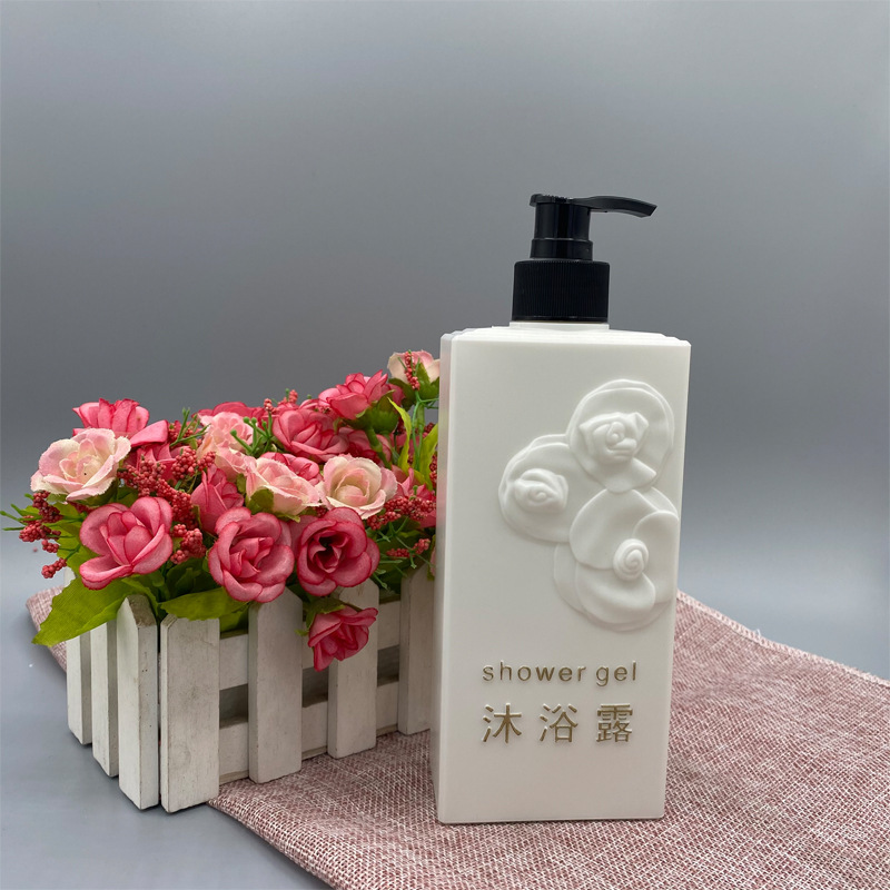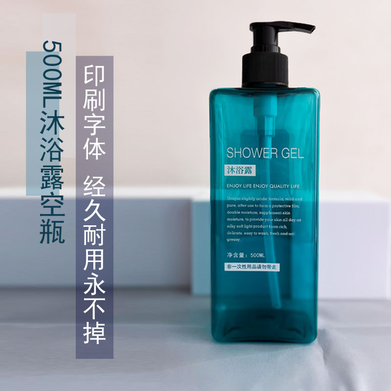 • 500ML 정사각형 병 투명 파란색 인쇄 샤워 젤 글꼴