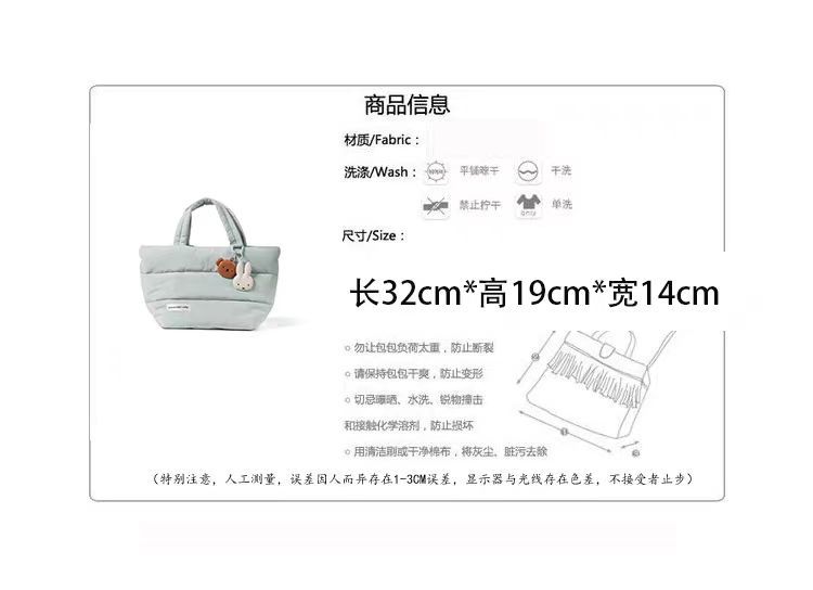 미피 토끼 미피 조인트 다운 코튼 패딩 코트 토트 백 대학 스타일 대용량 캐주얼 어깨 핸드 크로스 바디 백