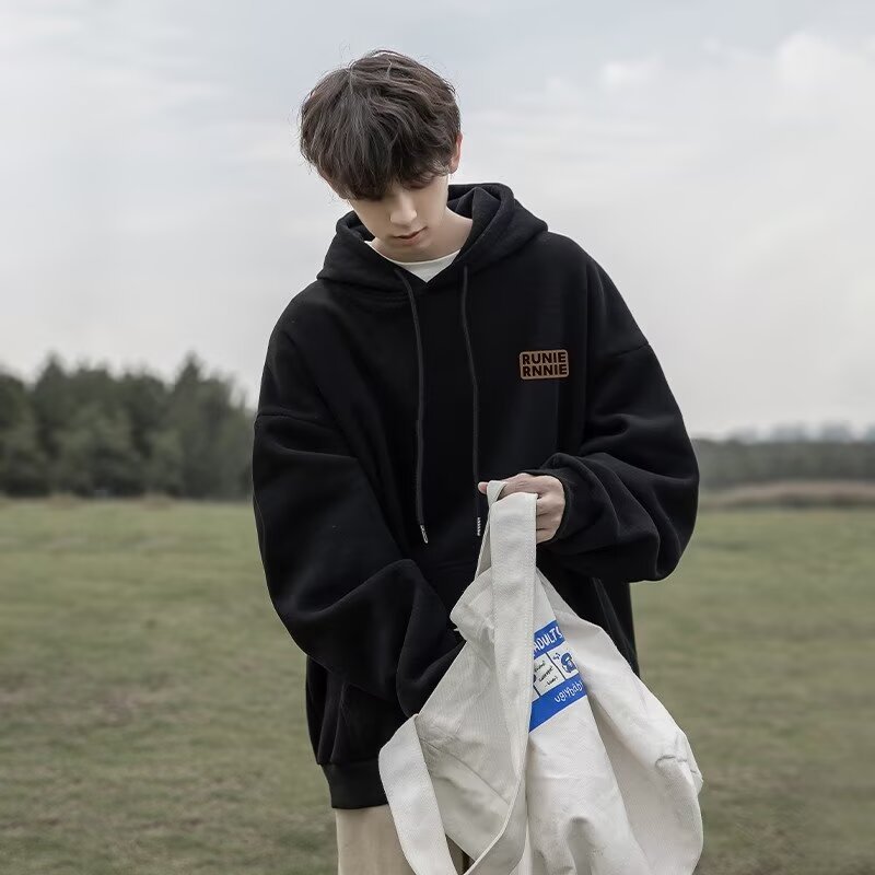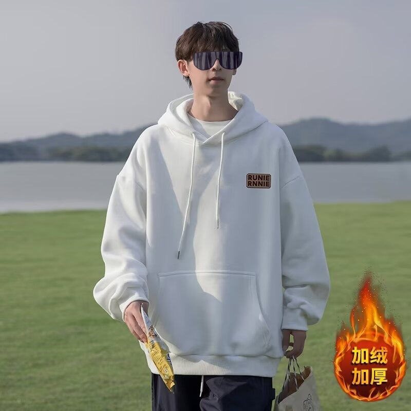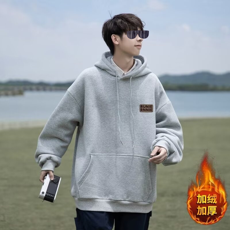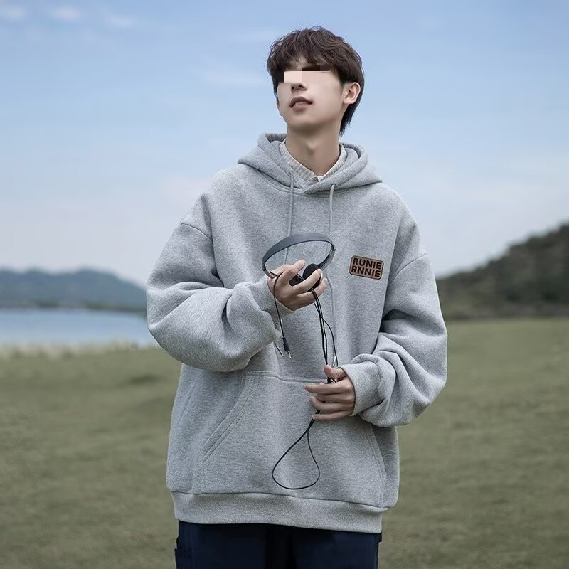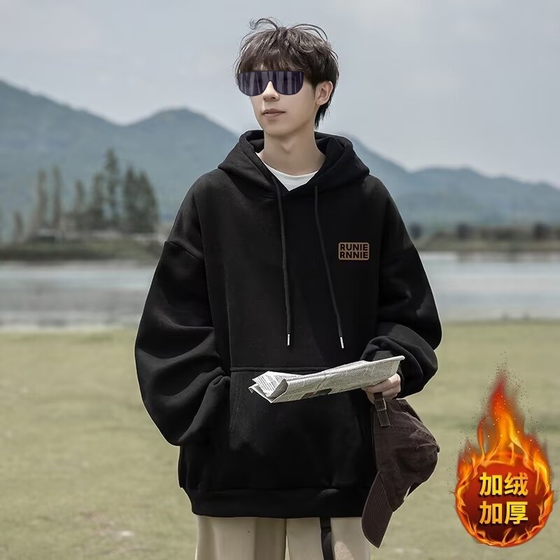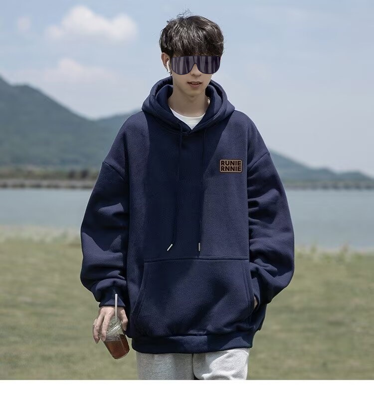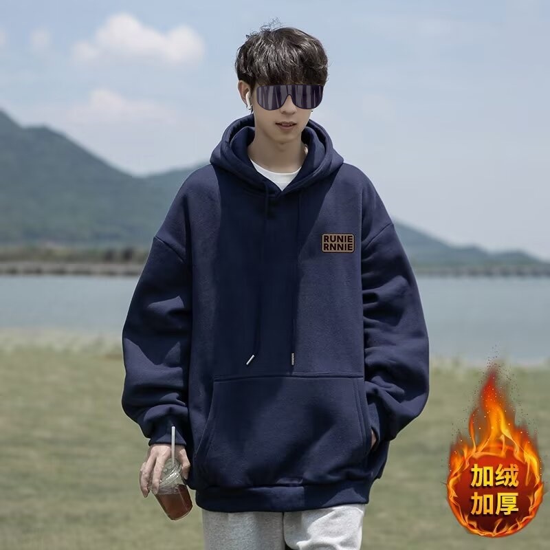 네이비 블루 후드 티셔츠 남성 봄, 가을 2024 새로운 트렌디 브랜드 헤비 겨울 스타일 벨벳 두꺼운 루즈 자켓스토어 가기