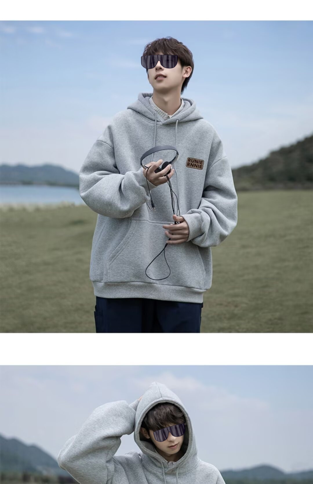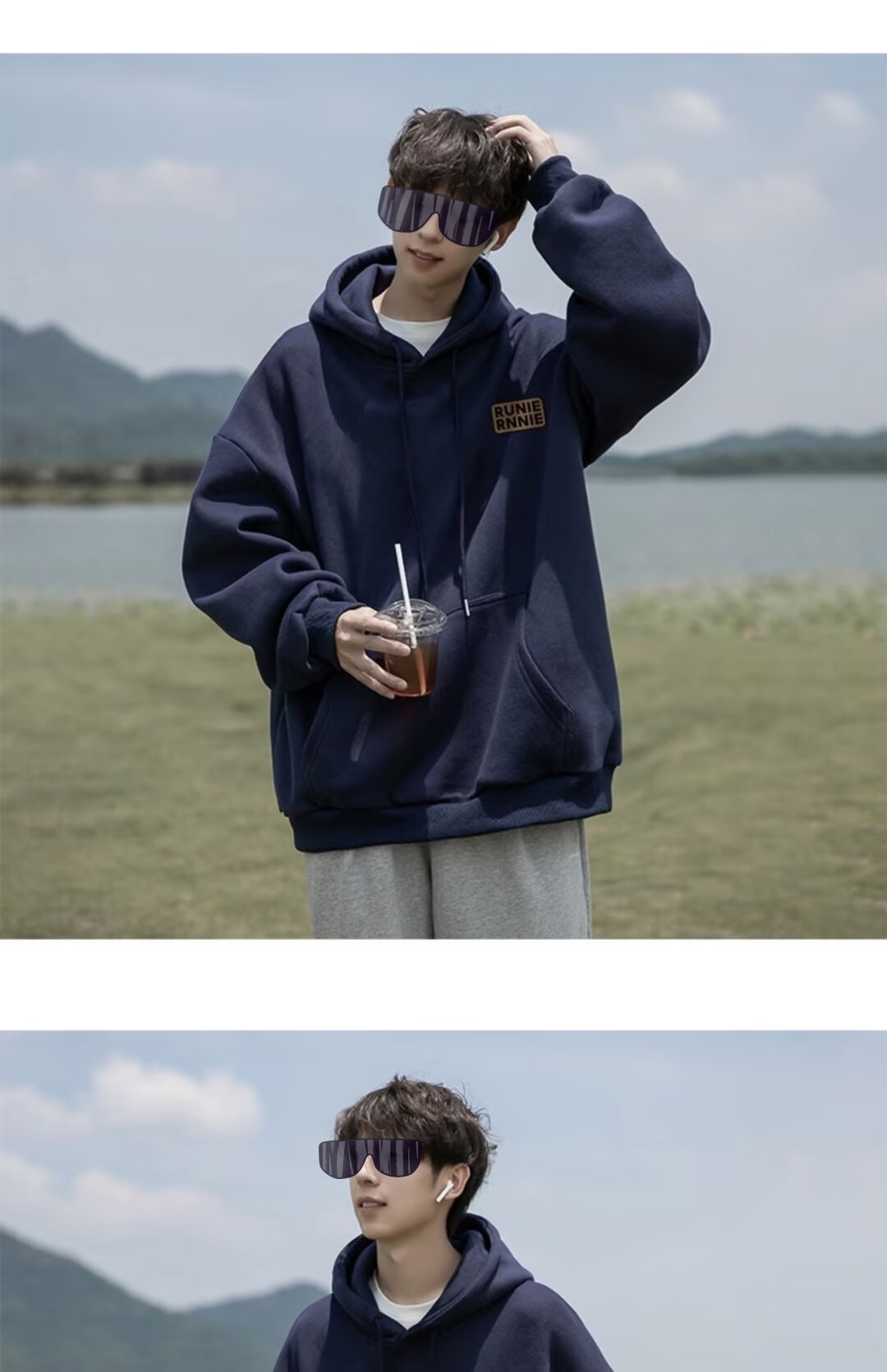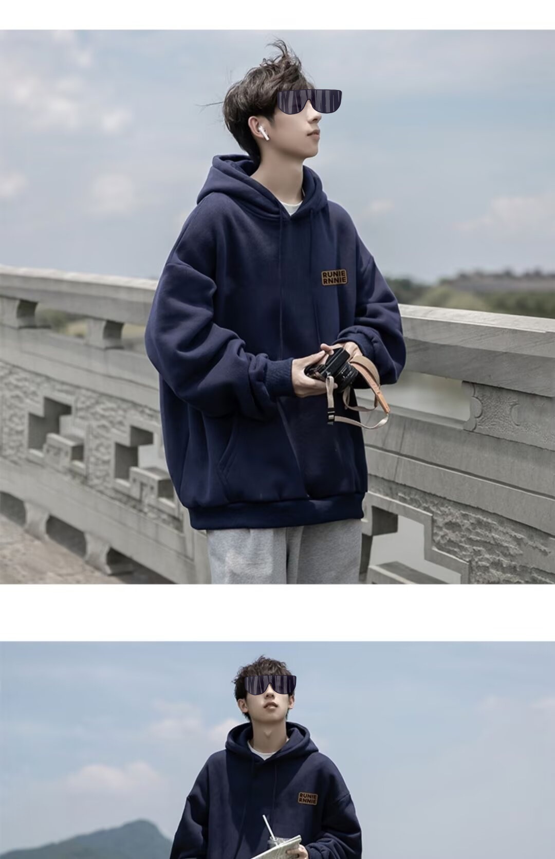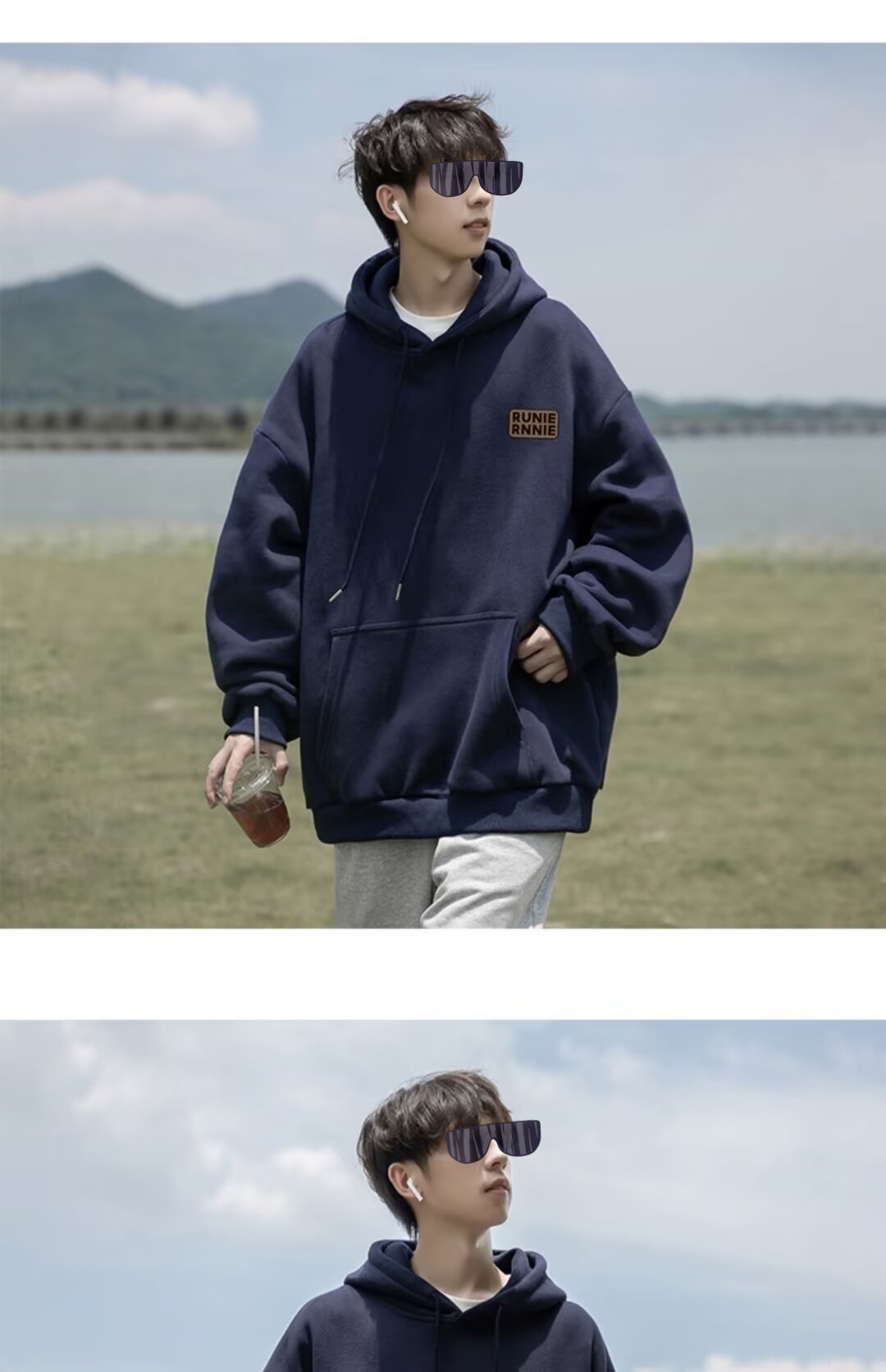 네이비 블루 후드 티셔츠 남성 봄, 가을 2024 새로운 트렌디 브랜드 헤비 겨울 스타일 벨벳 두꺼운 루즈 자켓스토어 가기