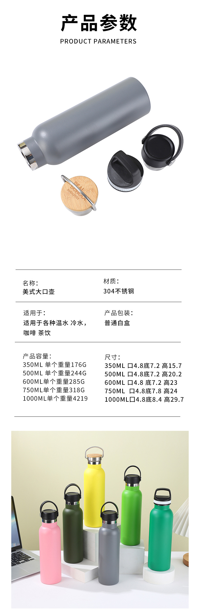 미국 스타일의 큰 입 휴대용 304 스테인리스 보온병 스포츠 물병 야외 승마 물병 휴대용 등산 공간 물병