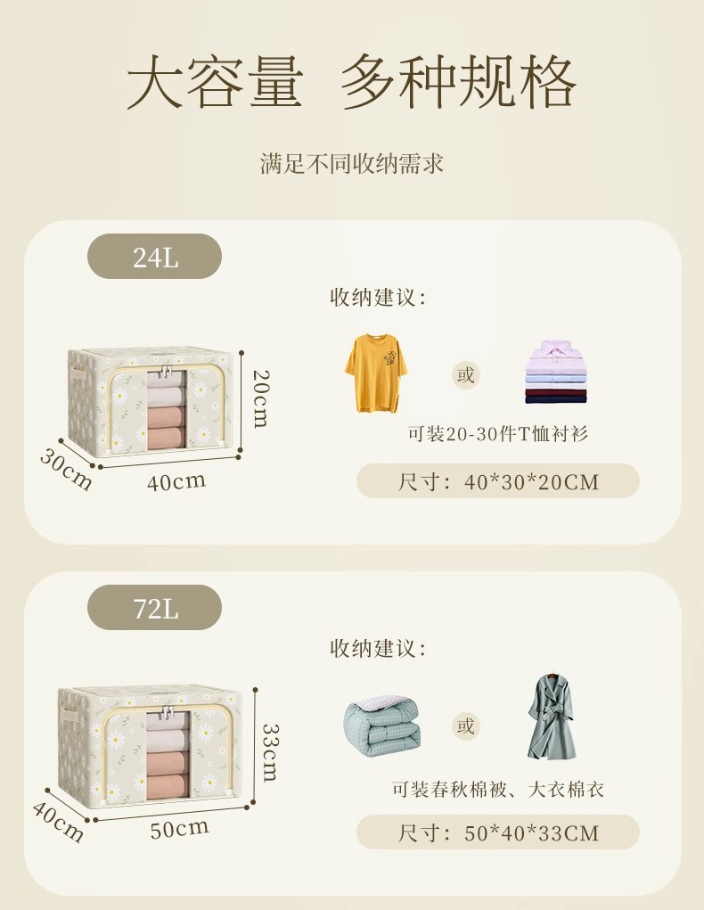 • 72L (50*40*33cm)은 봄, 가을 이불/코트/스웨터를 담을 수 있습니다.