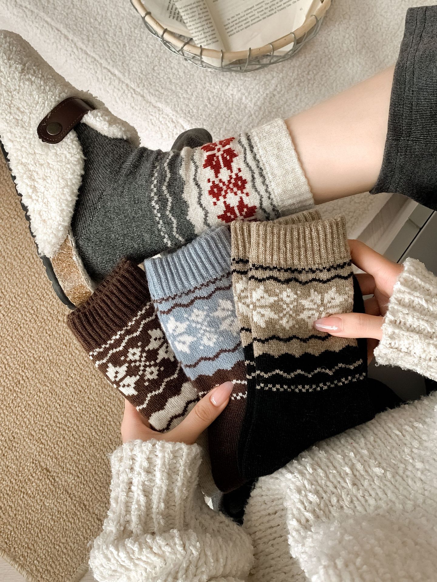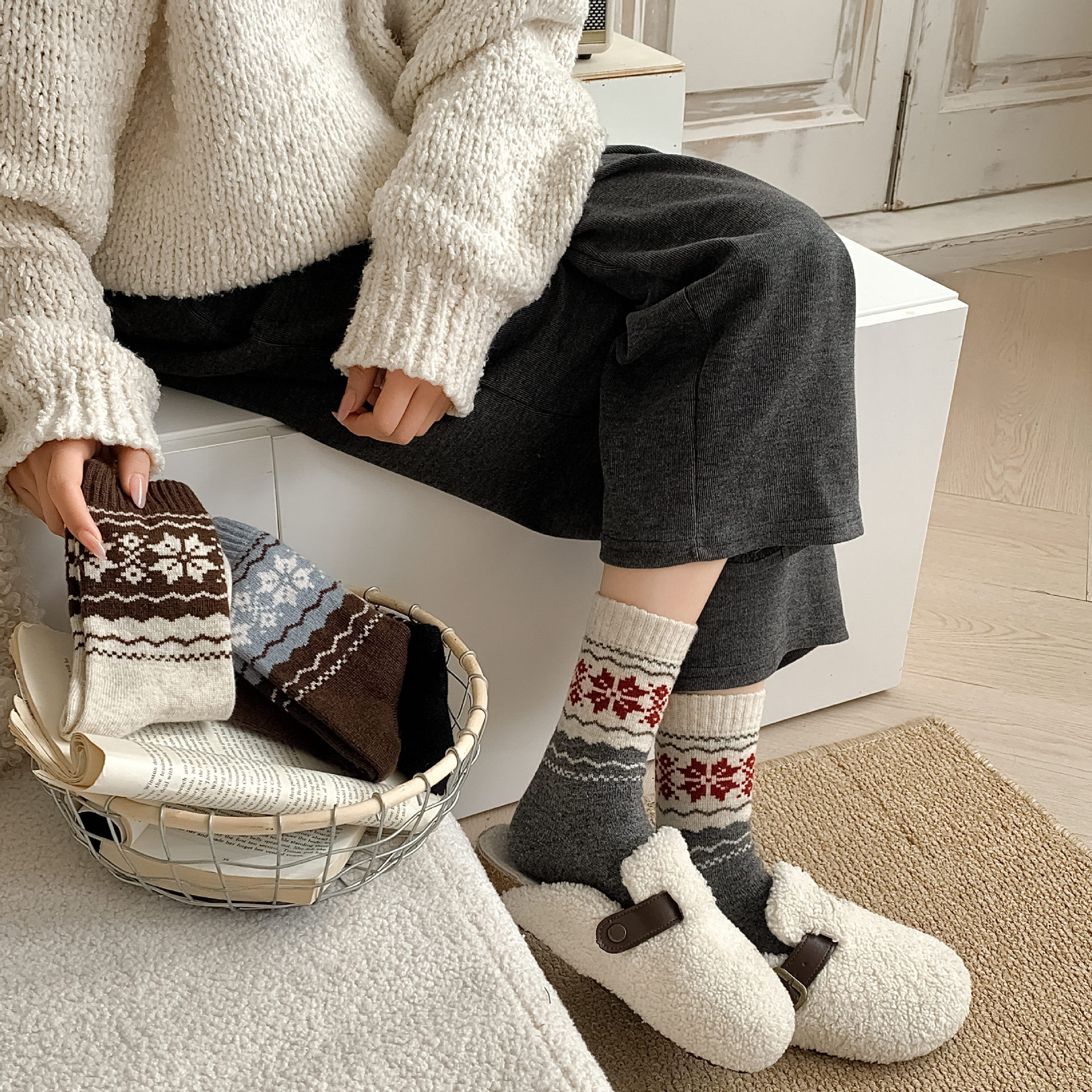 가을 섬 여성의 날과 스타일을위한 가을과 겨울 양말 ~ 레트로 명암 양모 양말 두껍게 만든 따뜻한 중간 더미 양말스토어 가기