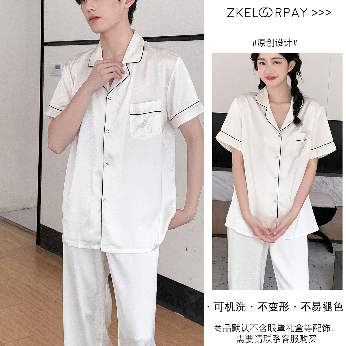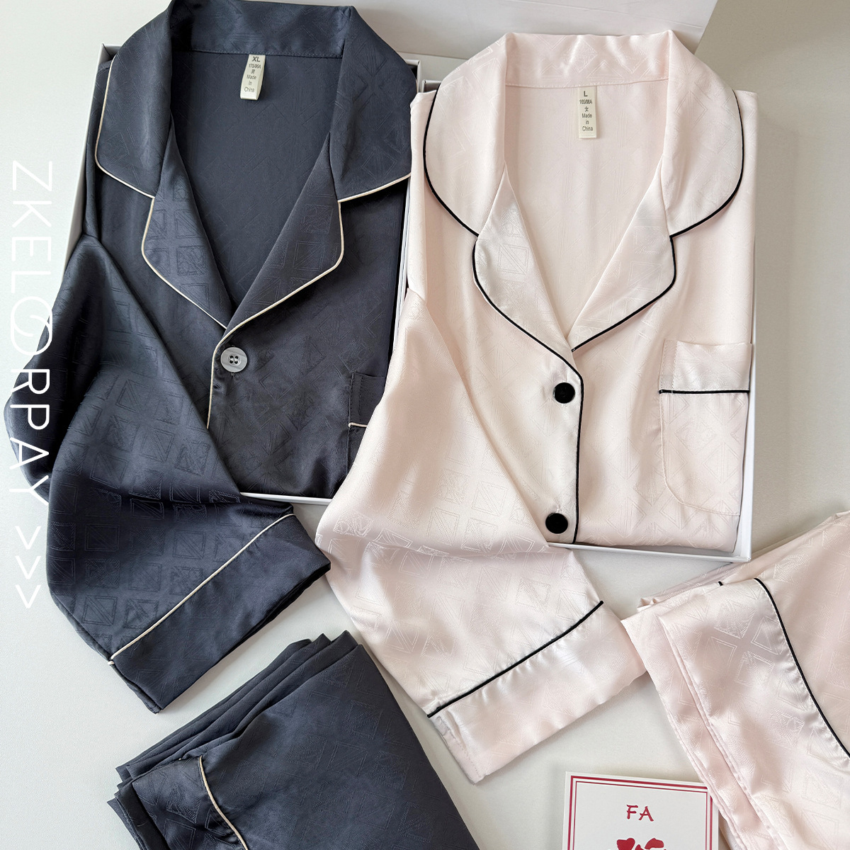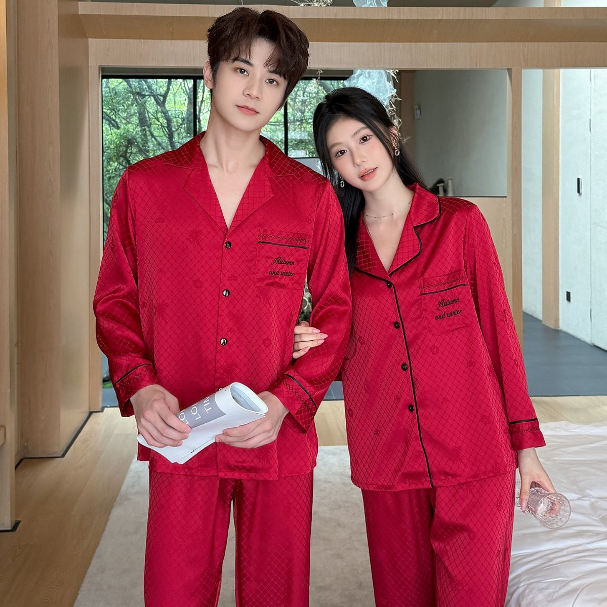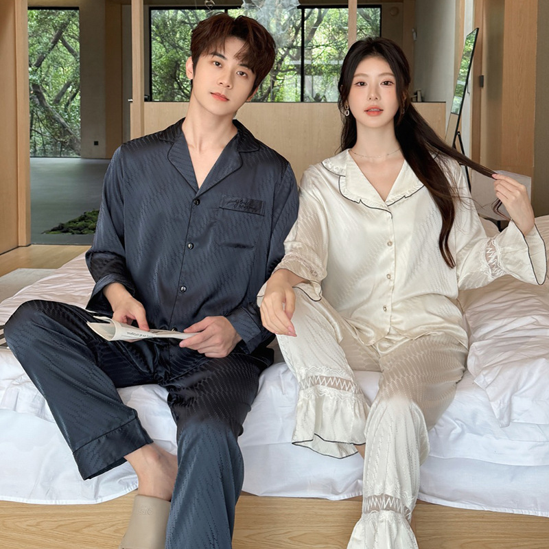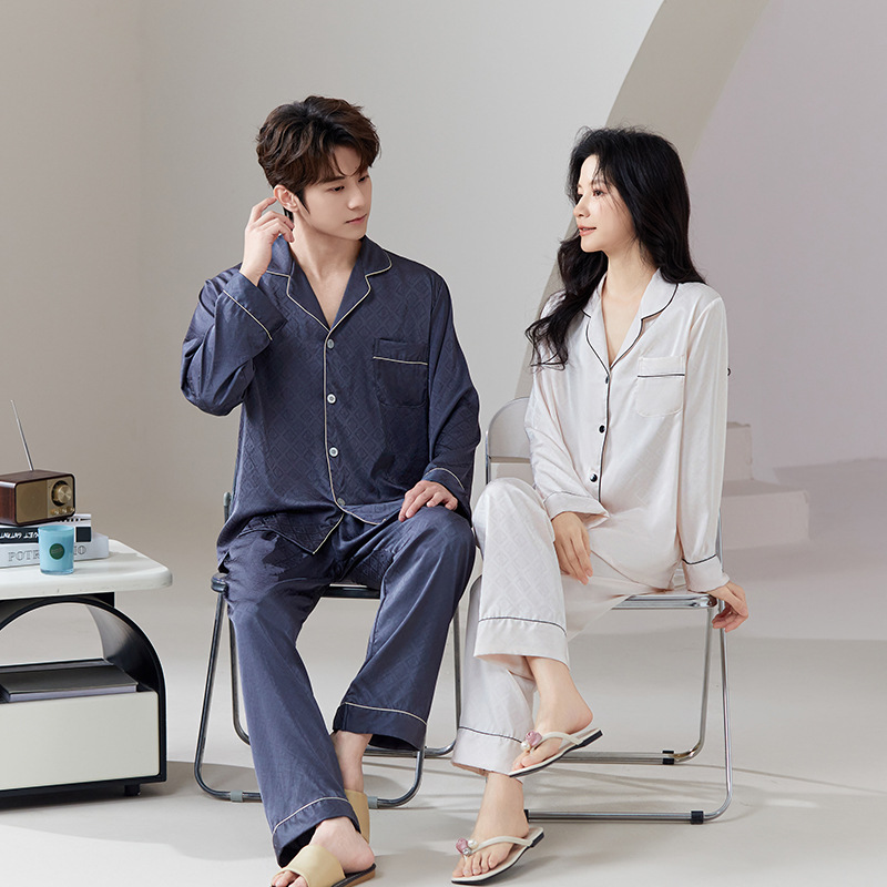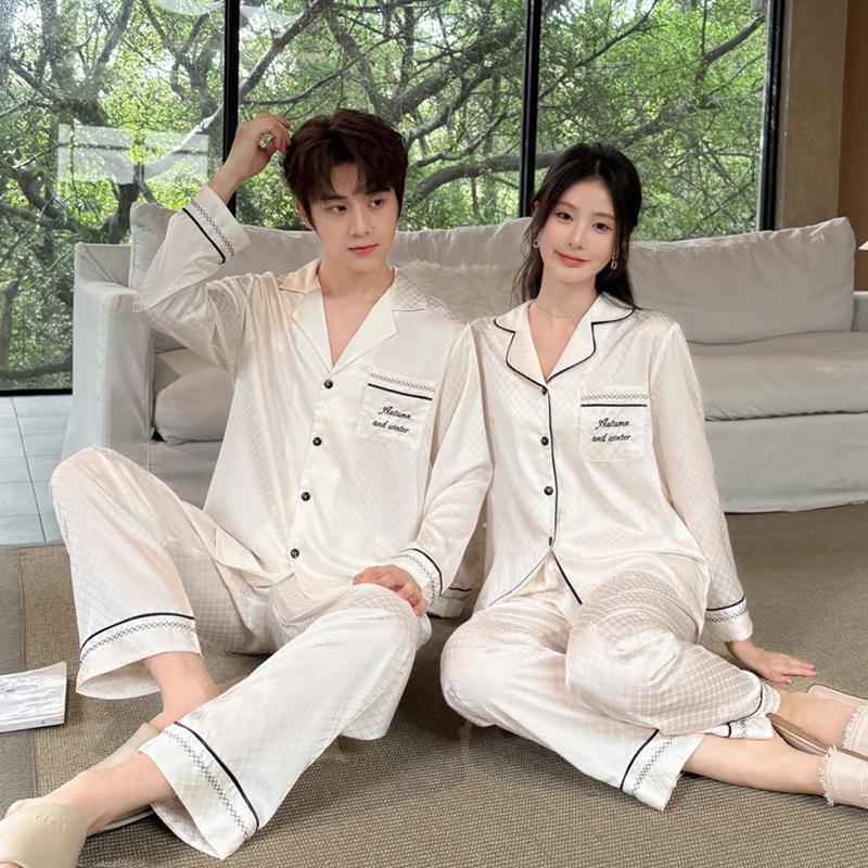 봄과 가을 새로운 높은 고정 입장 럭셔리 모조 실크 긴 소매 아이스 실크 커플 파자마 여성 하이 엔드 센스 홈 의류 남성 도매