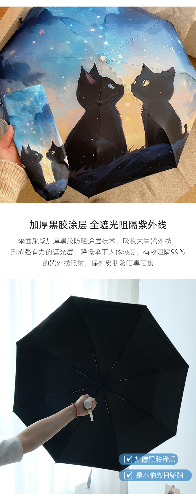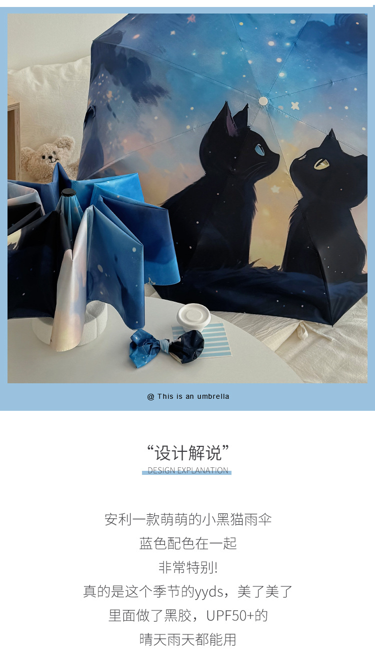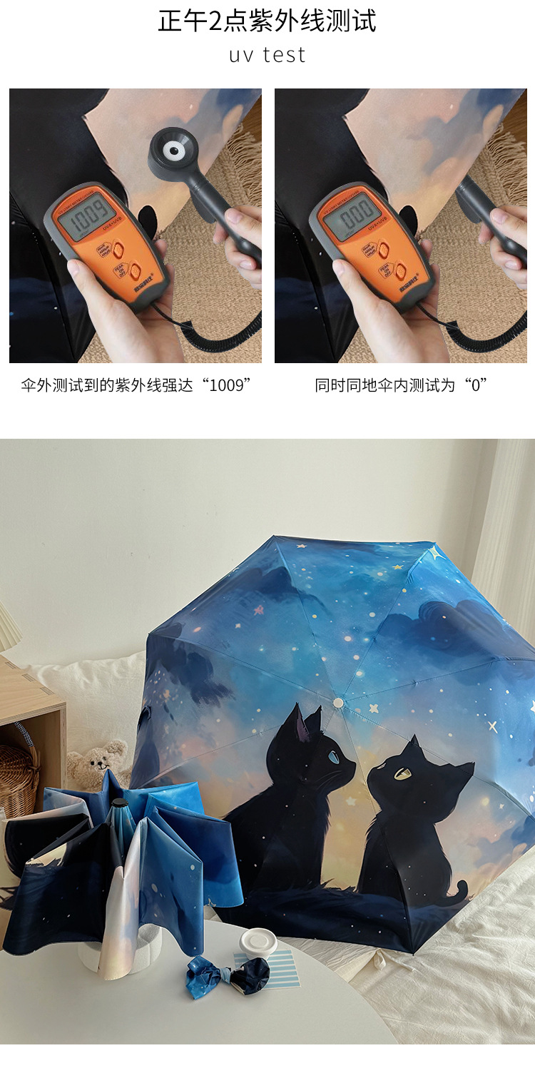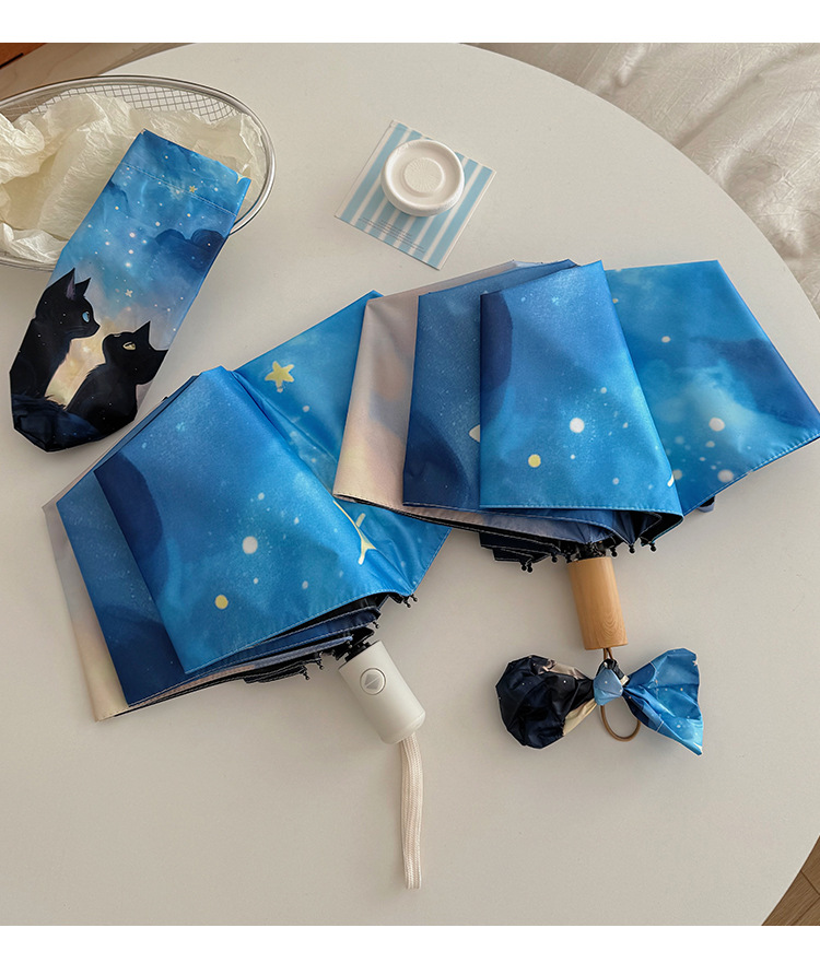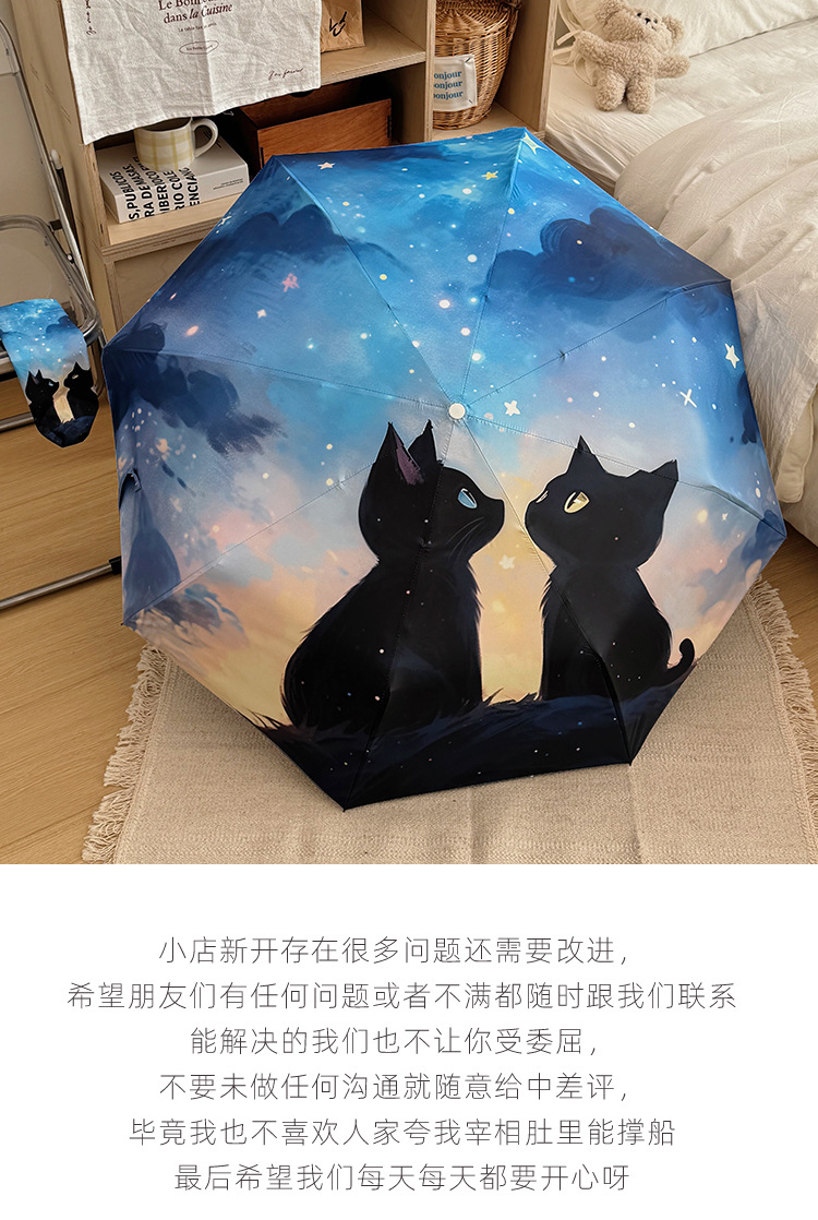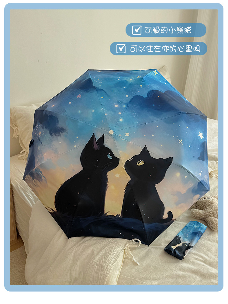 귀여운 만화 커플 검은 고양이 접히는 우산 햇빛과 비 이중 사용 태양 보호 자외선 보호 태양 우산 자동 파라솔