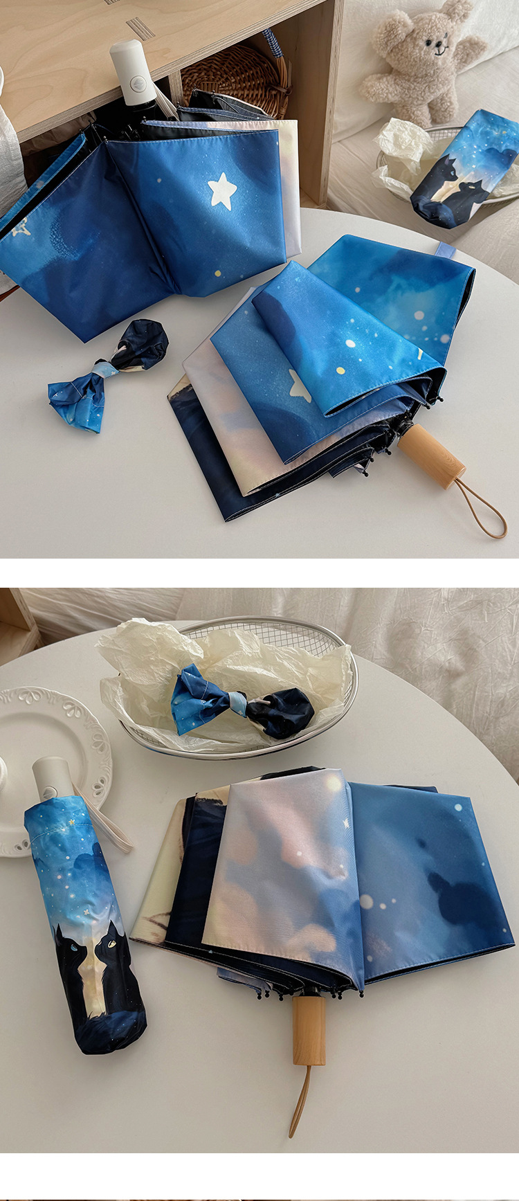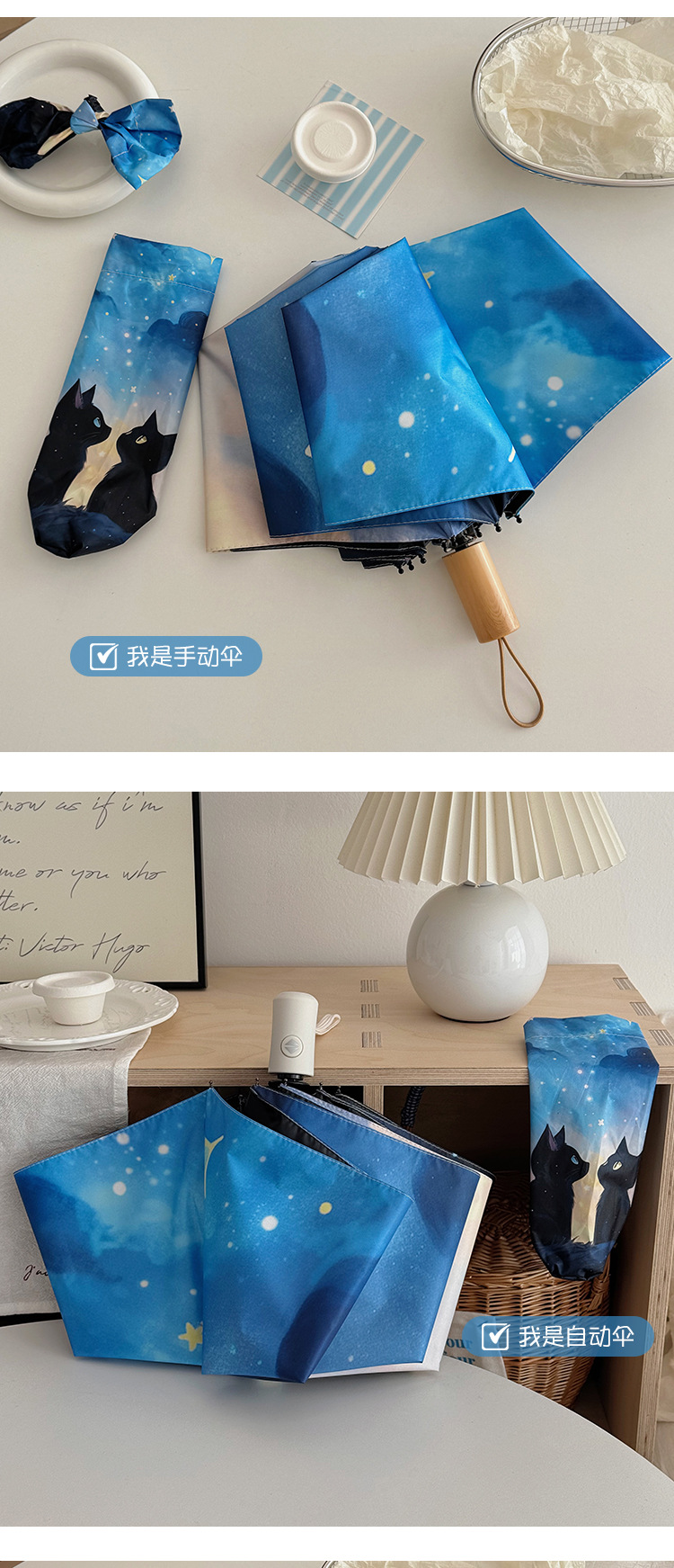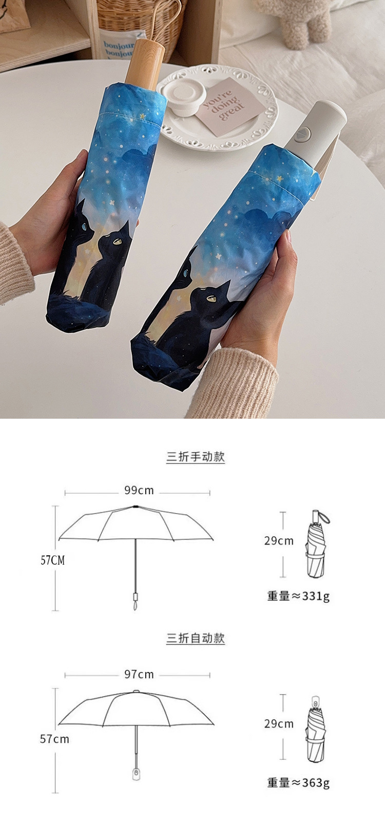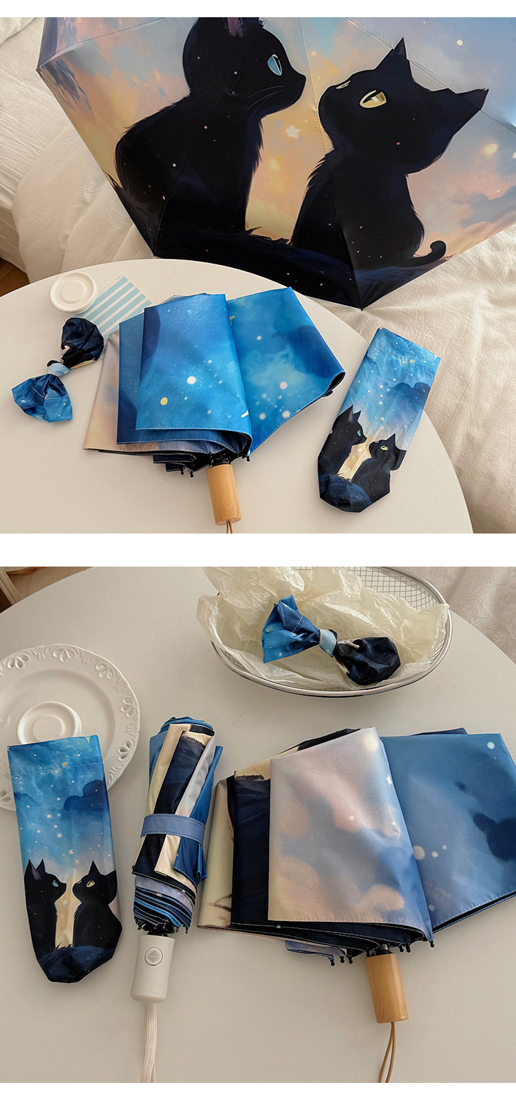 귀여운 만화 커플 검은 고양이 접히는 우산 햇빛과 비 이중 사용 태양 보호 자외선 보호 태양 우산 자동 파라솔