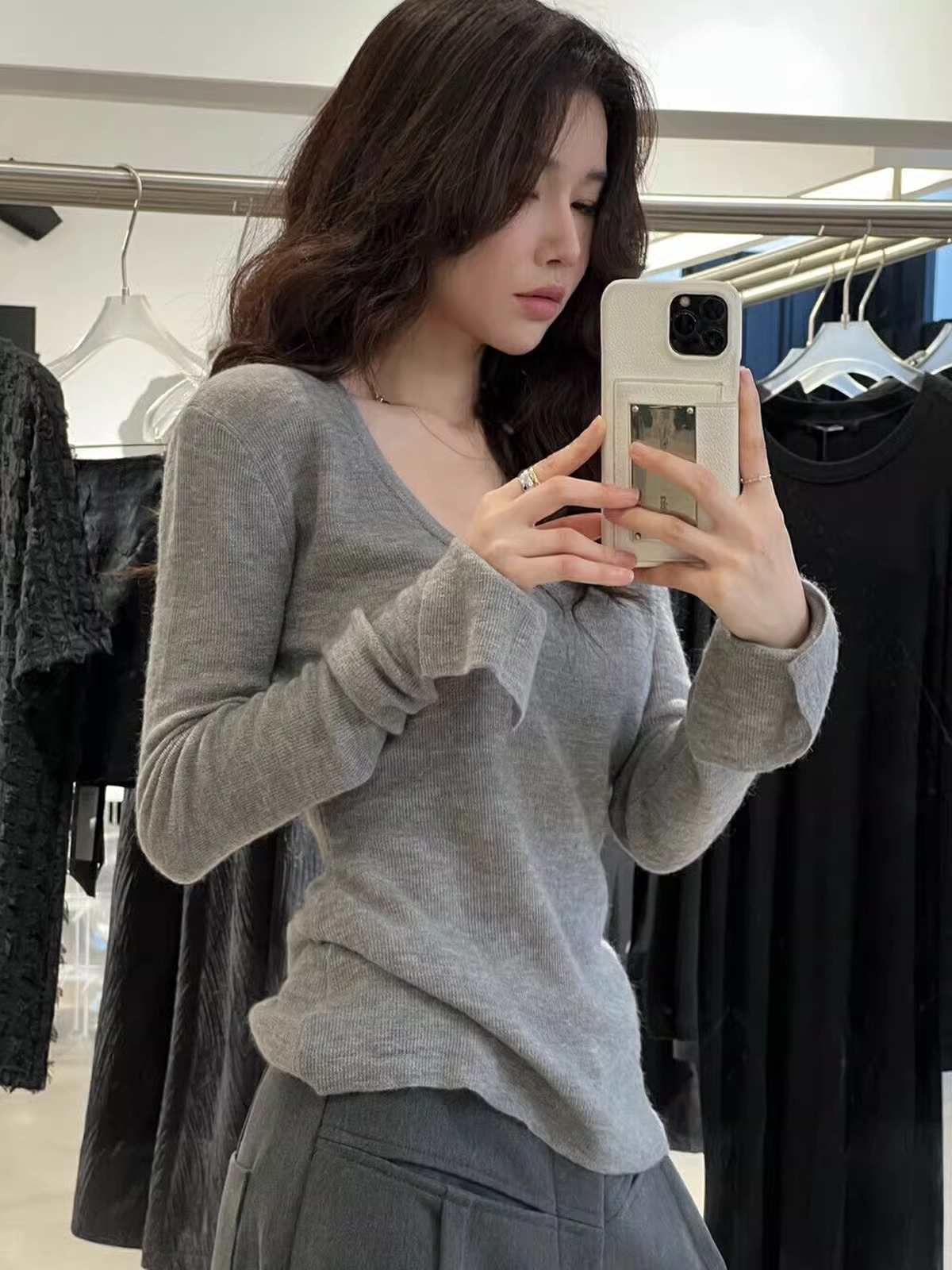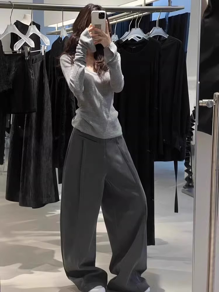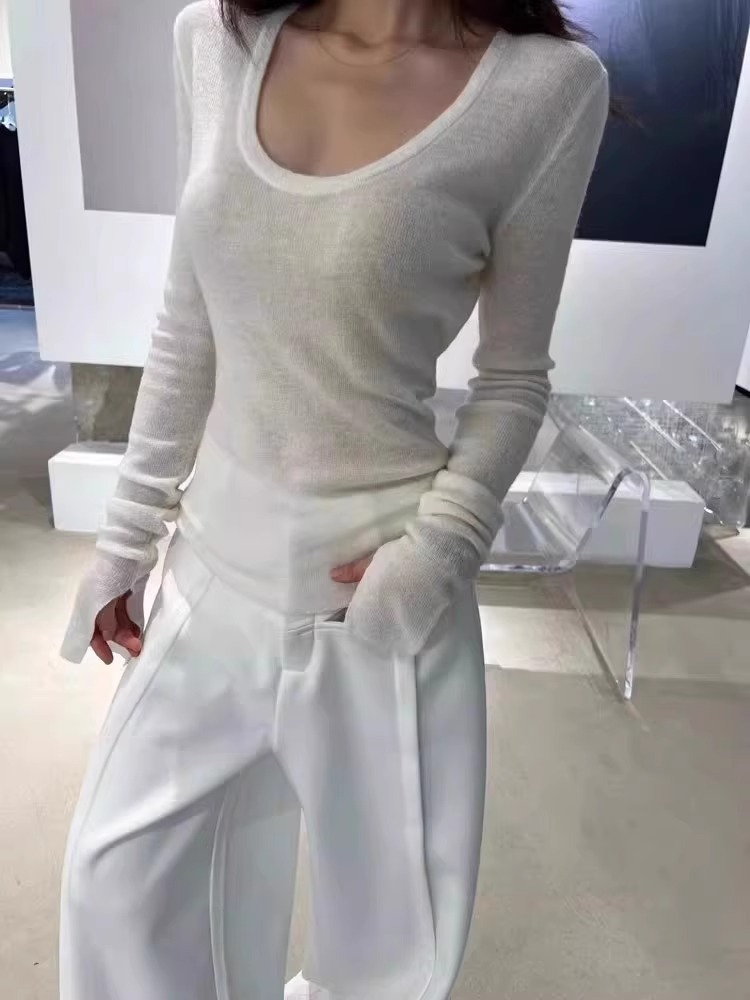 여성을위한 미니멀리스트 스타일 U 넥 벨 슬리브 셔츠 2025 봄 슬림 피트 심플 이너 탑 니트 스웨터 다용도스토어 가기