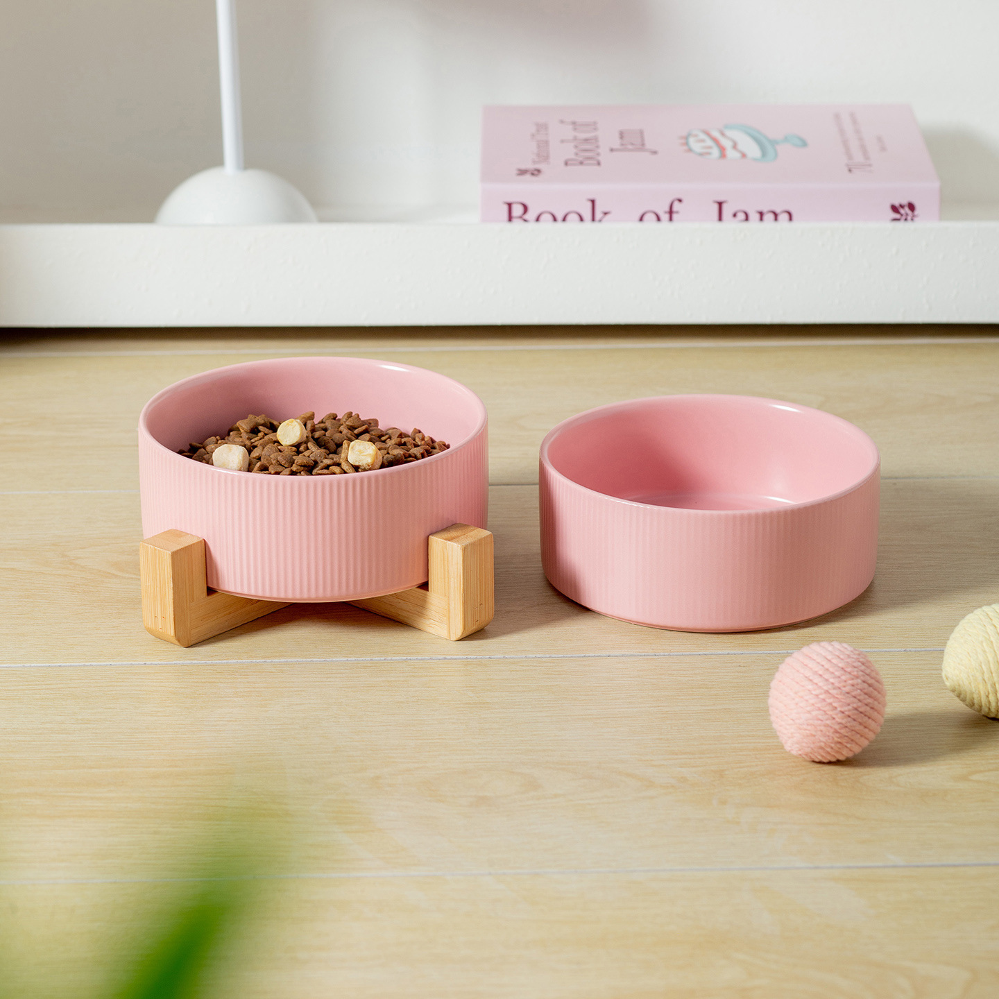 • 줄무늬 직구 그릇 [매트 핑크] + 이중 나무 스탠드