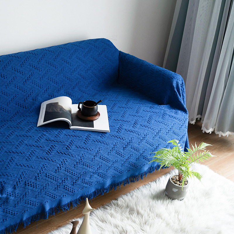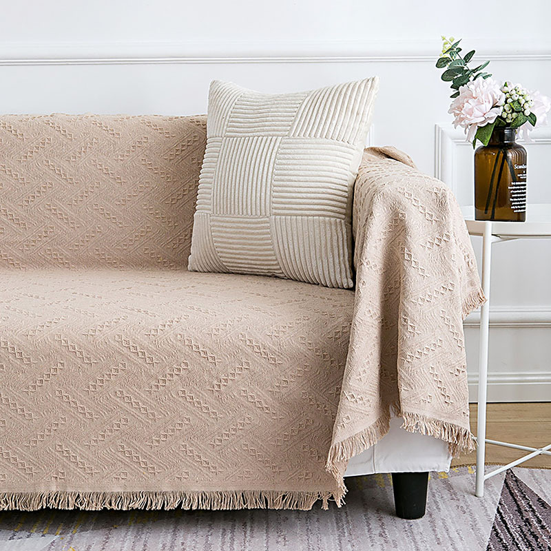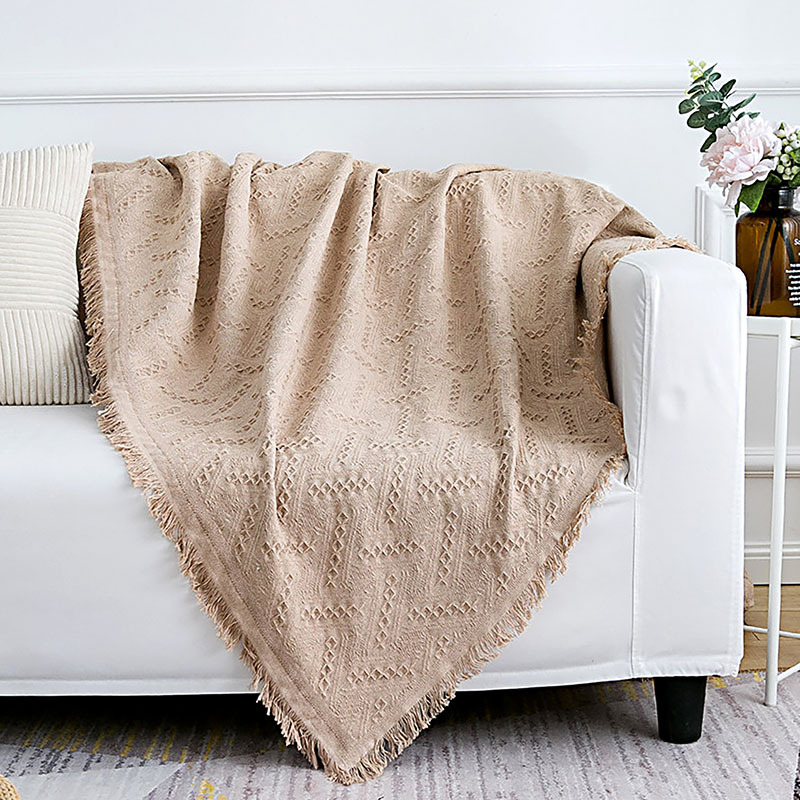 精美的提花格子图案,温暖的米色,浪漫轻柔.本款为棉线勾织完成,做工精美,这款毯子有一些厚度,可以做为沙发巾、沙发罩,桌布等多功能毯。