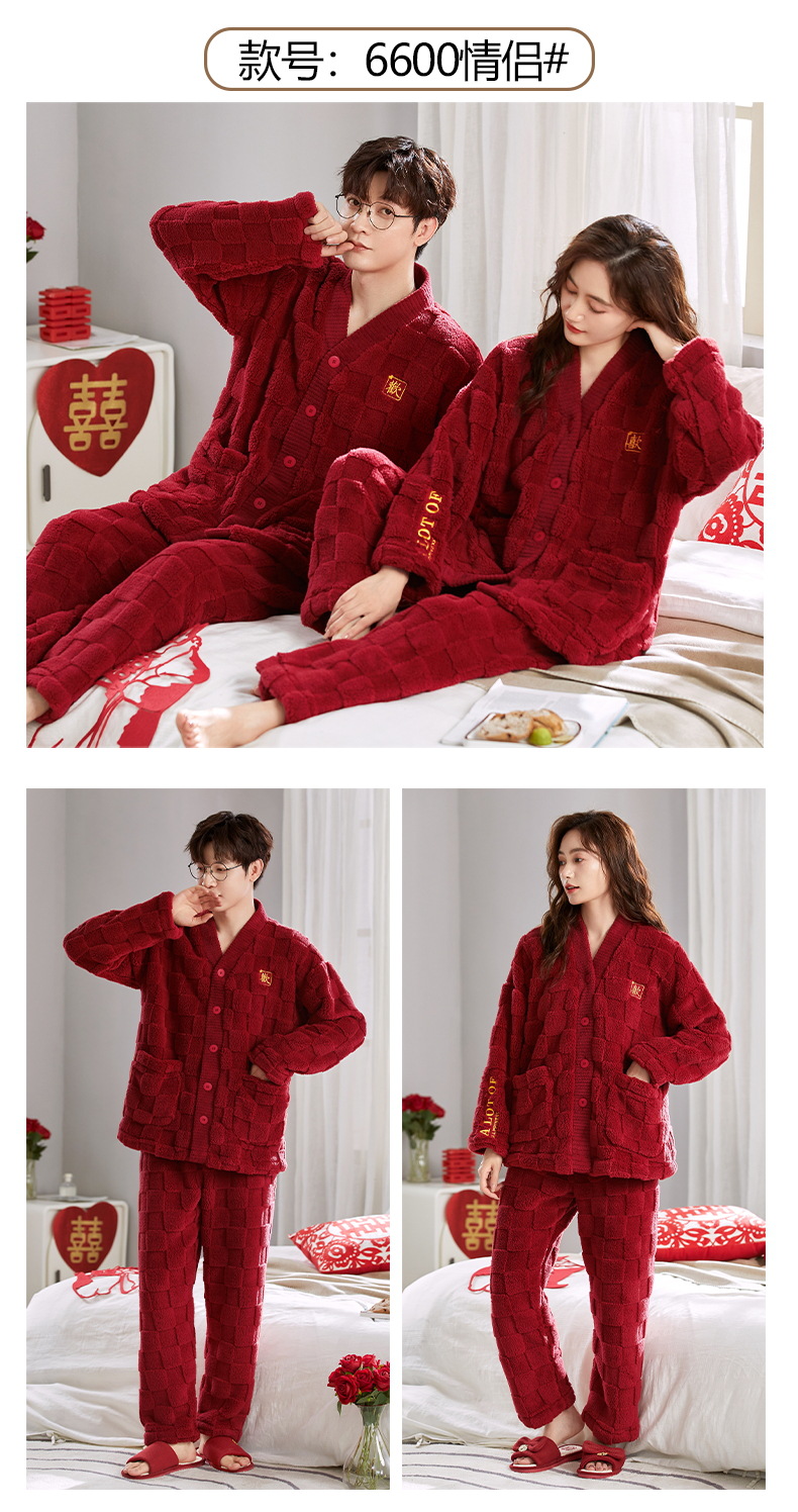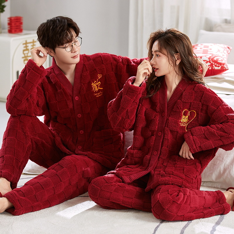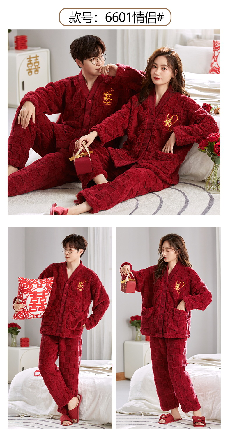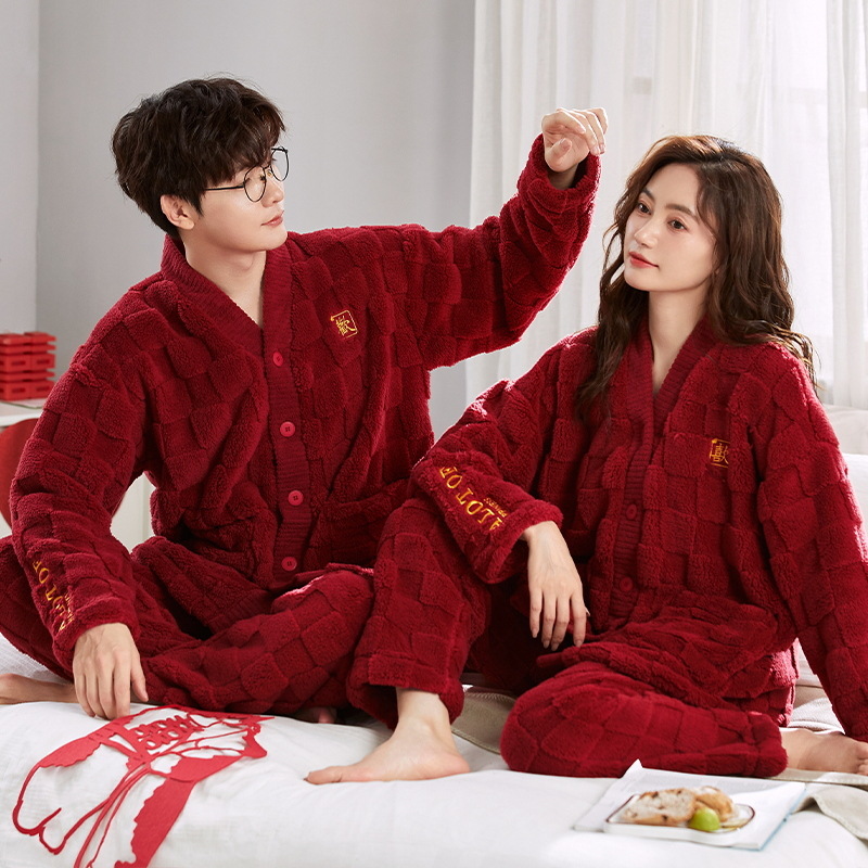 산호 벨벳 커플 잠옷 여성의 가을과 겨울 두꺼운 빨간 결혼식 세트 겨울 남자 기모노 홈 옷스토어 가기