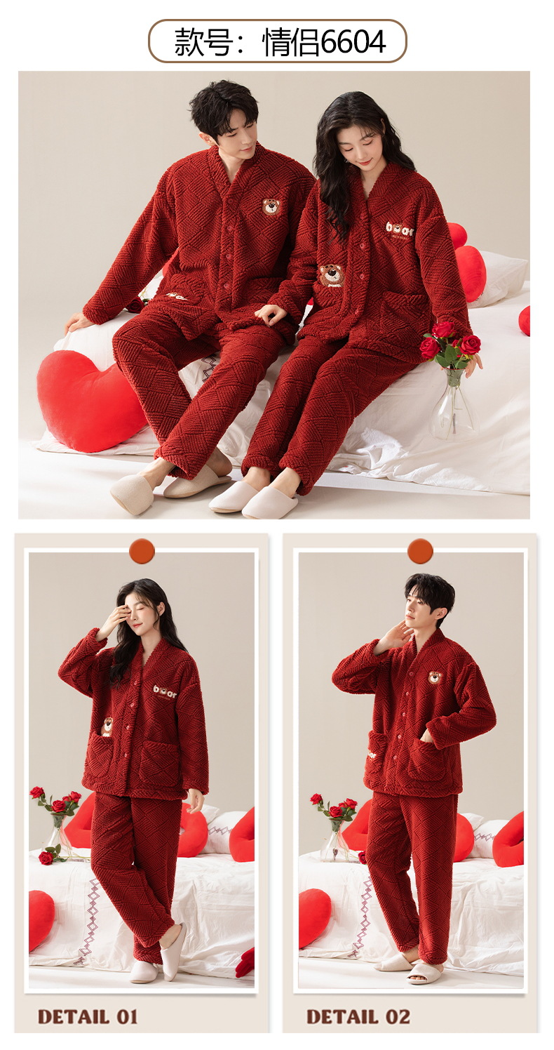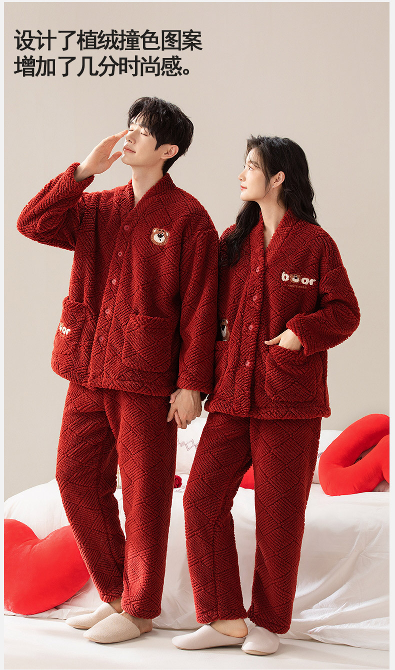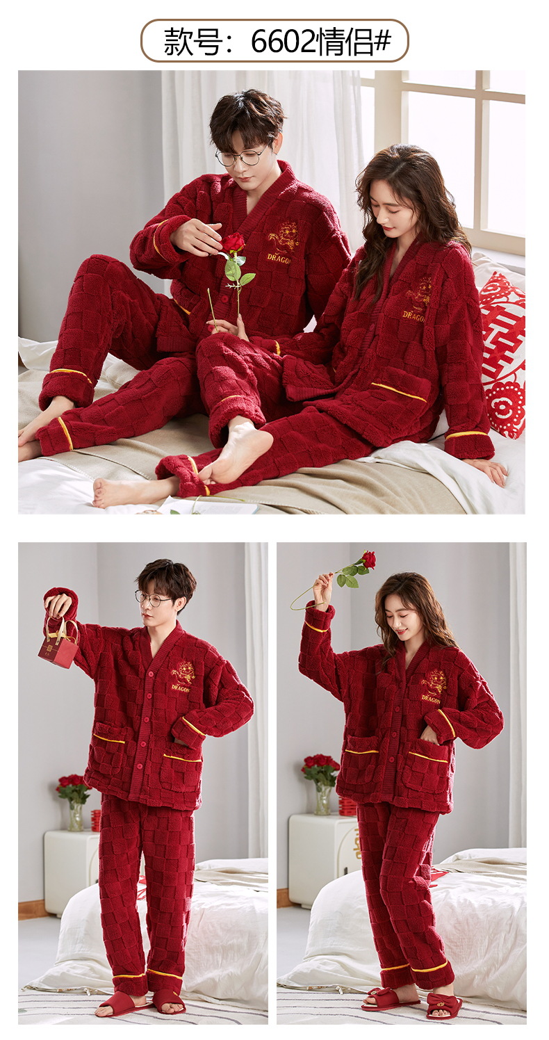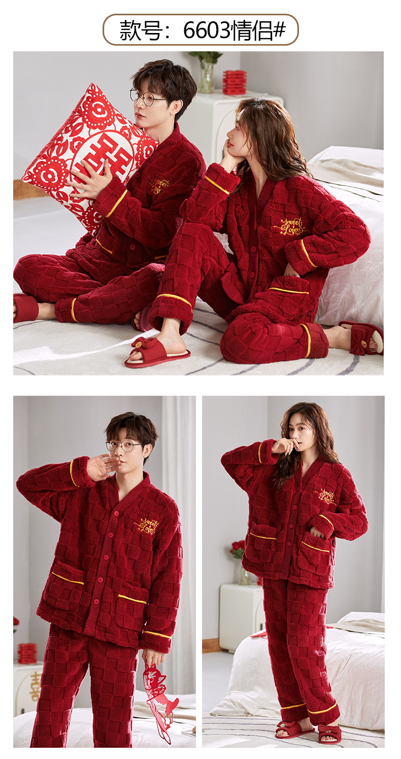 산호 벨벳 커플 잠옷 여성의 가을과 겨울 두꺼운 빨간 결혼식 세트 겨울 남자 기모노 홈 옷스토어 가기