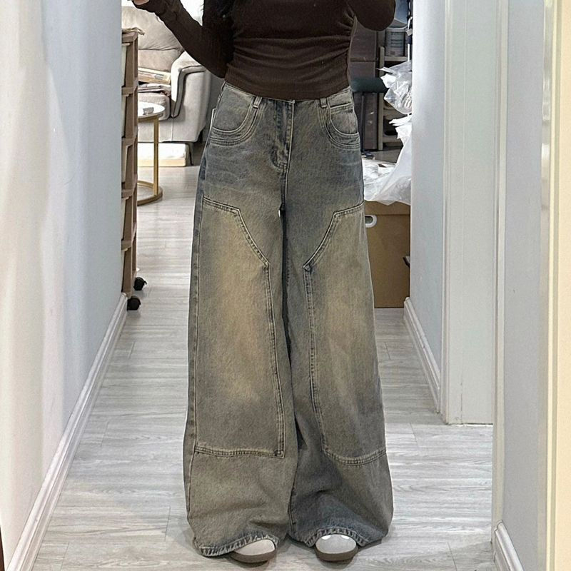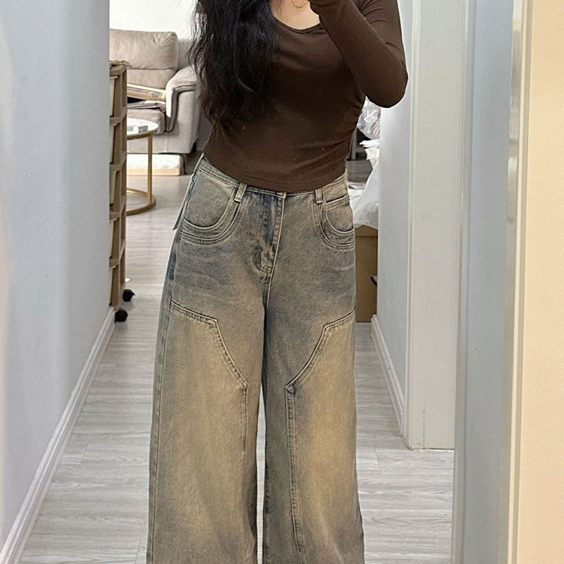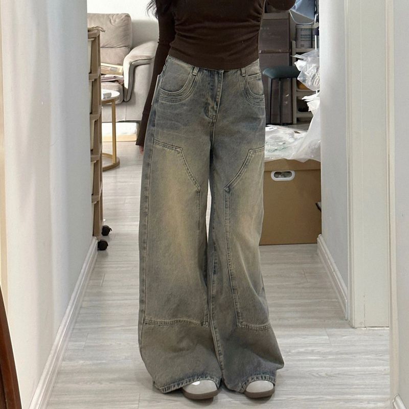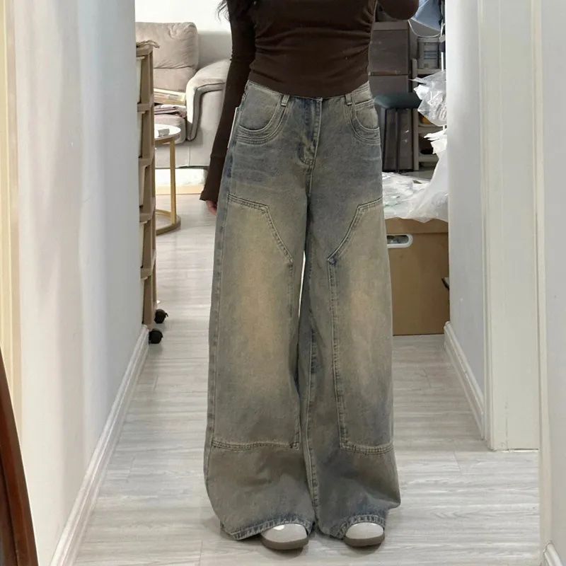아메리칸 스타일 레트로 오래된 스티칭 높은 허리 넓은 다리 청바지 여성의 2024 새로운 느슨한 슬리밍 스트레이트 캐주얼 바지스토어 가기
