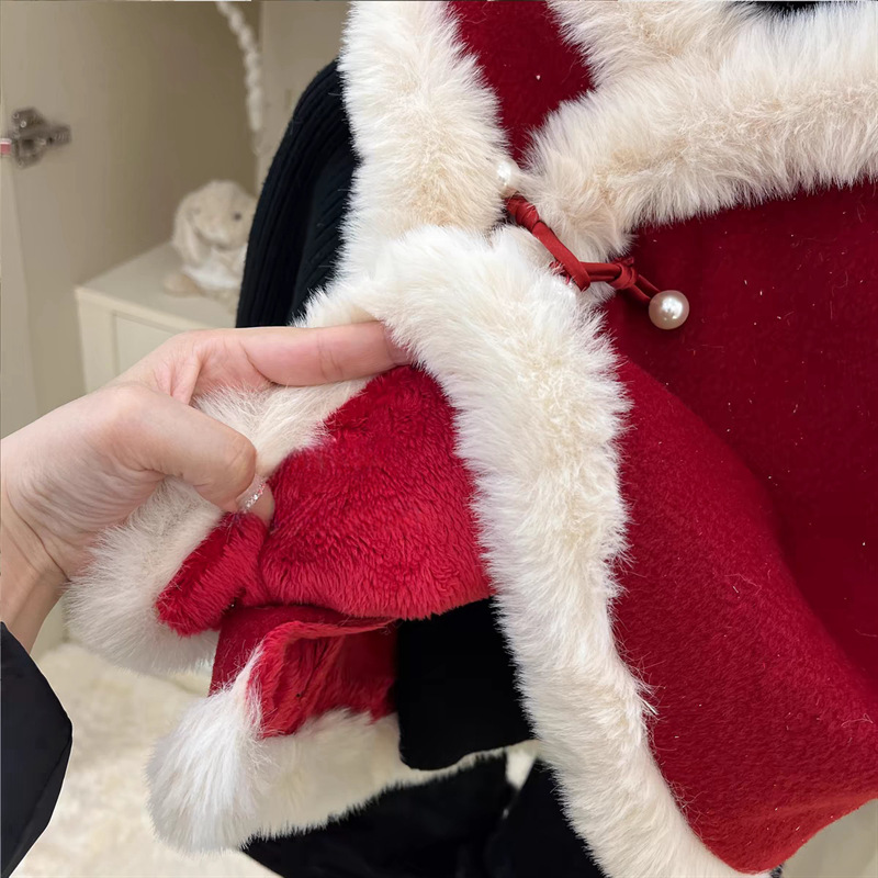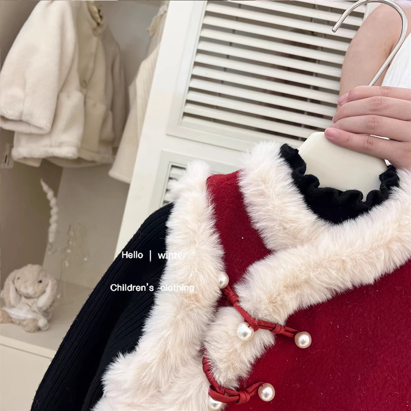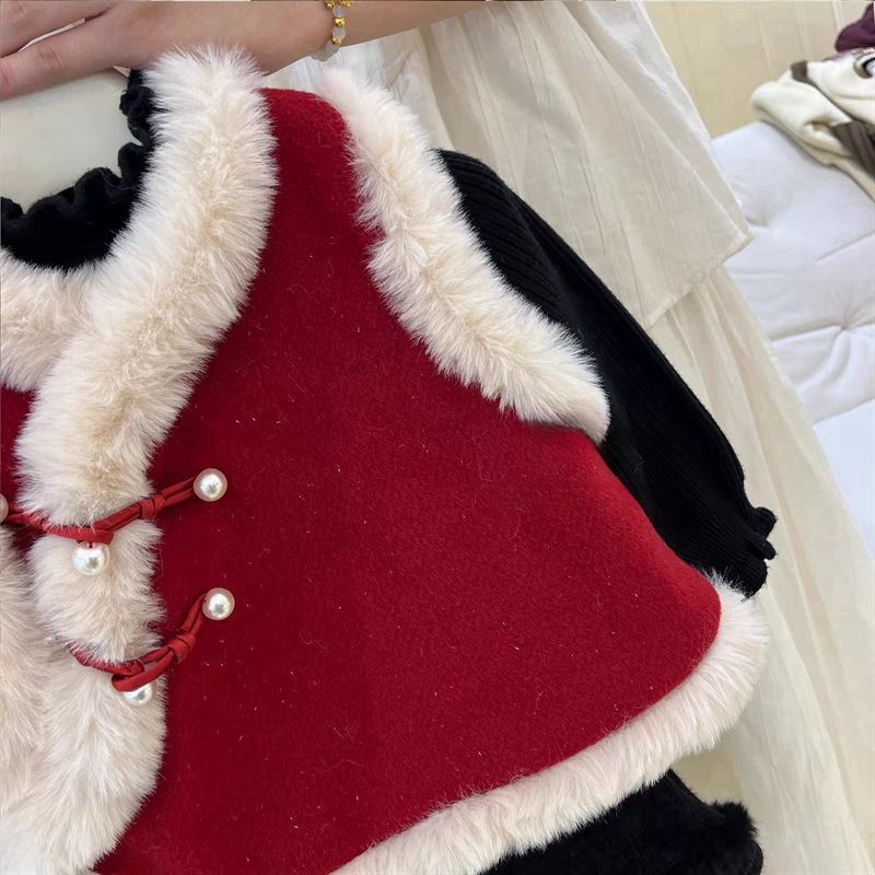 달콤한 소녀풍 단추 장식과 벨벳 안감이 있는 새로운 중국풍 빨간 조끼, 털소매로 새해맞이 축제 의상으로 입는 신상품