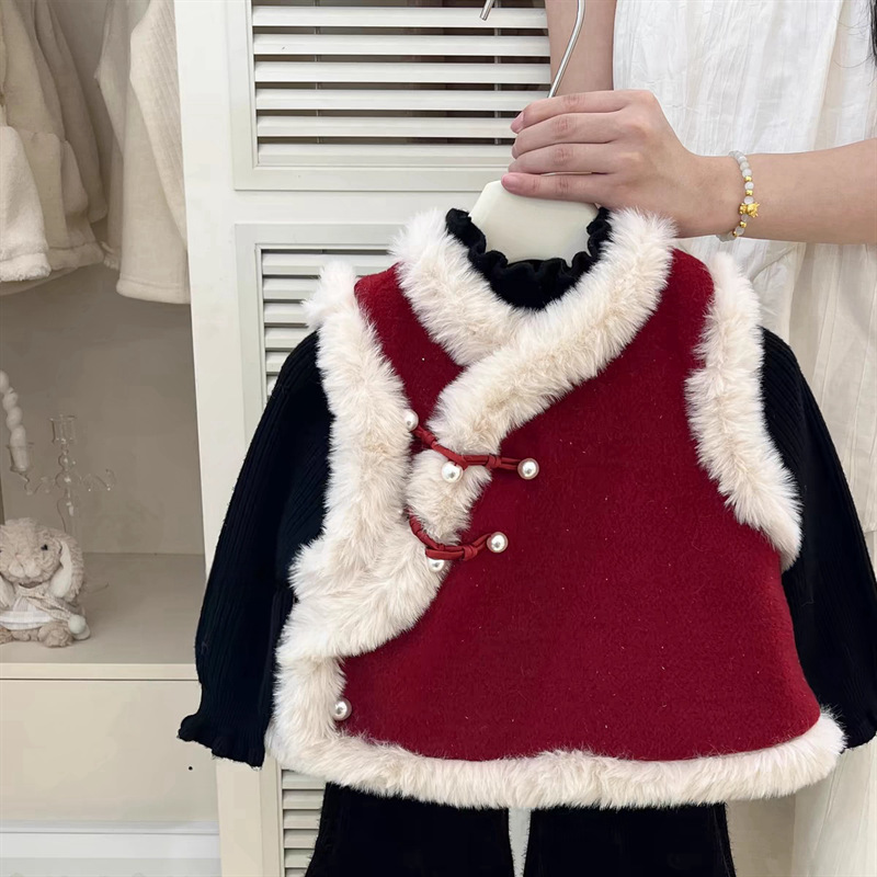 달콤한 소녀풍 단추 장식과 벨벳 안감이 있는 새로운 중국풍 빨간 조끼, 털소매로 새해맞이 축제 의상으로 입는 신상품스토어 가기