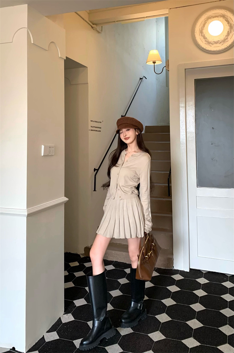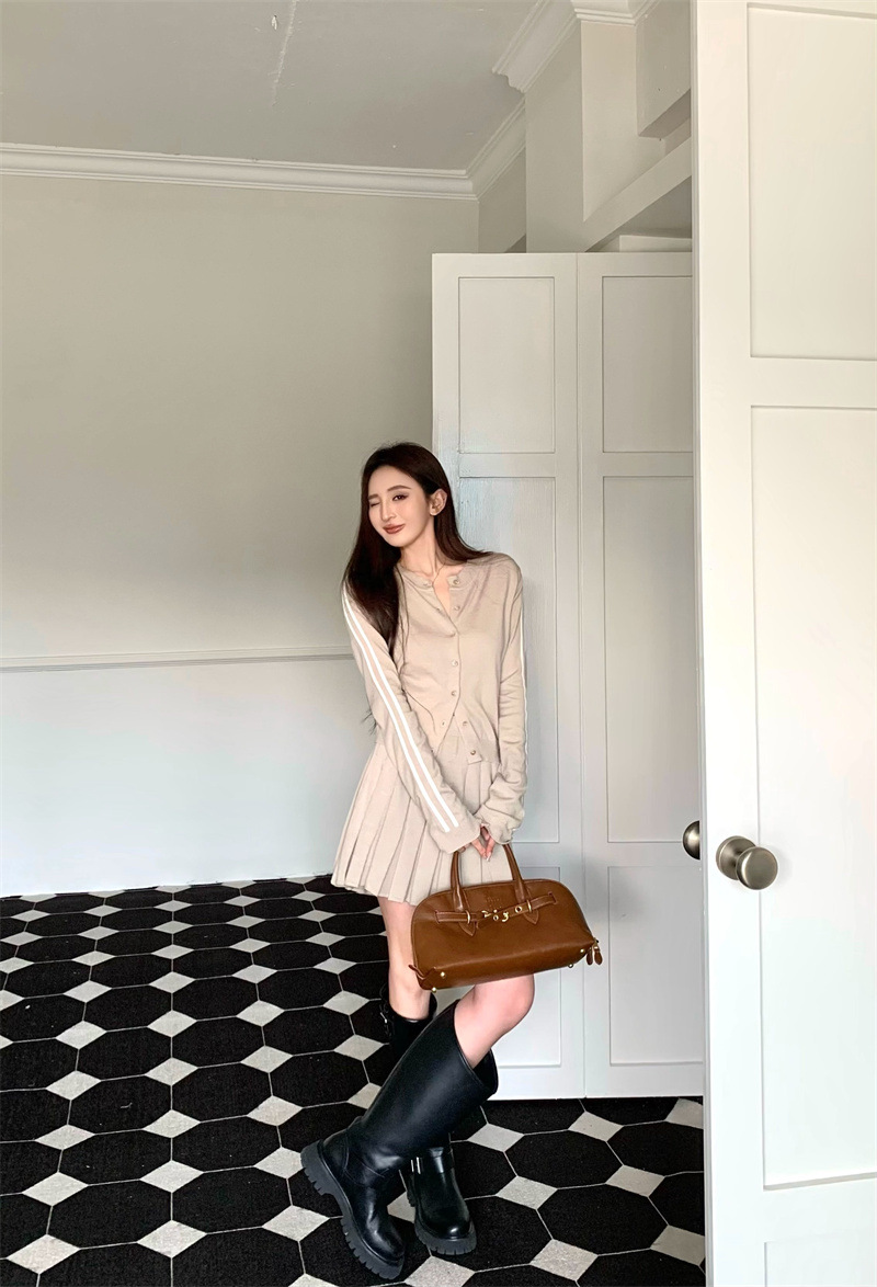 대학 스타일의 세트 하이 엔드 니트 카디건 여성 2025 봄 새로운 허리 니트 주름 치마 투피스 세트스토어 가기