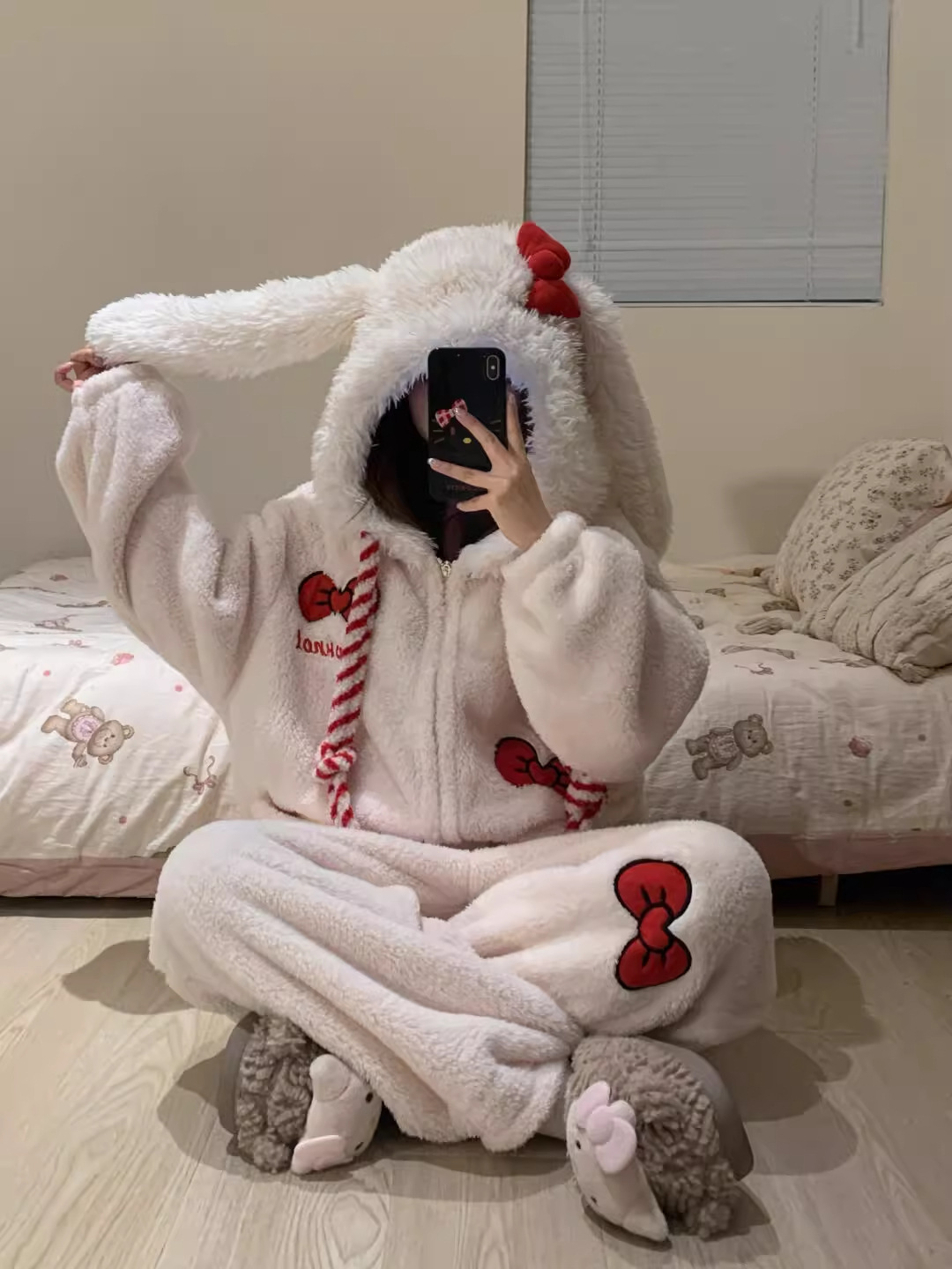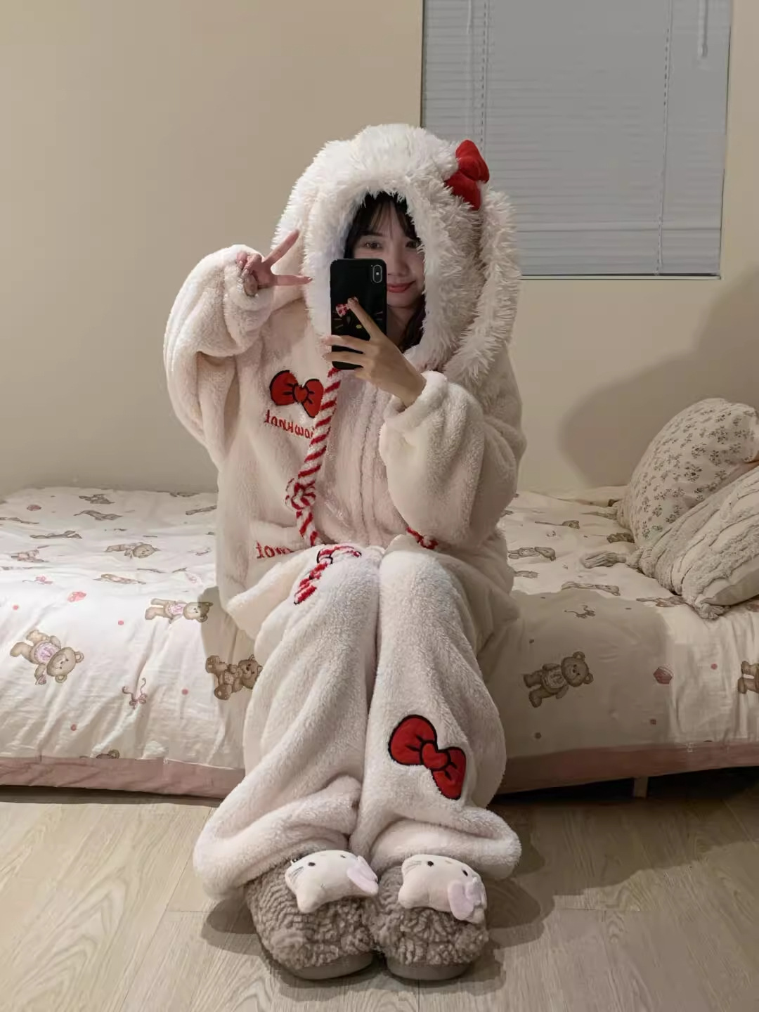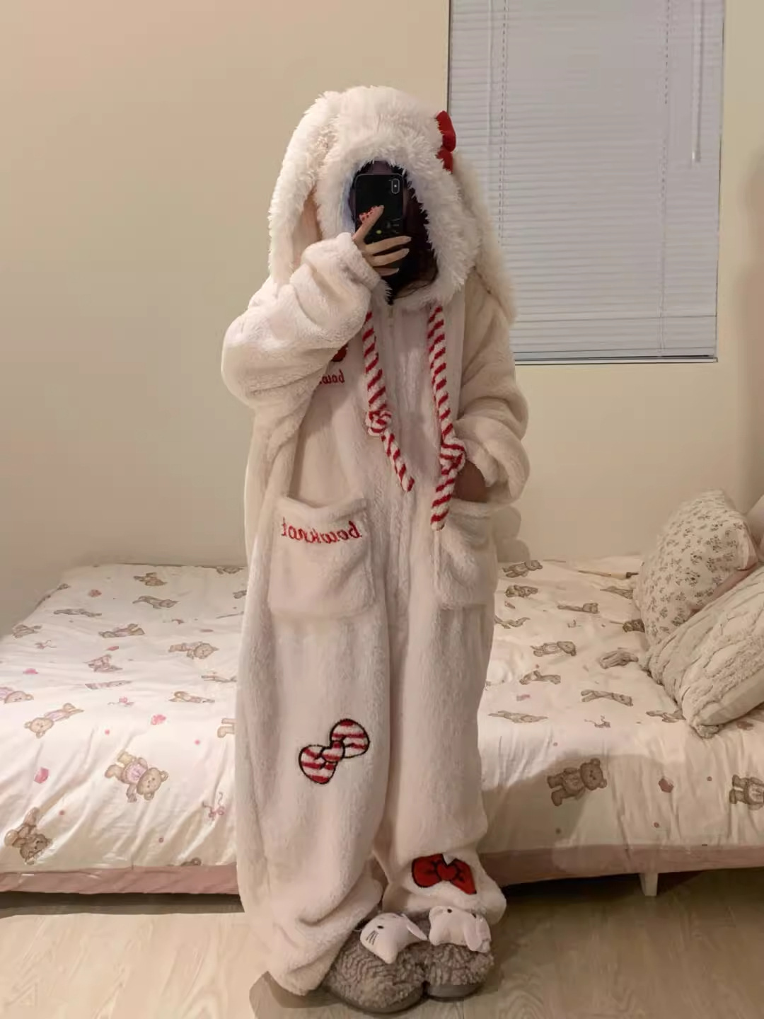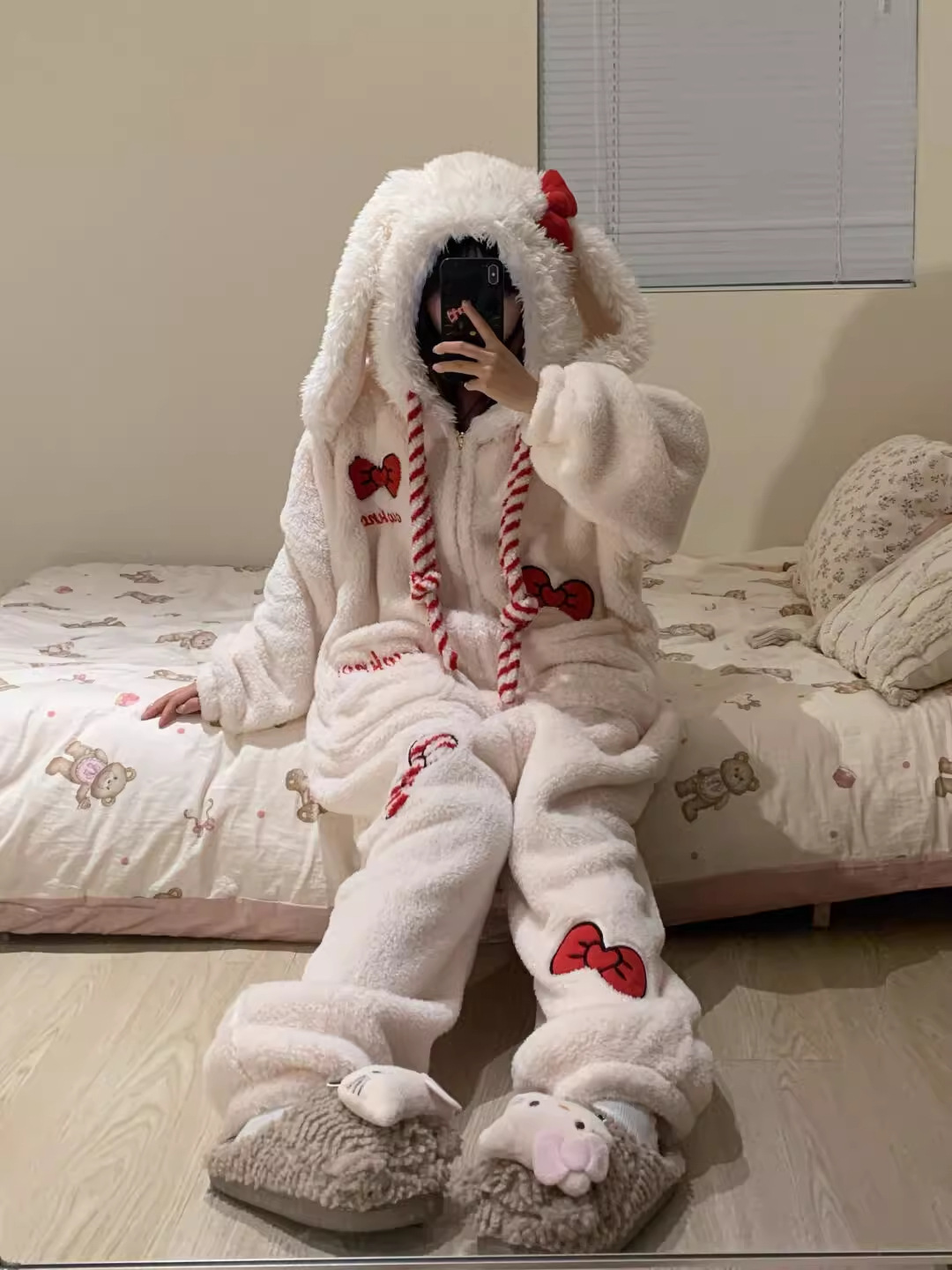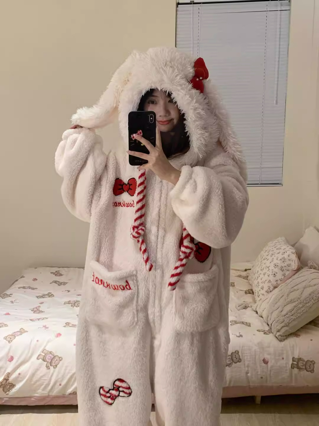 귀여운 토끼 귀 빨간 활 산호 양털 한 조각 잠옷 여자의 겨울 기모 두꺼운 봉제 플러스 사이즈 홈 옷