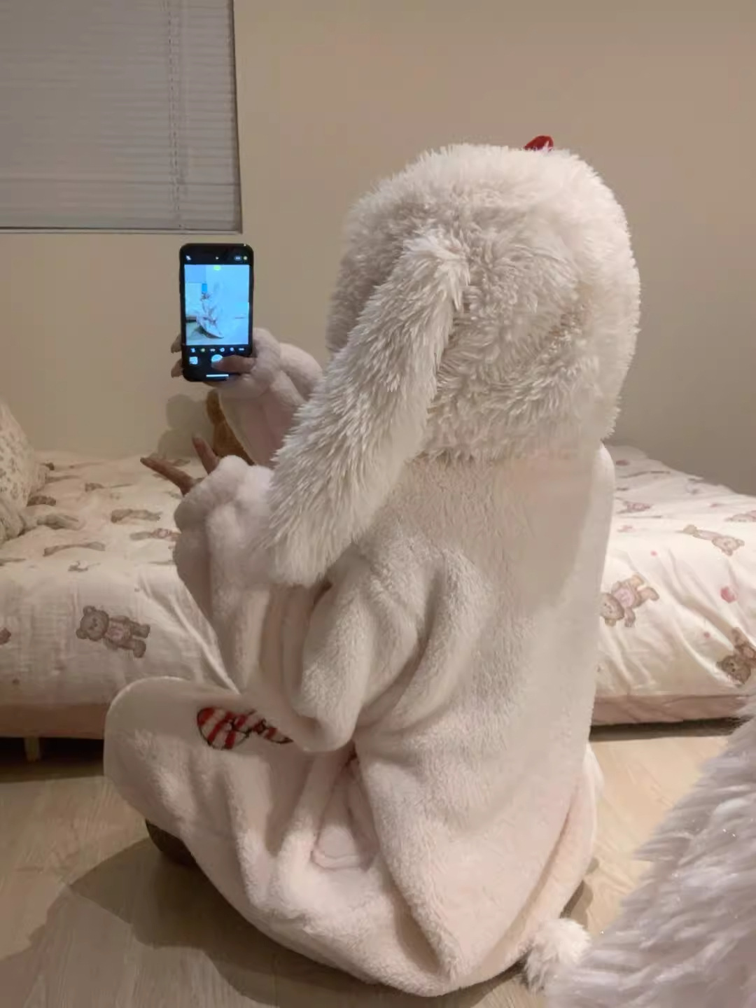 귀여운 토끼 귀 빨간 활 산호 양털 한 조각 잠옷 여자의 겨울 기모 두꺼운 봉제 플러스 사이즈 홈 옷스토어 가기