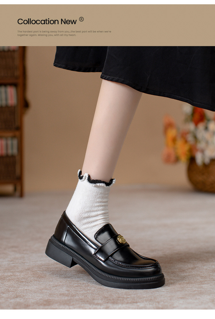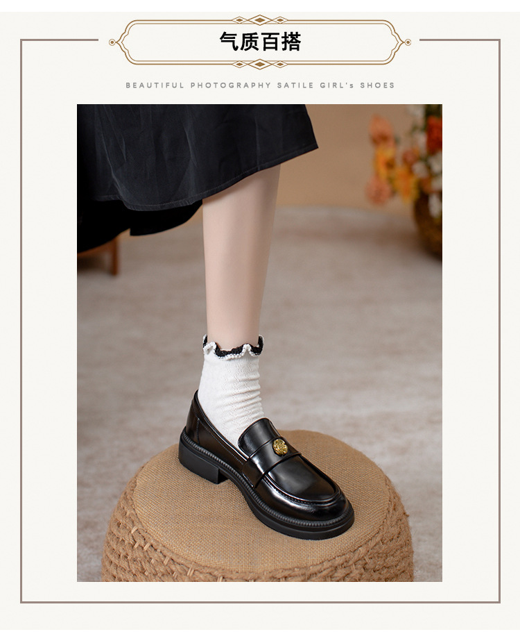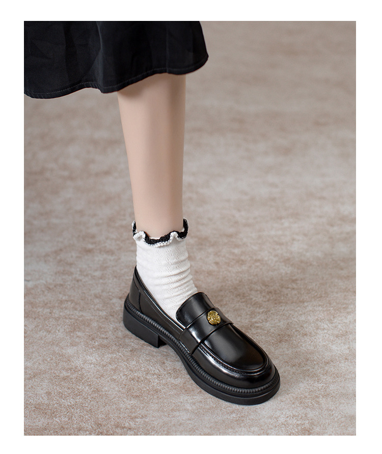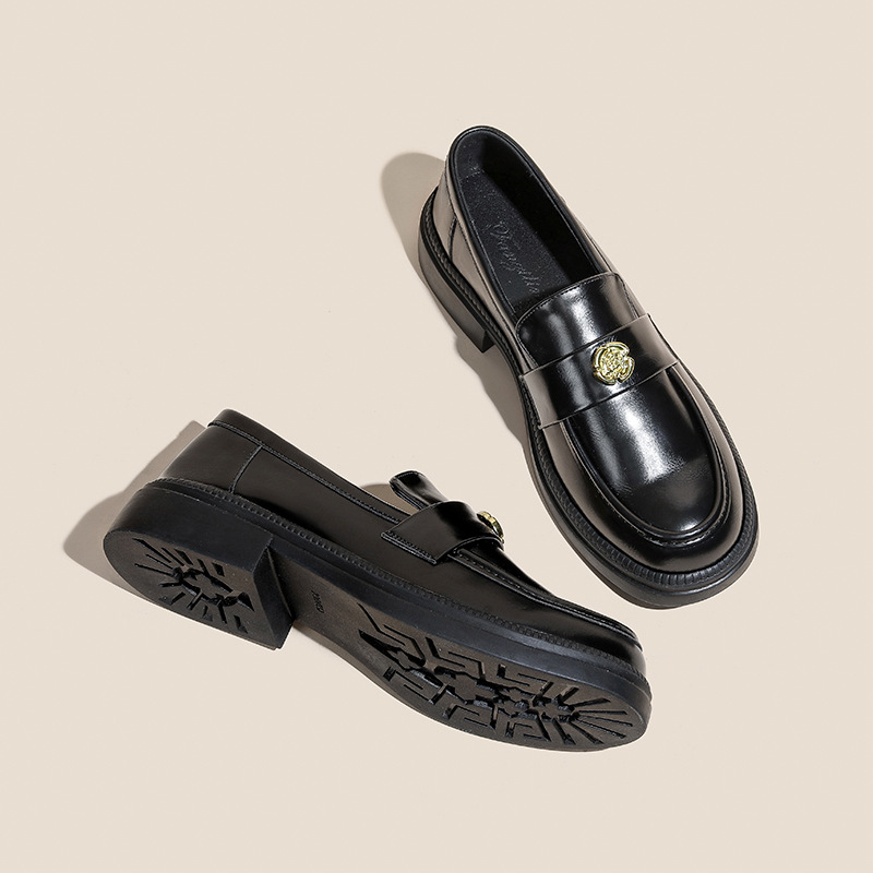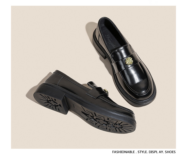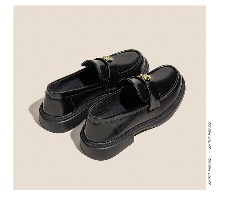 여성용 소형 골드 코인 버클 플랫폼 밑창 로퍼 여성 2024 새로운 영국 스타일 싱글 레이어 신발 블랙 올 매치 캐주얼 작은 가죽 신발