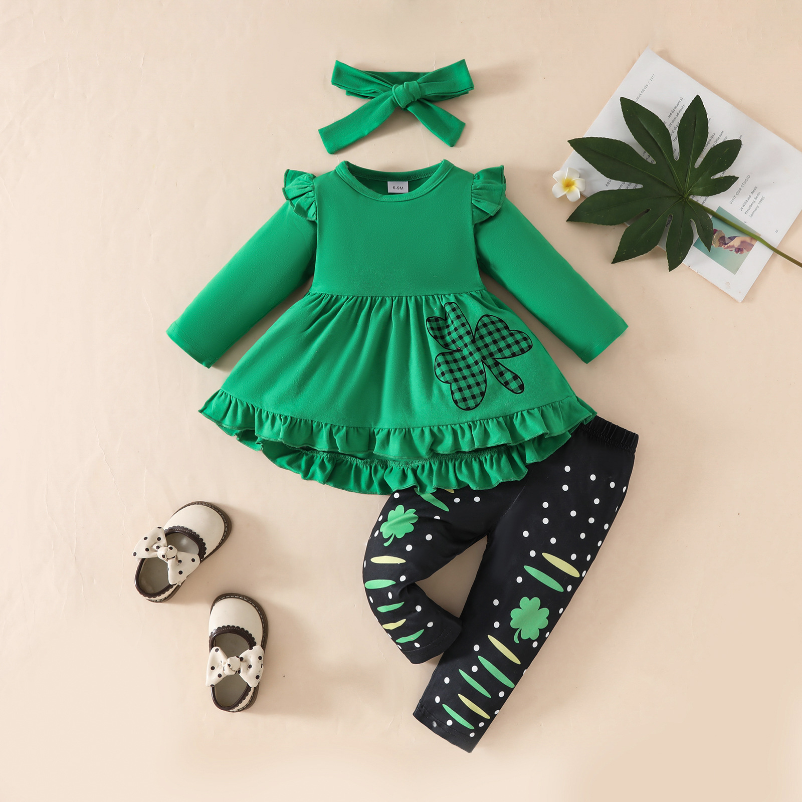 2025 유아 소녀 성 패트릭의 날 녹색 긴 소매 원피스 프린트 바지 헤어 스트랩 클로버 세트스토어 가기