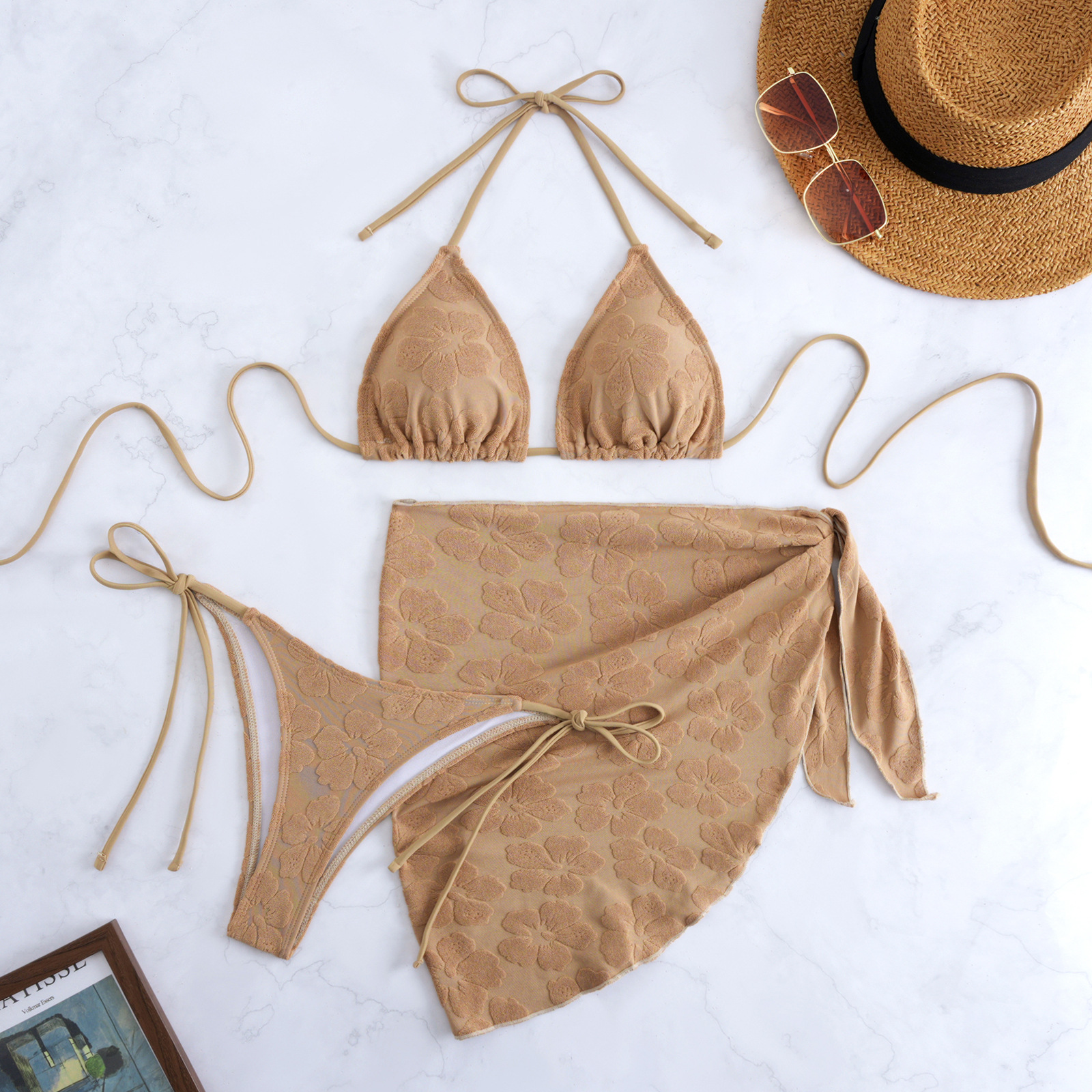 2025 새로운 유럽과 미국의 분할 수영복 3 피스 세트 동백 패턴 타월 크로스 보더 비키니 비키니스토어 가기
