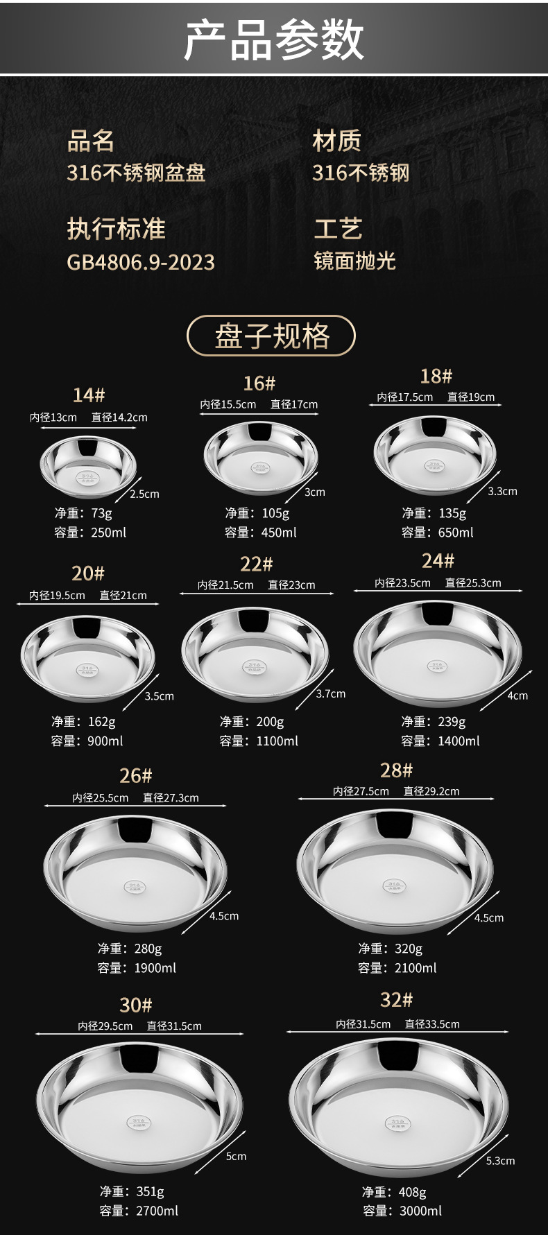 316 스테인레스 스틸 디스크 두꺼운 플레이트 디너 플레이트 접시 스테인레스 스틸 바베큐 플레이트 가정용 접시 과일 플레이트 트레이