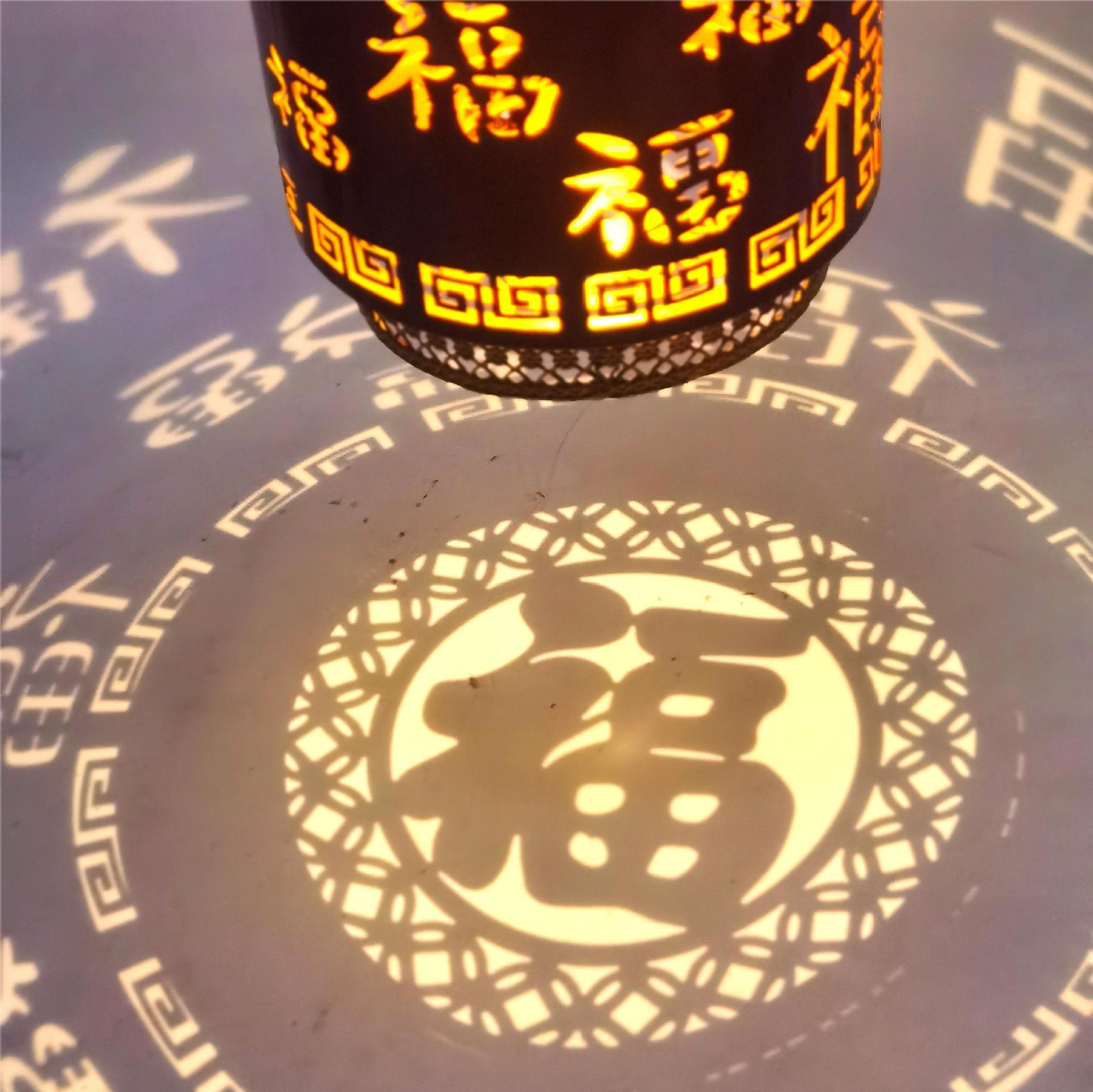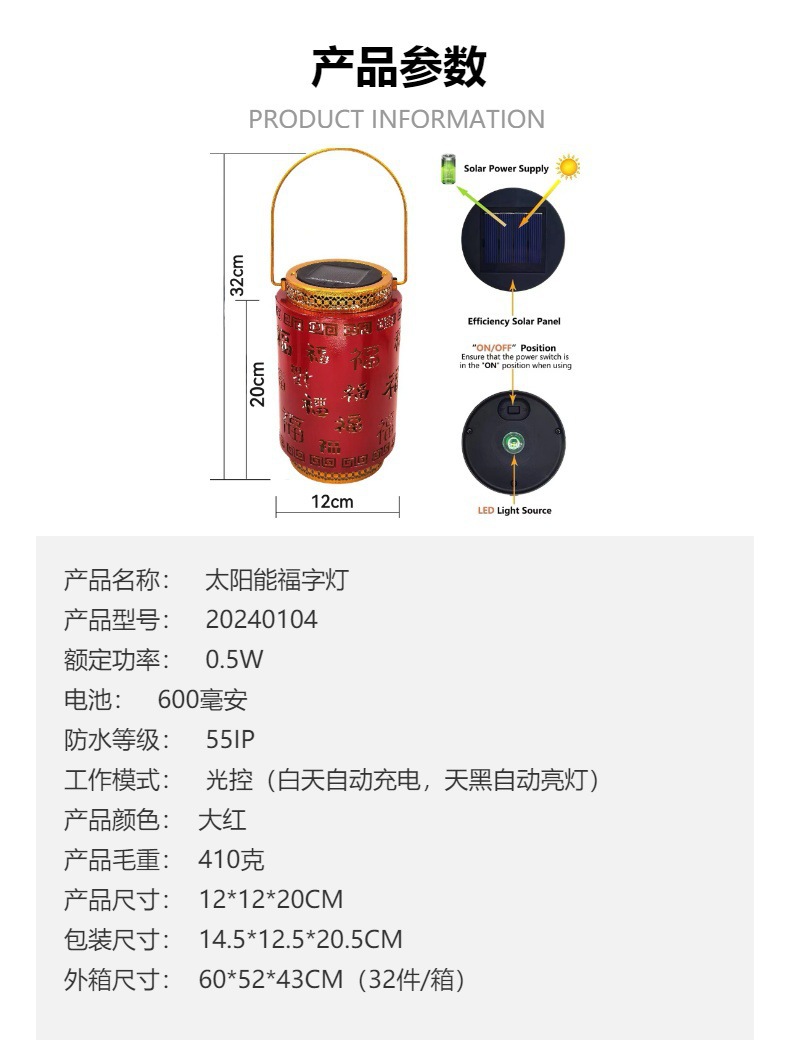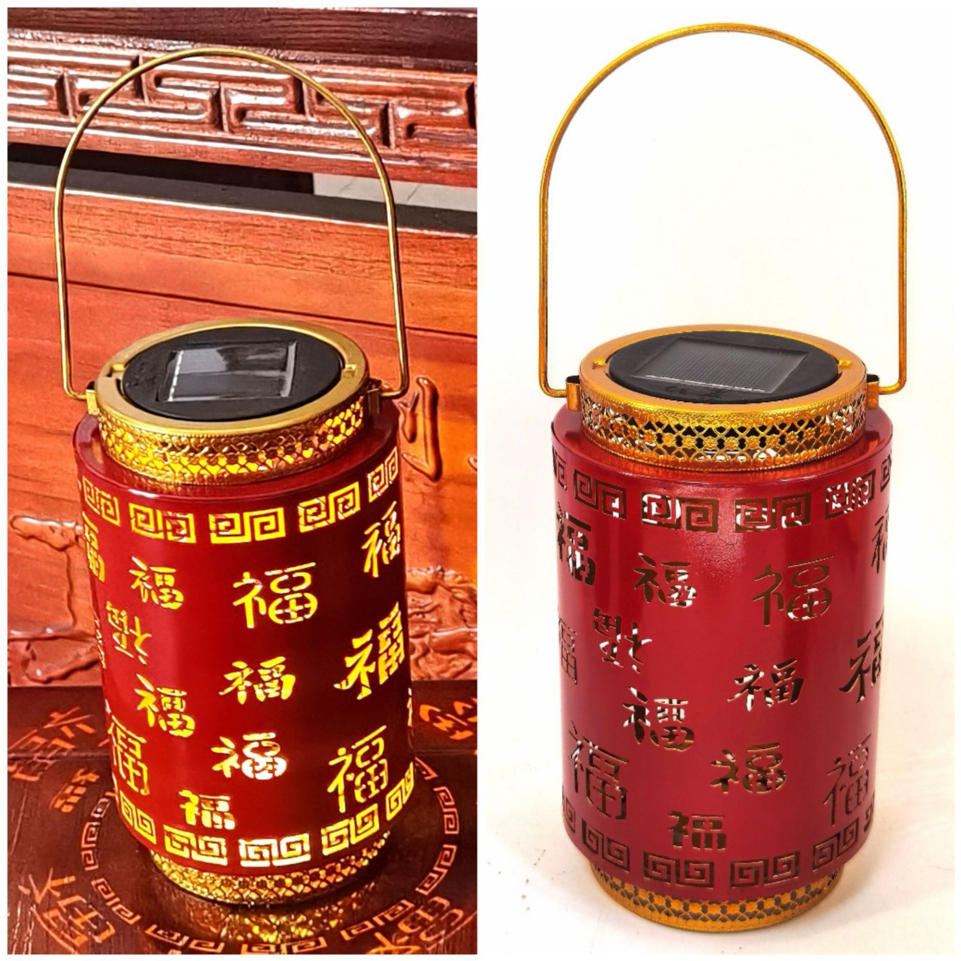 • "Fu"라는 단어가 적힌 태양 에너지 붉은 등불(철 예술)