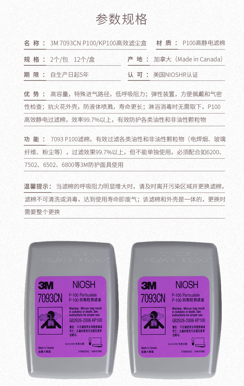 3M 7093CN滤盒P100滤毒盒防烟尘辐射颗粒物过滤棉玻璃纤维电焊烟