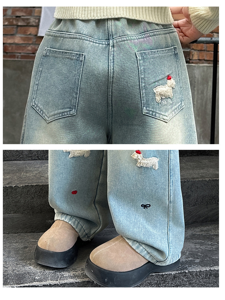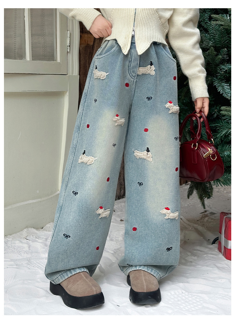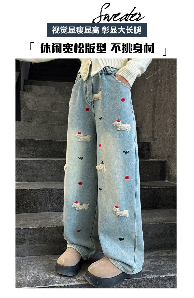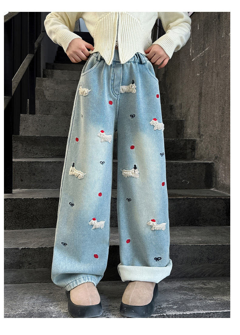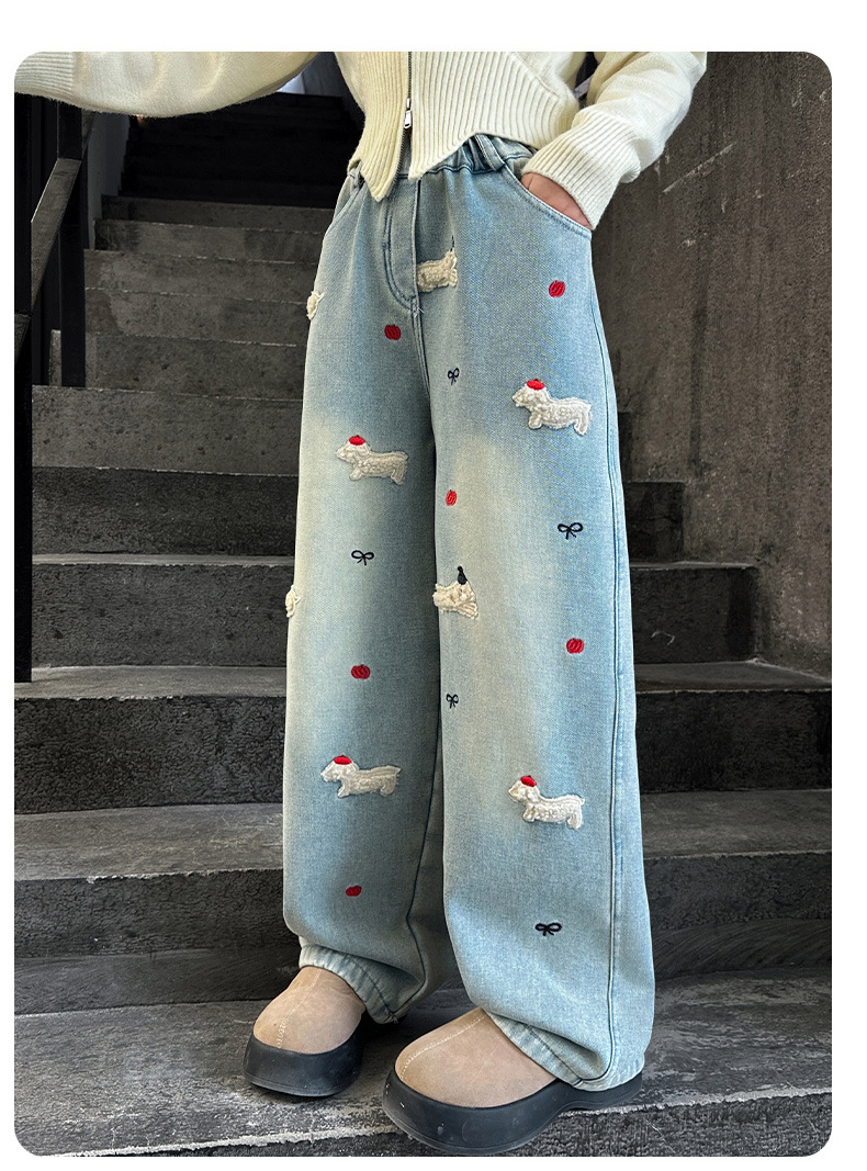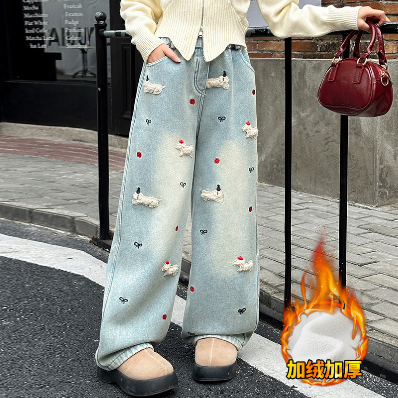 소녀 가을 겨울 청바지 기모 두꺼운 어린이 바지 2024 새로운 스타일 유행 겨울 직선 다리 넓은 다리 바지스토어 가기
