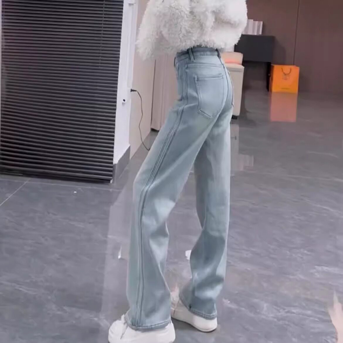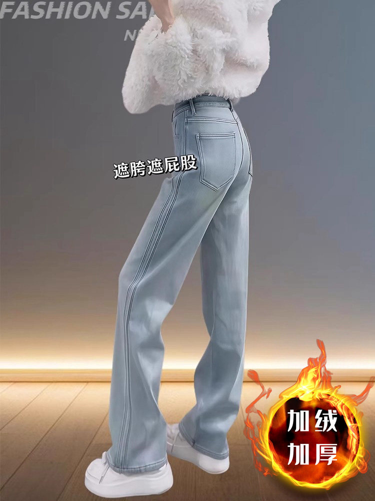 기모 두꺼운 청바지 여성의 겨울 새로운 배 모양의 몸 슬림 따뜻한 밝은 색 플러스 사이즈 바닥 직선 바지스토어 가기