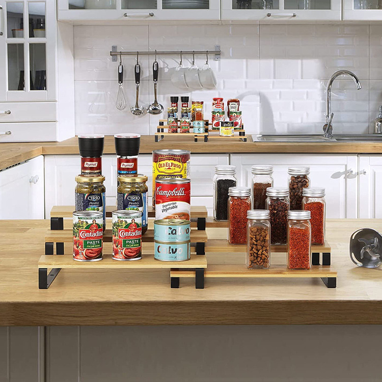 3 층 대나무 향신료 조미료 랙 확장 가능한 개폐식 주방 욕실 금속 목재 디스플레이 보관 랙 사다리 랙