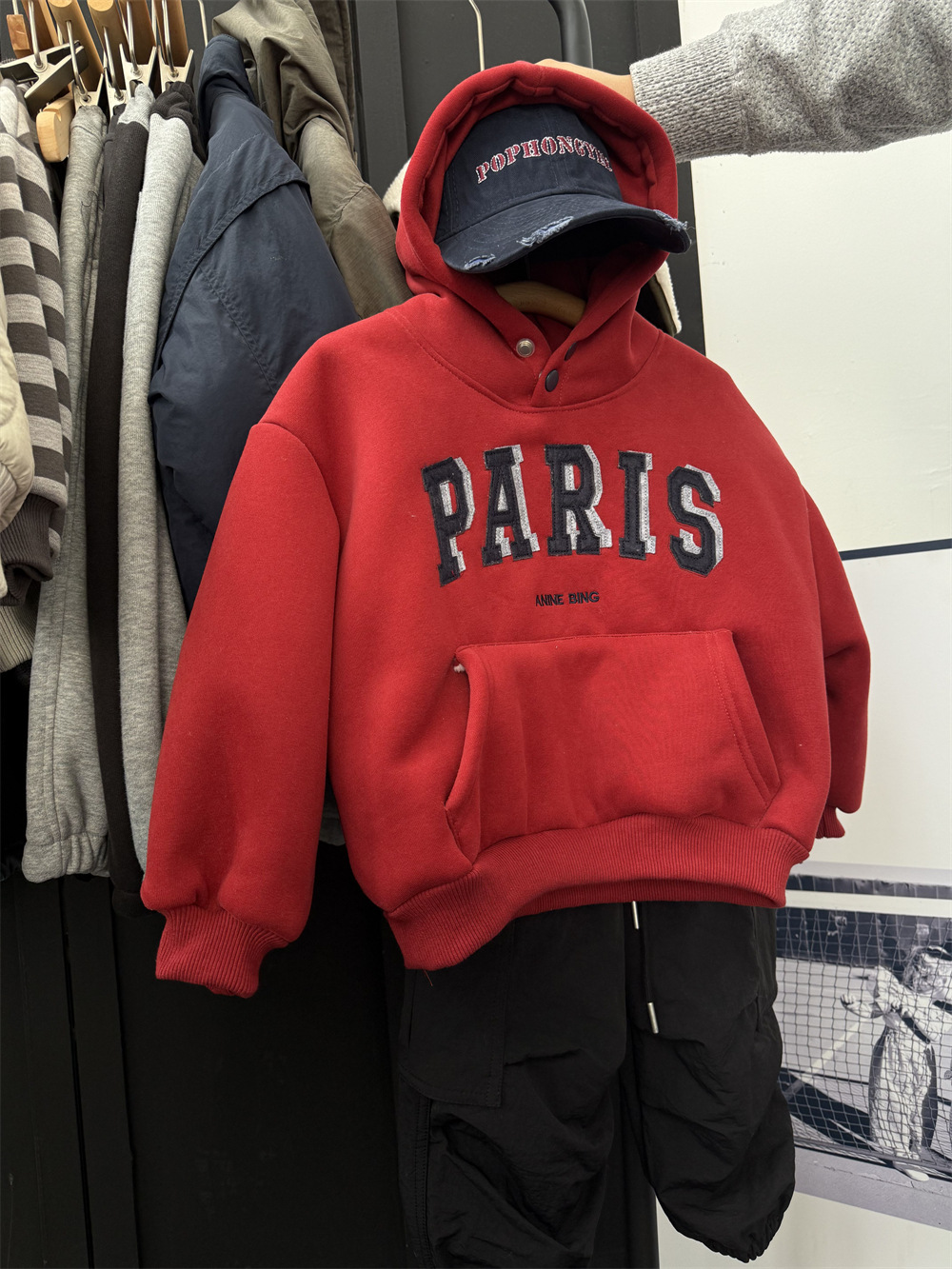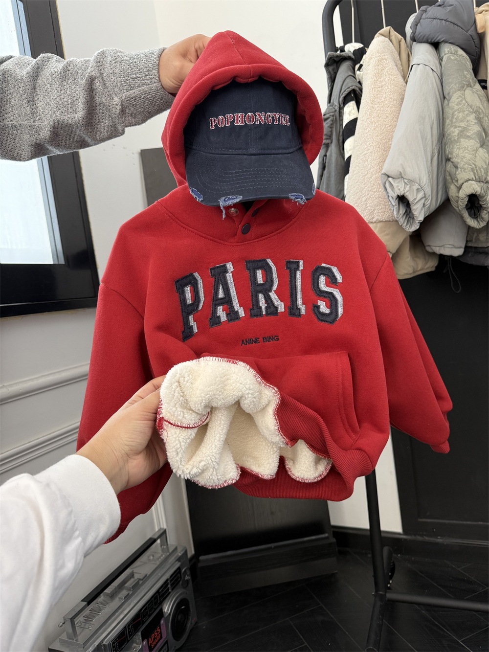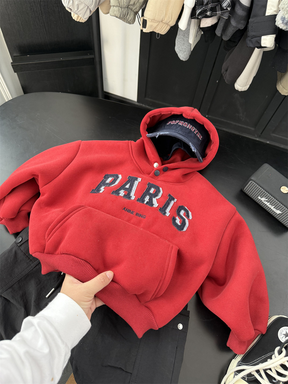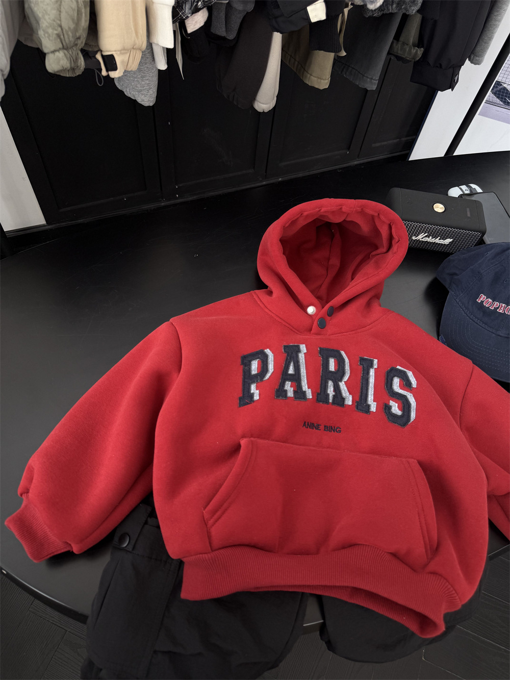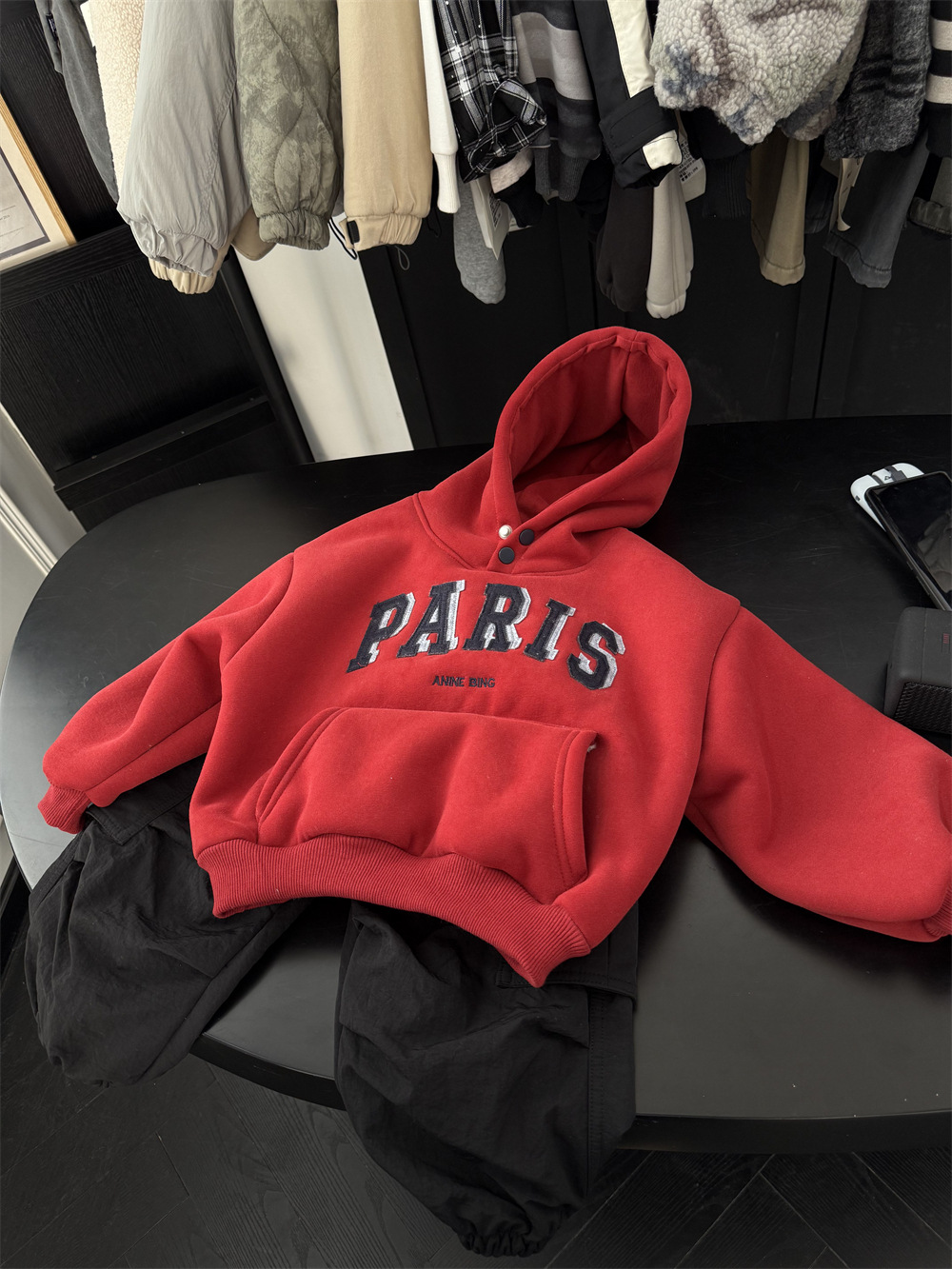 새해 레드 어린이 겨울 복합 알파카 후드 레드 스웨터 아메리칸 스타일 자수 편지 두꺼운 후드 소년 소녀스토어 가기
