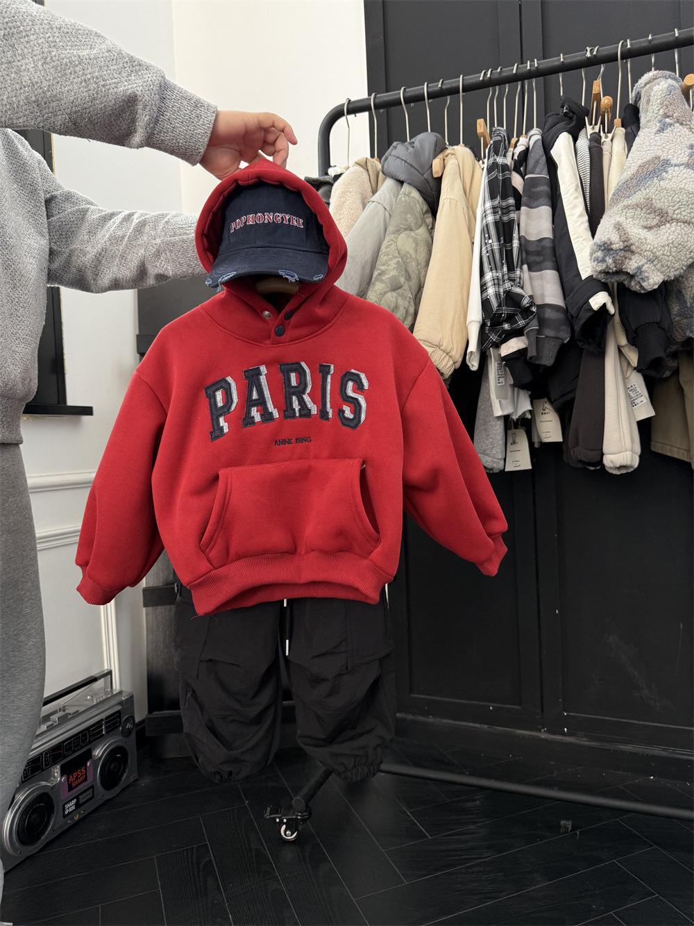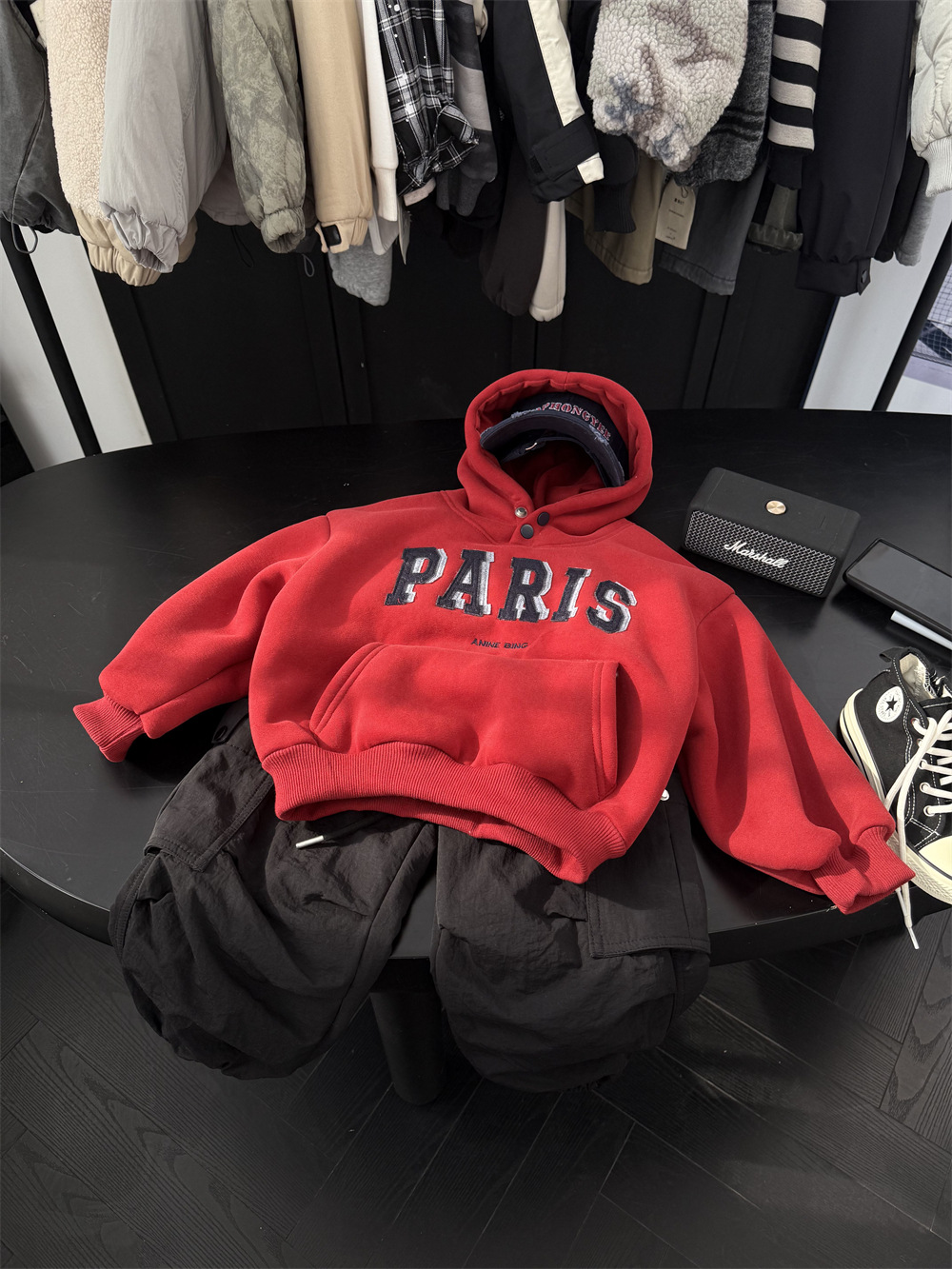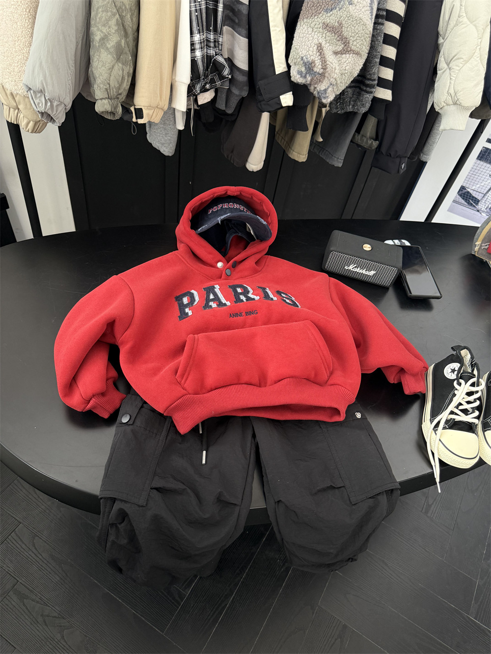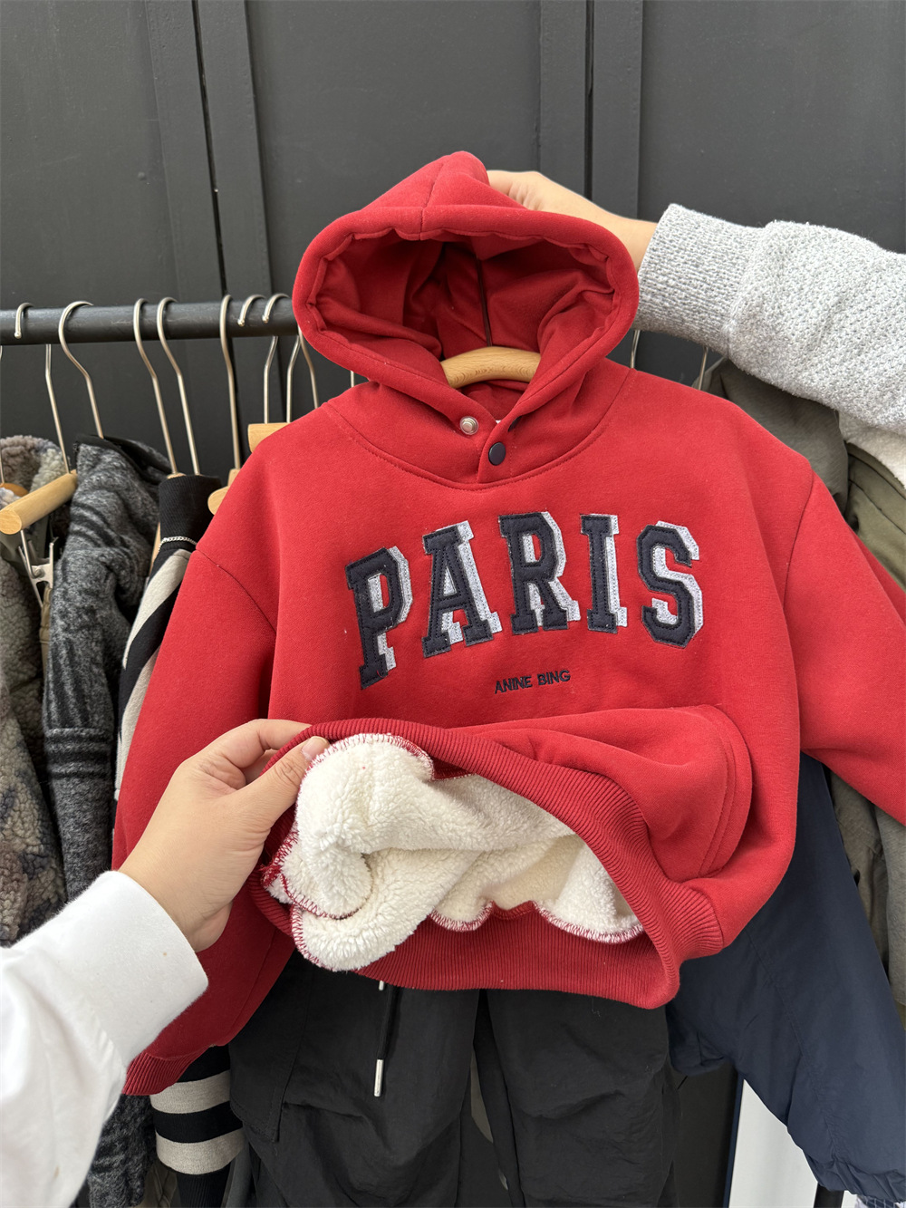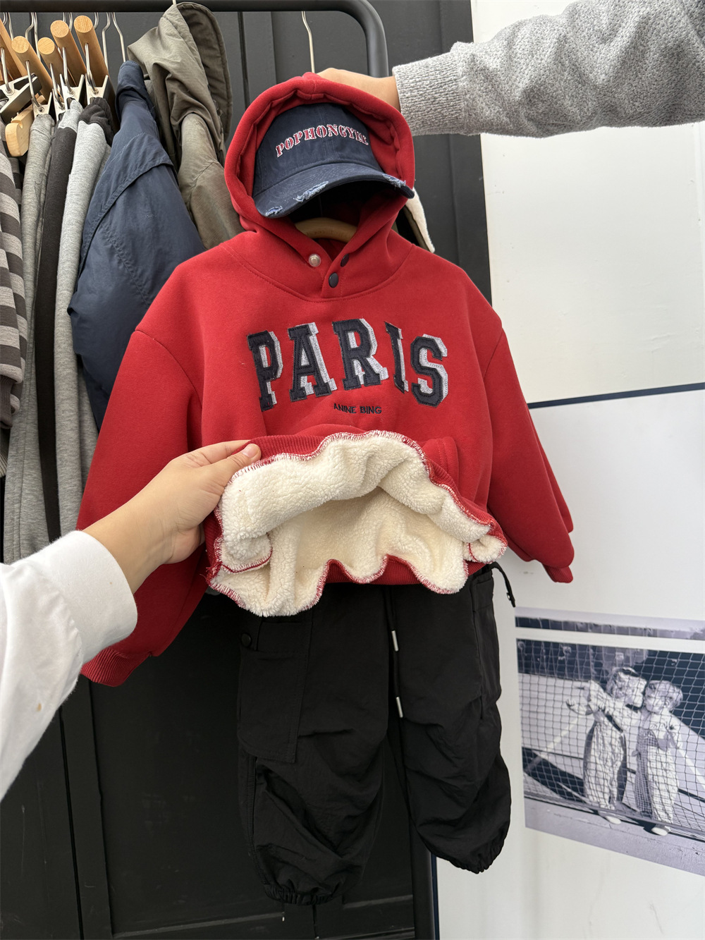 새해 레드 어린이 겨울 복합 알파카 후드 레드 스웨터 아메리칸 스타일 자수 편지 두꺼운 후드 소년 소녀스토어 가기