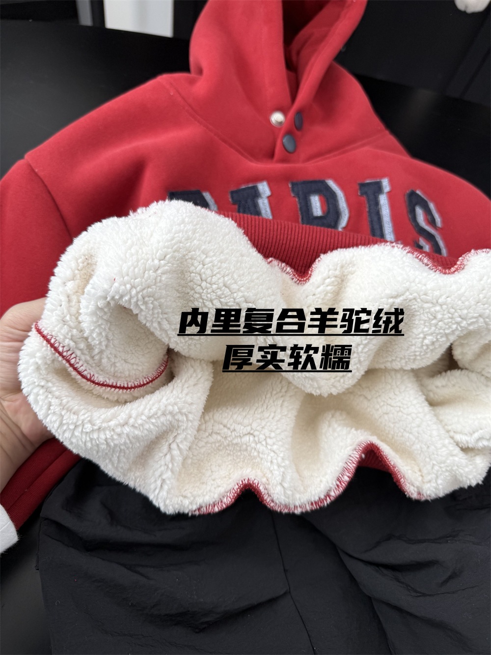 새해 레드 어린이 겨울 복합 알파카 후드 레드 스웨터 아메리칸 스타일 자수 편지 두꺼운 후드 소년 소녀