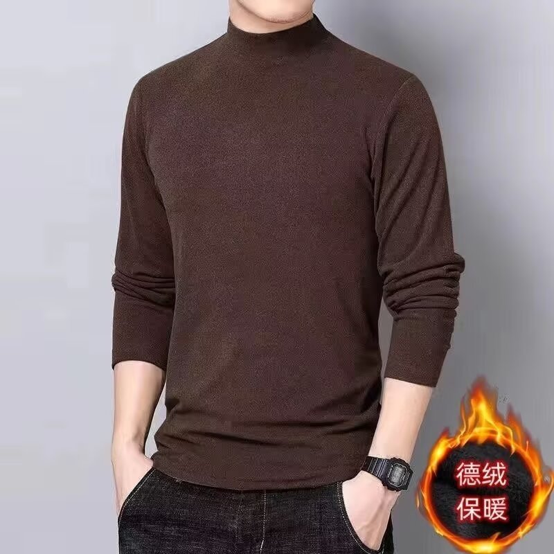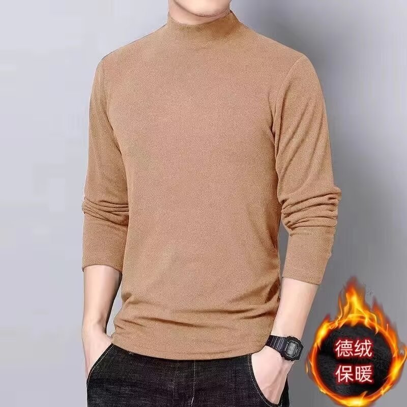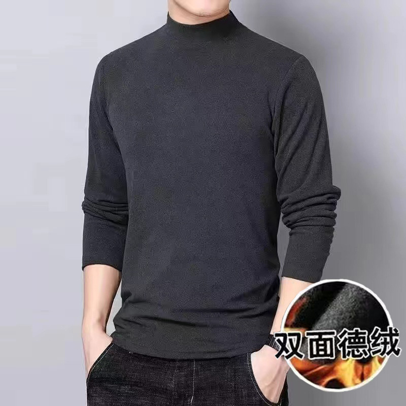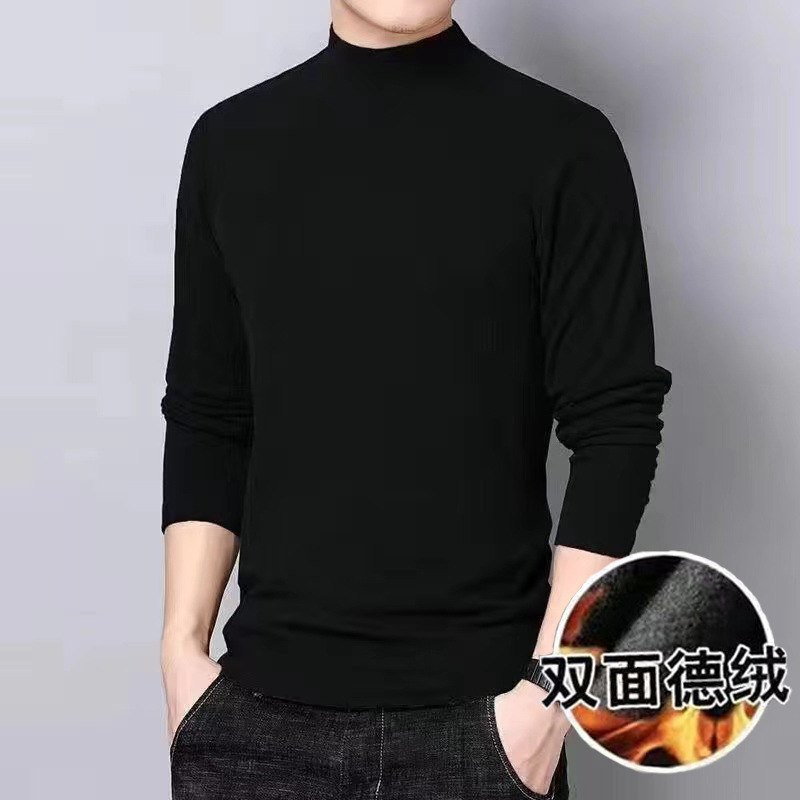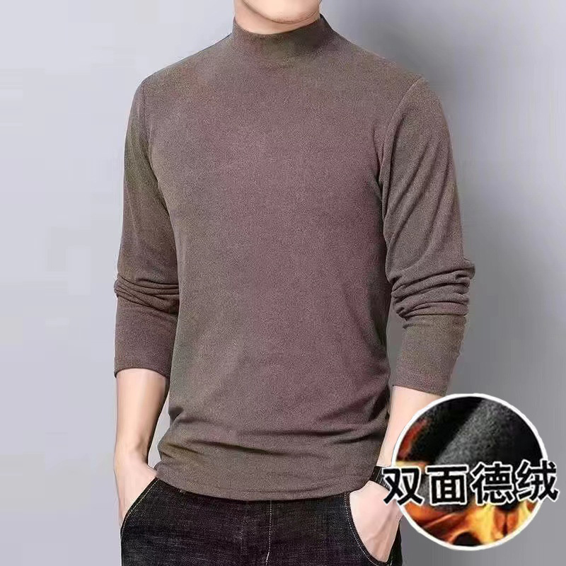 스트레치 가을과 겨울 따뜻한 셔츠 티셔츠 남성 양면 벨벳 세미 하이 넥 긴팔 티셔츠 작은 높은 목 솔리드 컬러베이스 셔츠