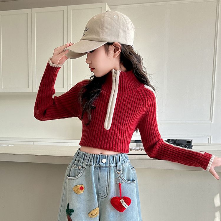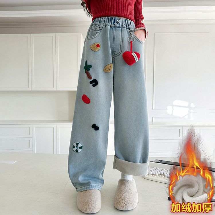 소녀 기모 청바지 2024 새로운 한국 스타일 두꺼운 학생 서양식 캐주얼 스트레이트 튜브 사랑 펜던트 와이드 다리 바지