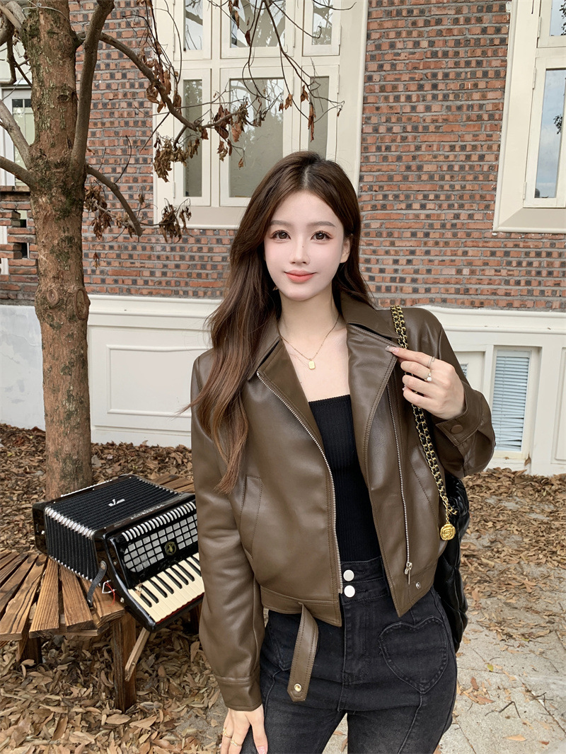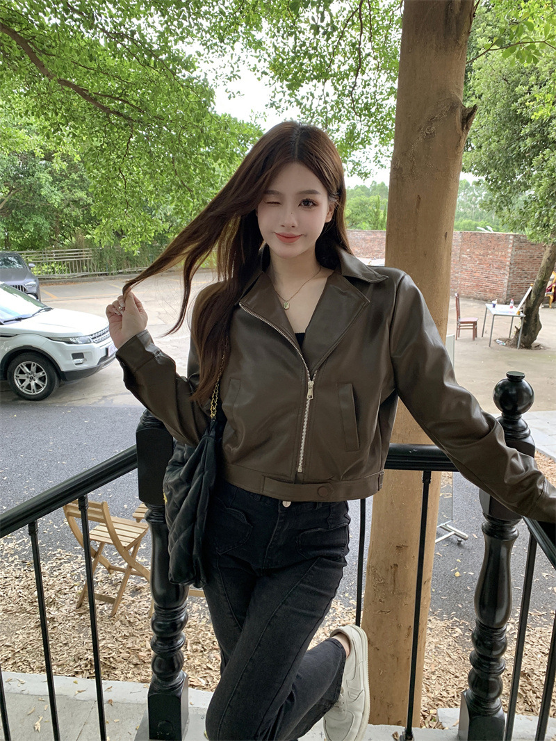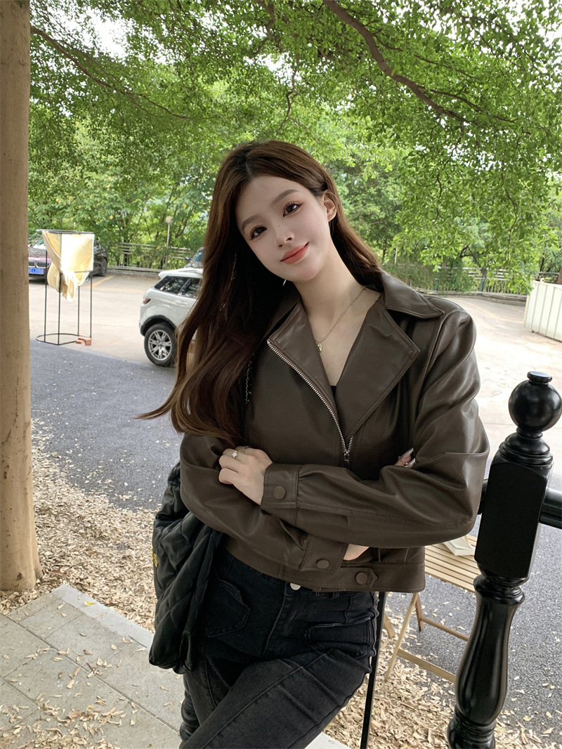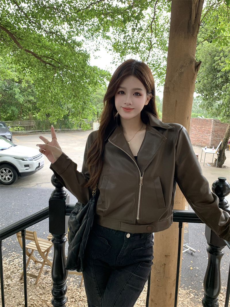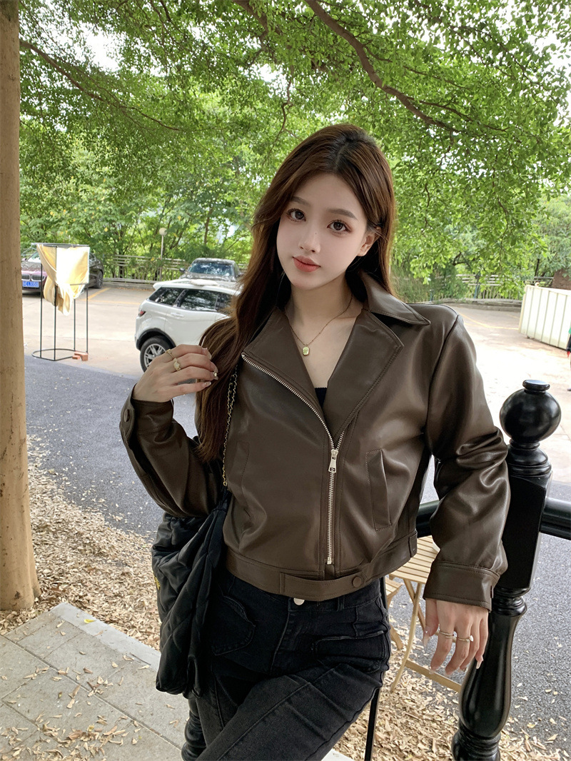 Maillard 미국 빈티지 다크 브라운 PU 가죽 자켓 여성의 2024 초가을 바이커 자켓 짧은 재킷 트렌디