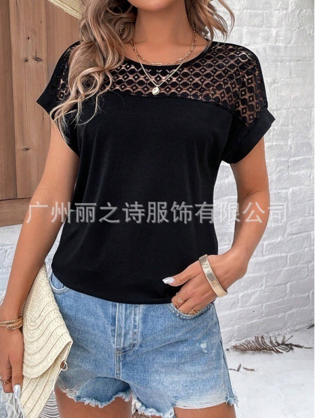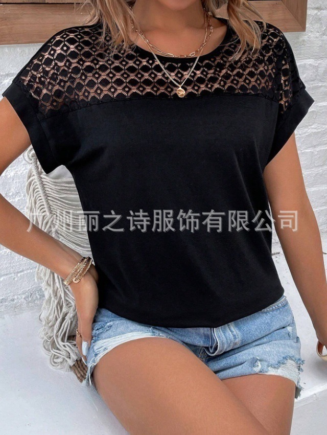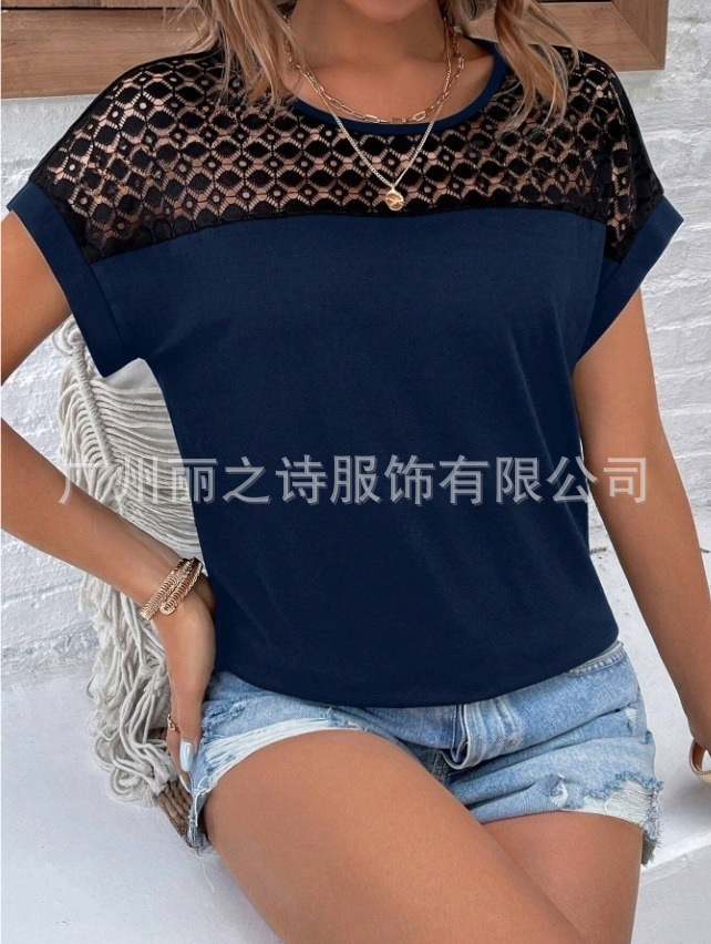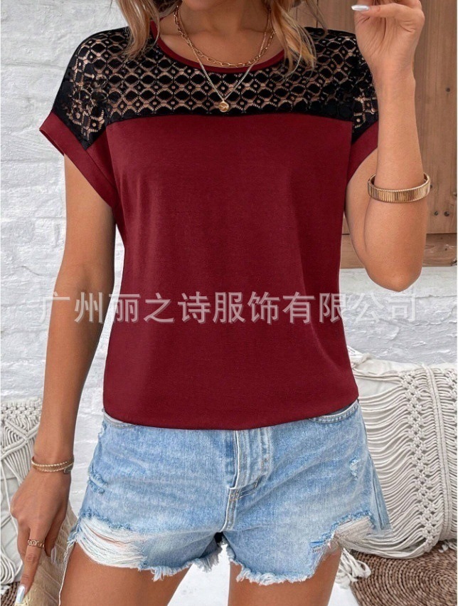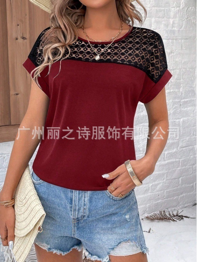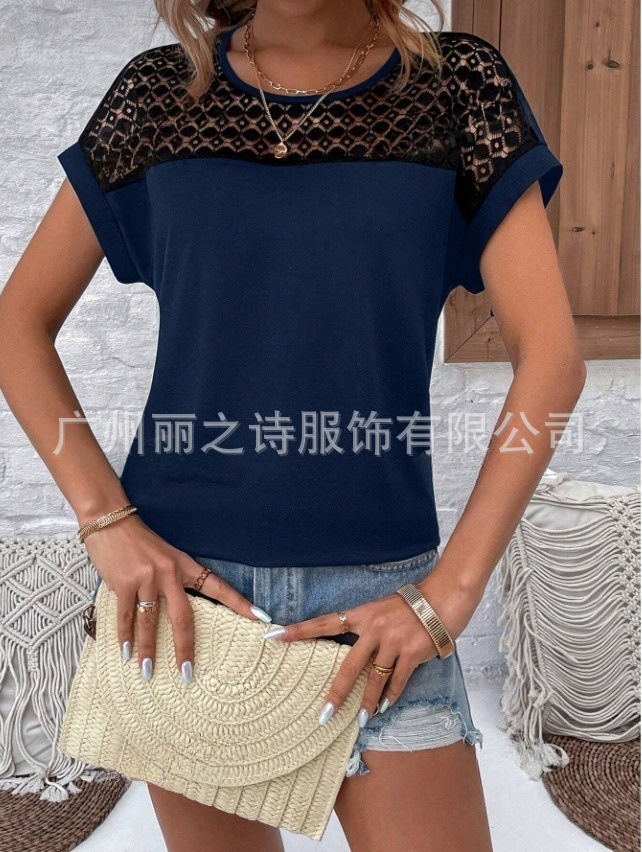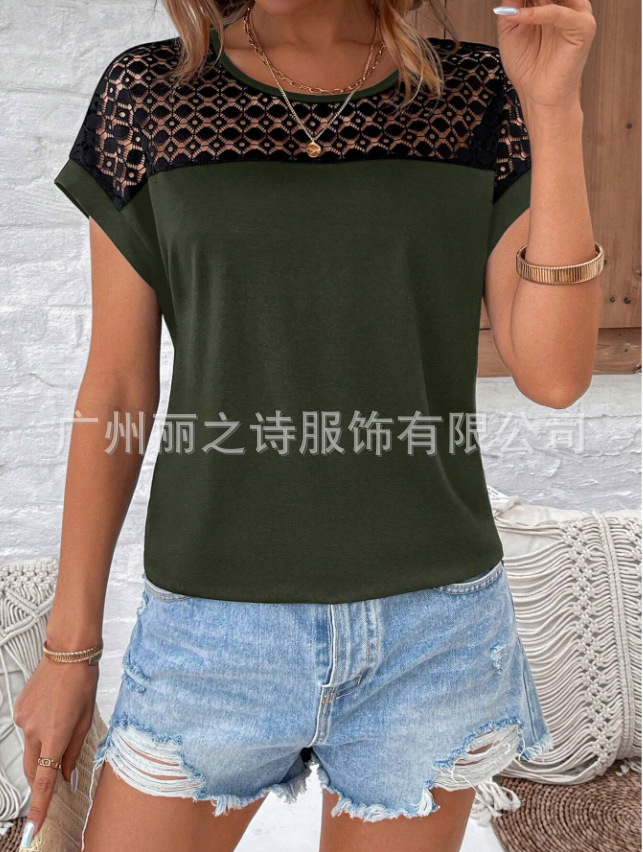 대외 무역 국경 2025 유럽과 미국의 봄 여름 새로운 여성 의류 인기 레이스 라운드 넥 느슨한 오프 어깨 반팔 여성 티셔츠스토어 가기