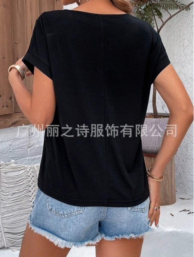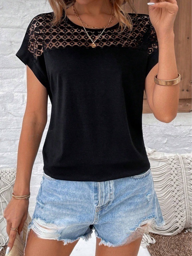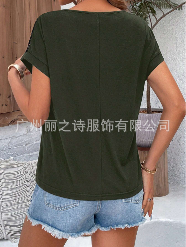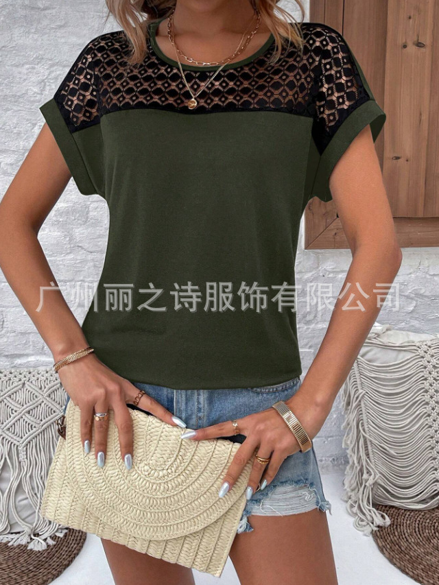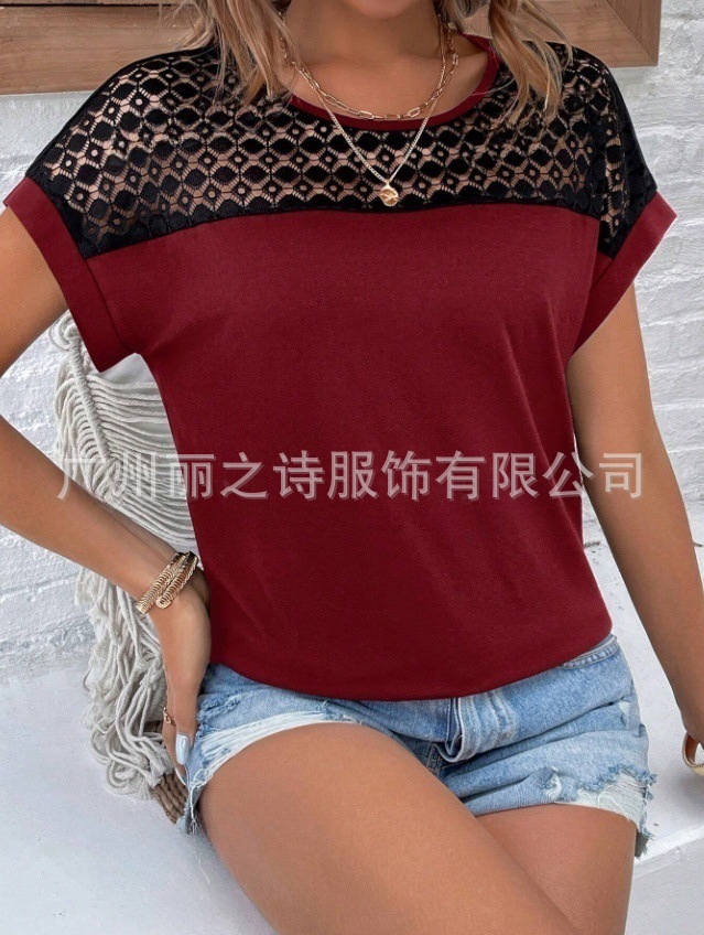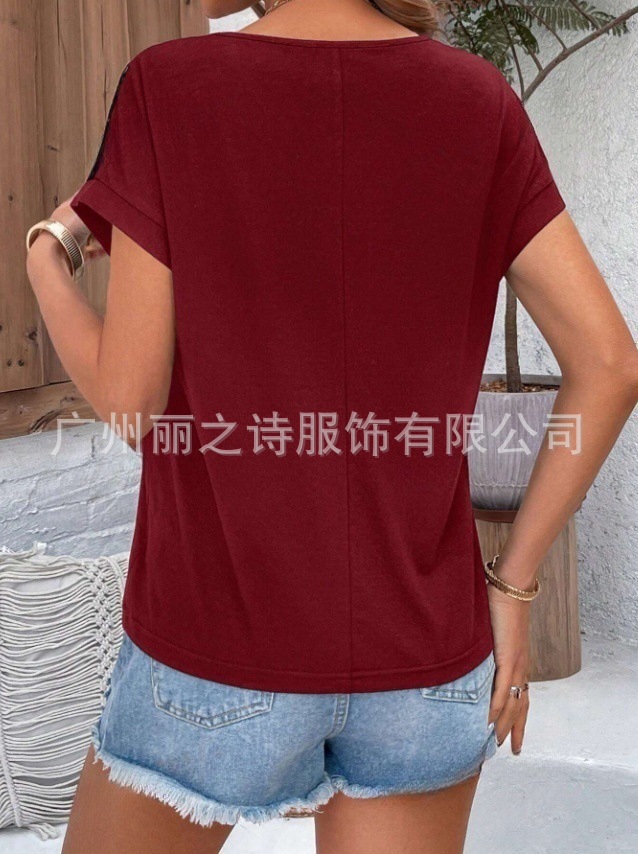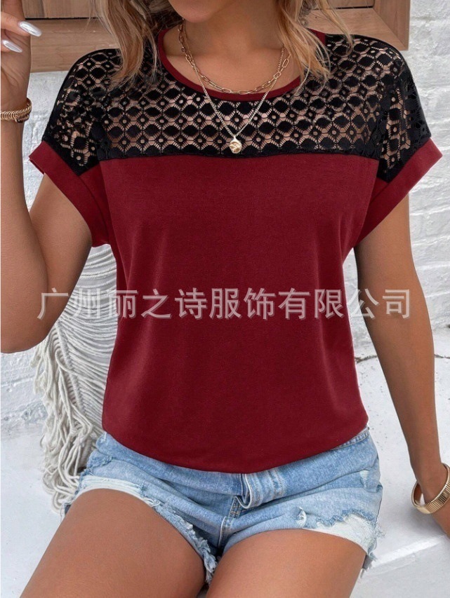 대외 무역 국경 2025 유럽과 미국의 봄 여름 새로운 여성 의류 인기 레이스 라운드 넥 느슨한 오프 어깨 반팔 여성 티셔츠스토어 가기