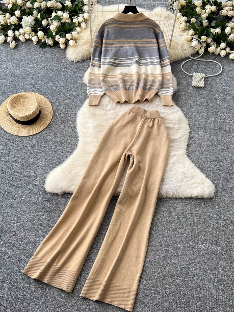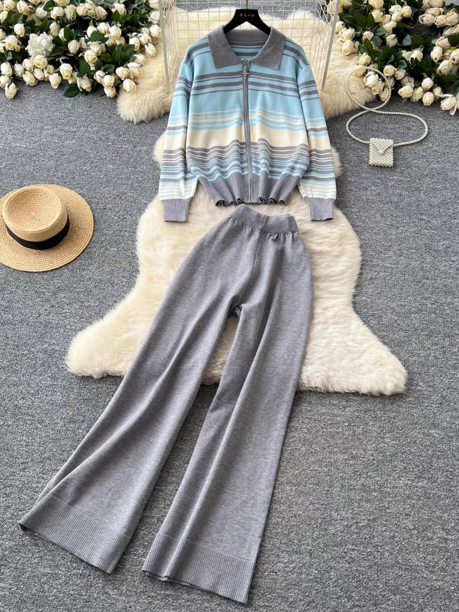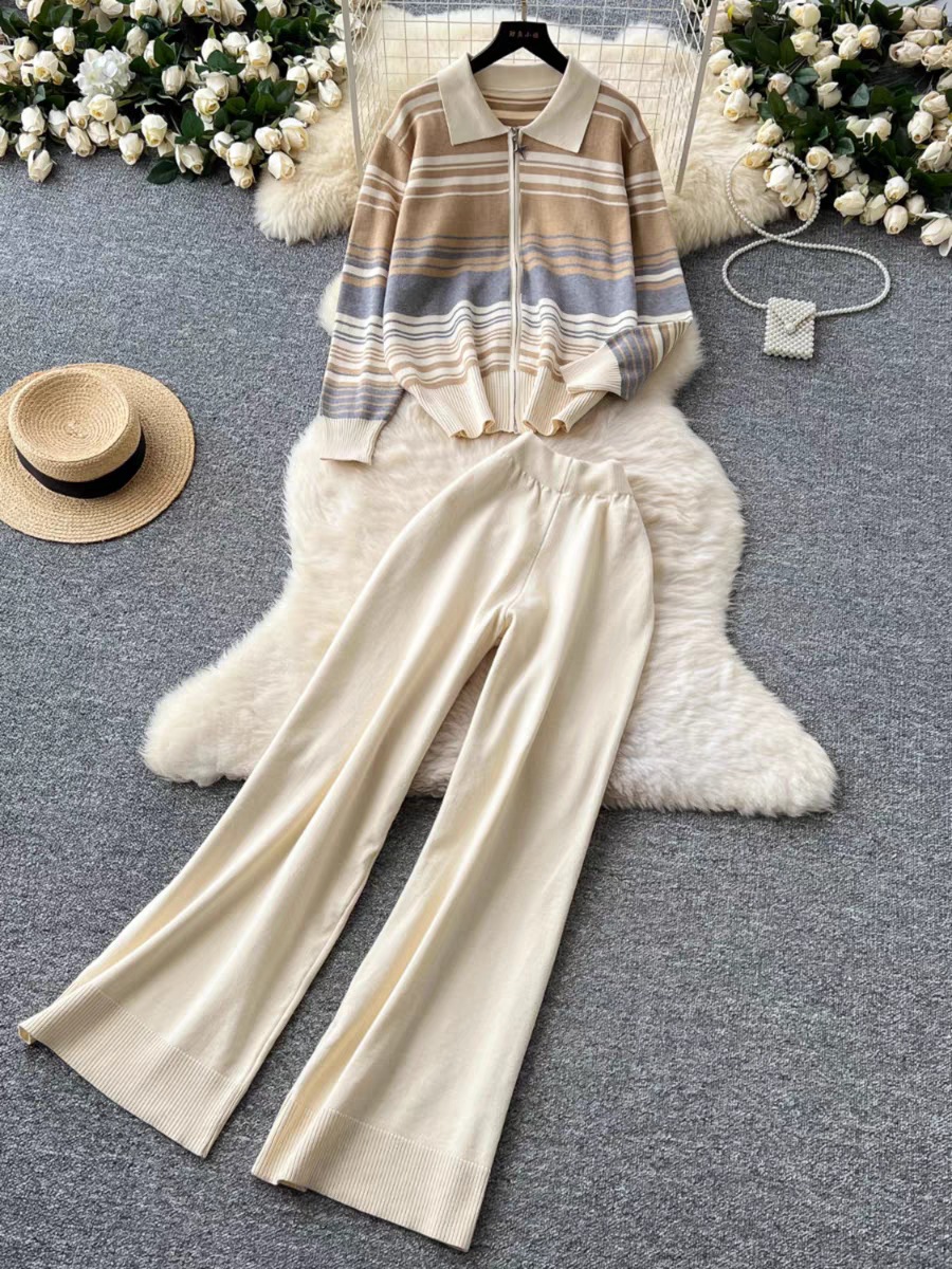 한국식 레트로 콘트라스트 컬러 스트라이프 라 지퍼 디자인 니트 톱 여성용 하이 허리 와이드 다리 바지 겨울 세트