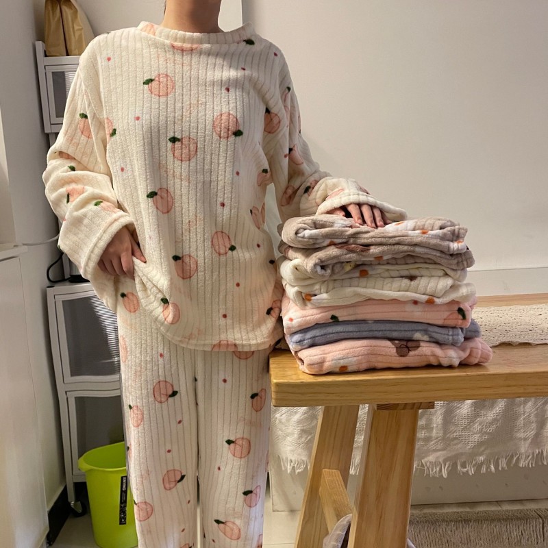 잠옷 여성의 가을/겨울 긴 소매 두 조각 세트 2024 새로운 가을/겨울 느슨한 얇은 벨벳 귀여운 홈 의류 세트 및 쉬운스토어 가기