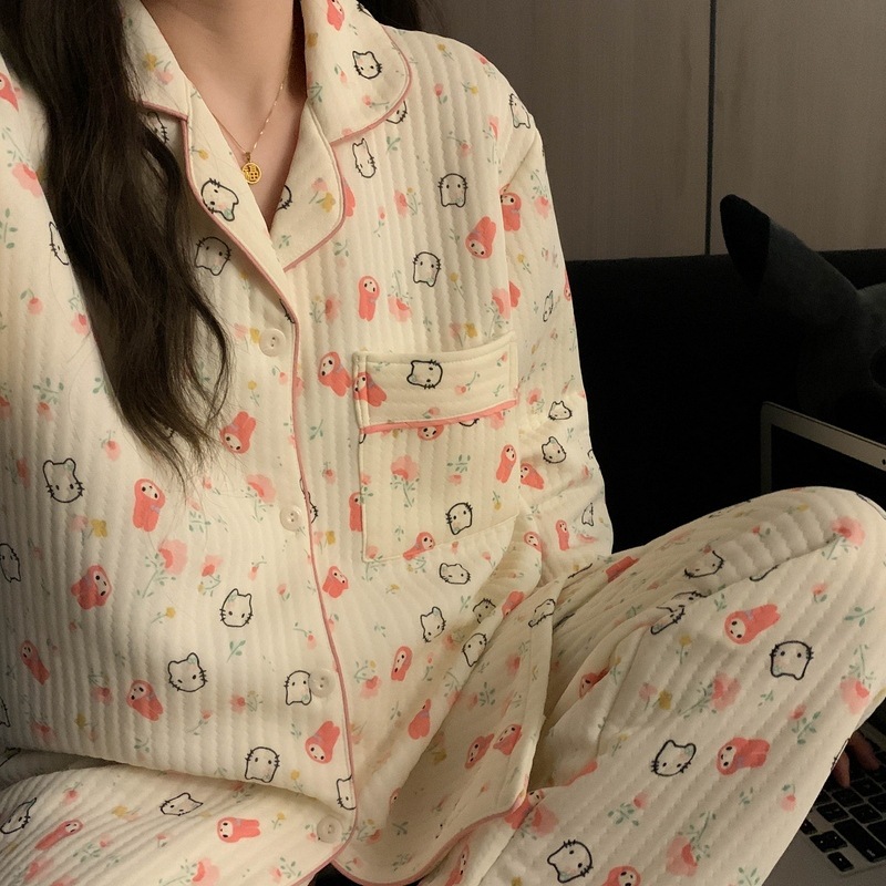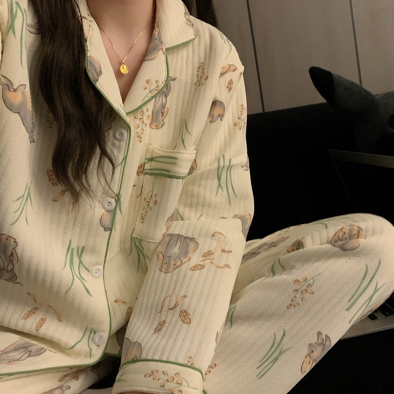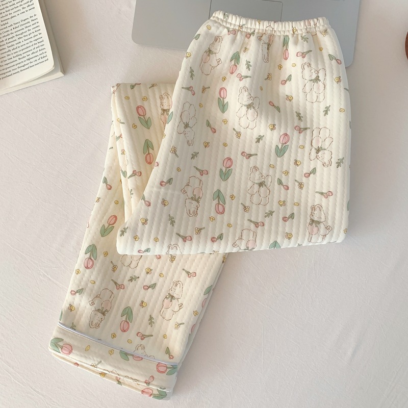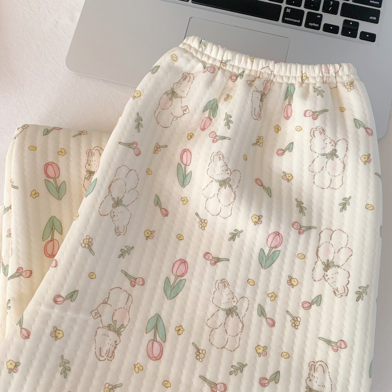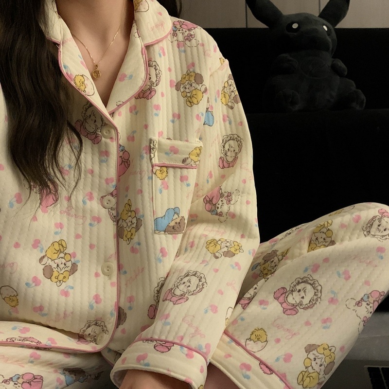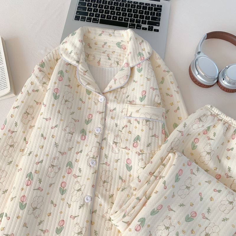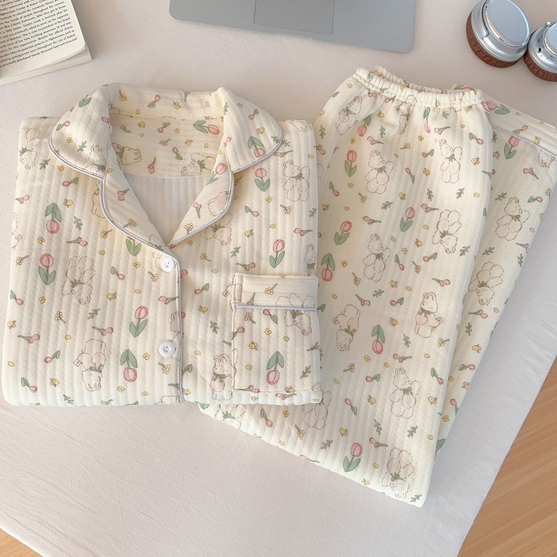가을과 겨울 새로운 샌드위치 잠옷 여성 만화 꽃 토끼 두껍게 따뜻한 귀여운 홈 의류 제조 업체 재고스토어 가기