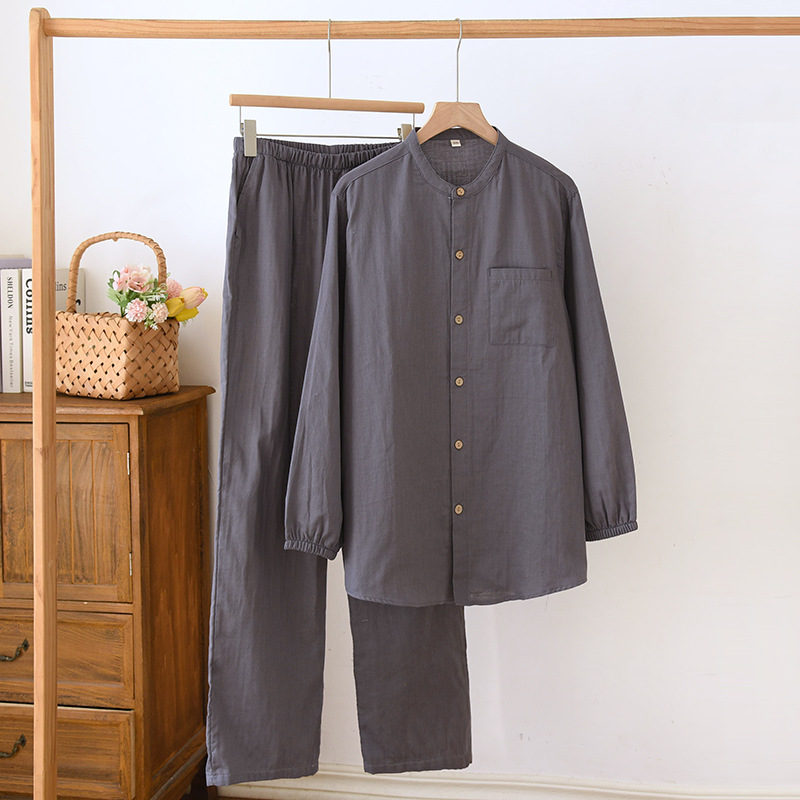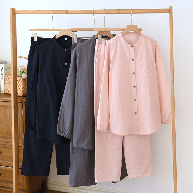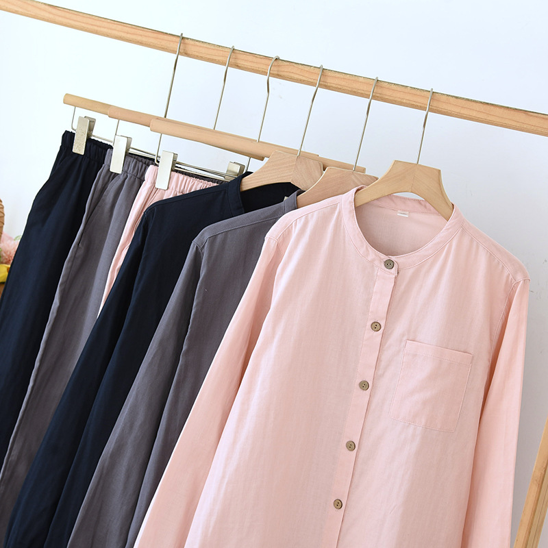 봄과 가을 파자마 여성의 2025 새 집 옷 커플 카디건 남성용 긴팔 느슨한 면 거즈 간단한 비 인쇄 스타일