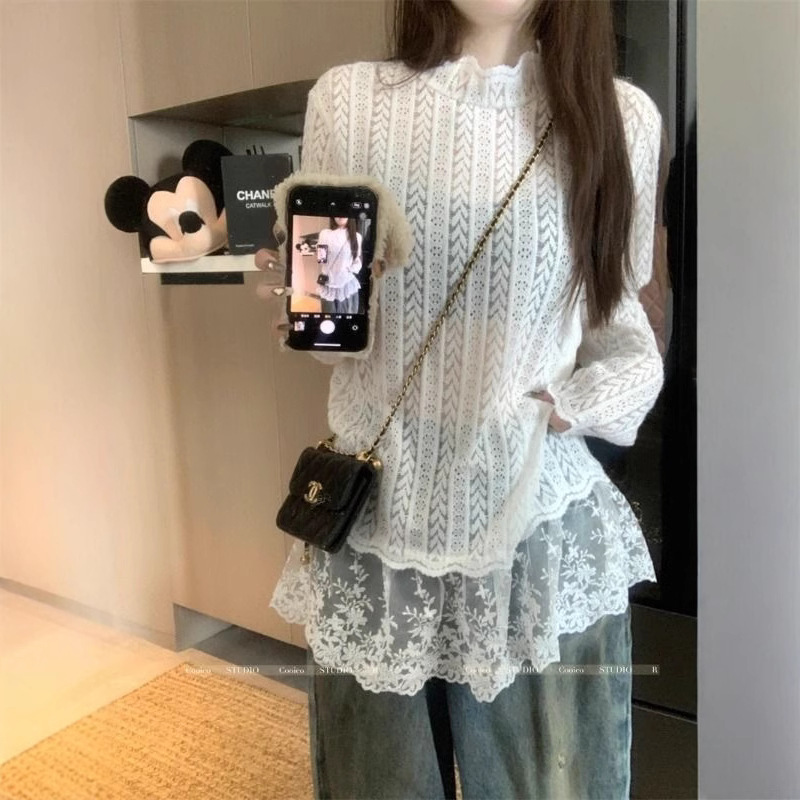 디자인 센스 니쉬 화이트 모크 칼라 레이스 셔츠 여성의 가을과 겨울 서양식 연령 감소 느슨한 중간 길이 이너 탑