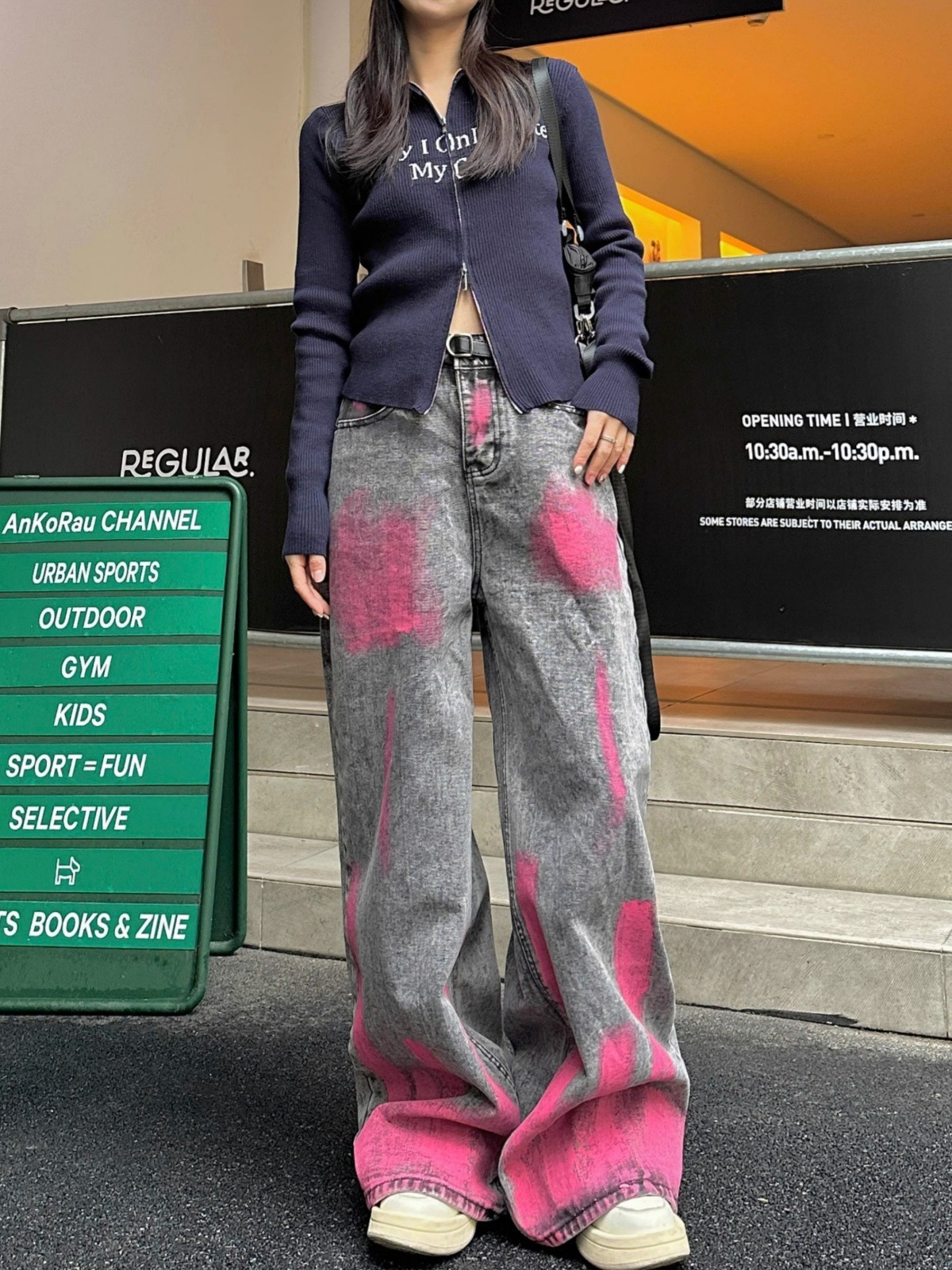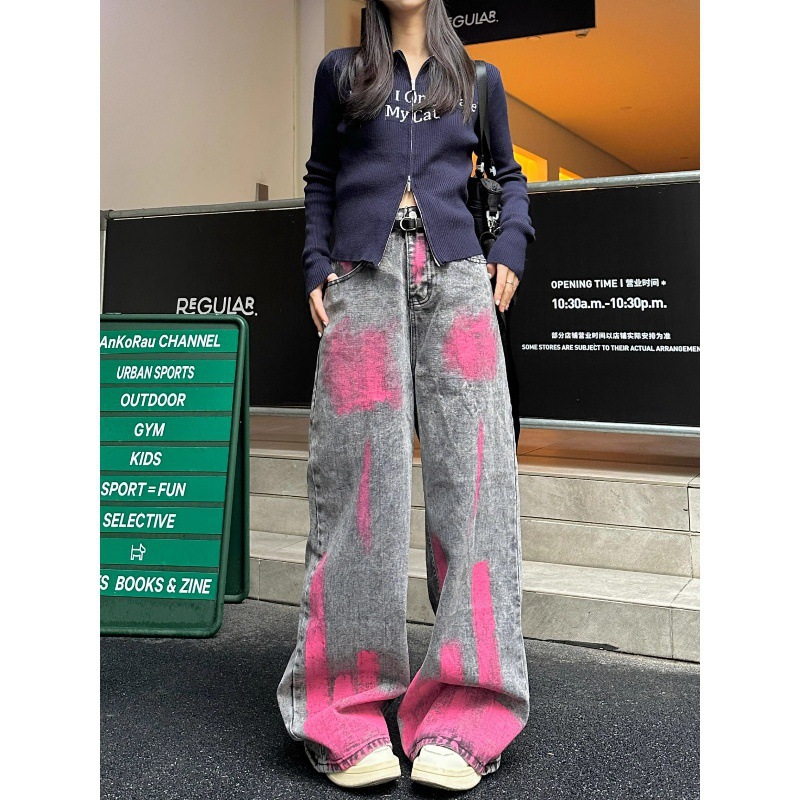 2025 새로운 미국 낙서 청바지 독특한 거리 힙합 컬러 대조 디자인 센스 와이드 다리 바지 느슨한 캐주얼 바지스토어 가기