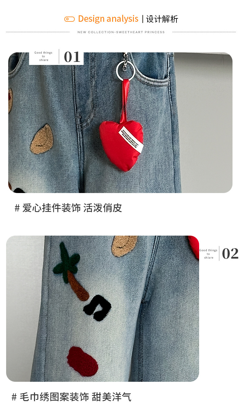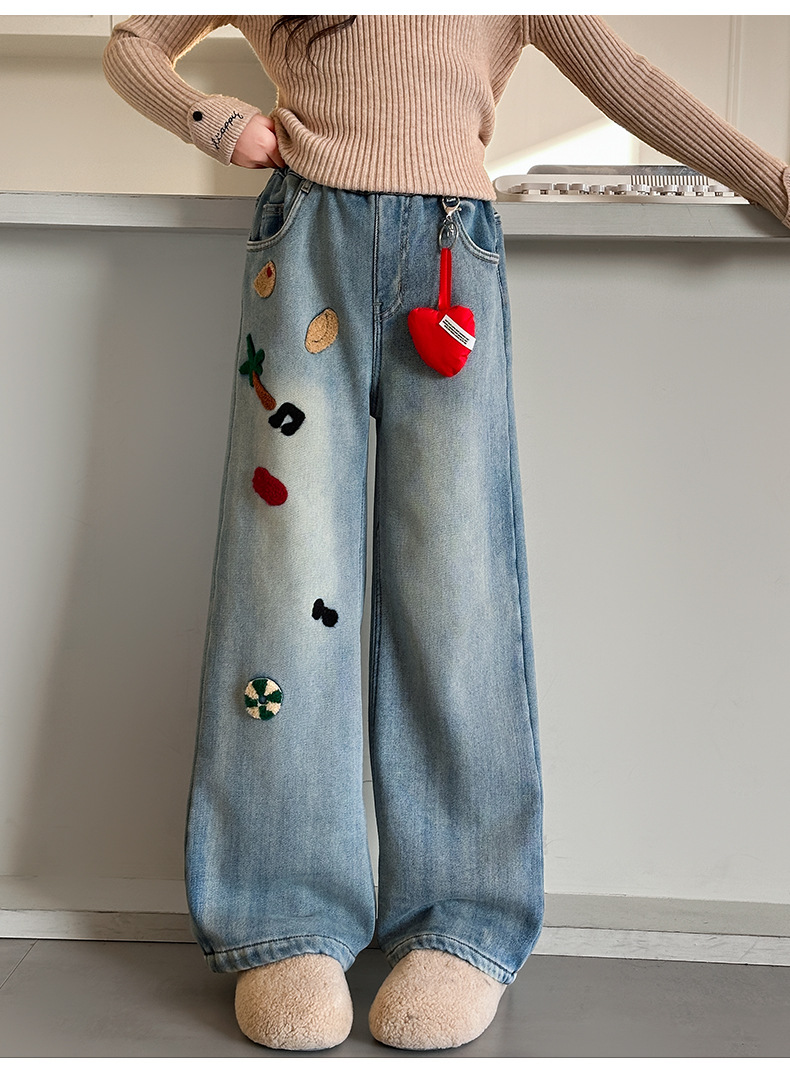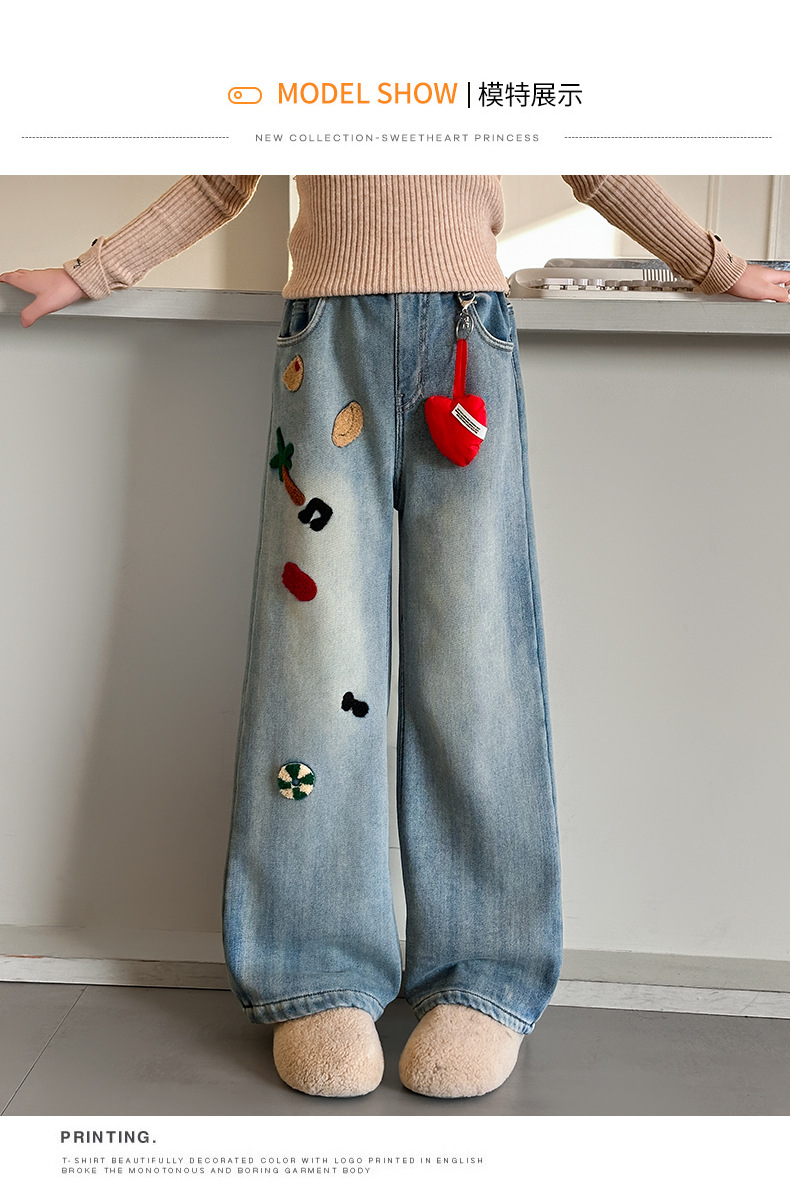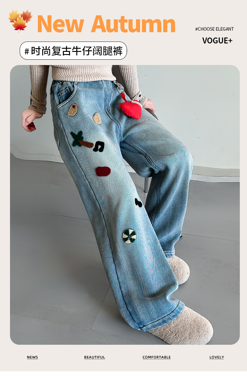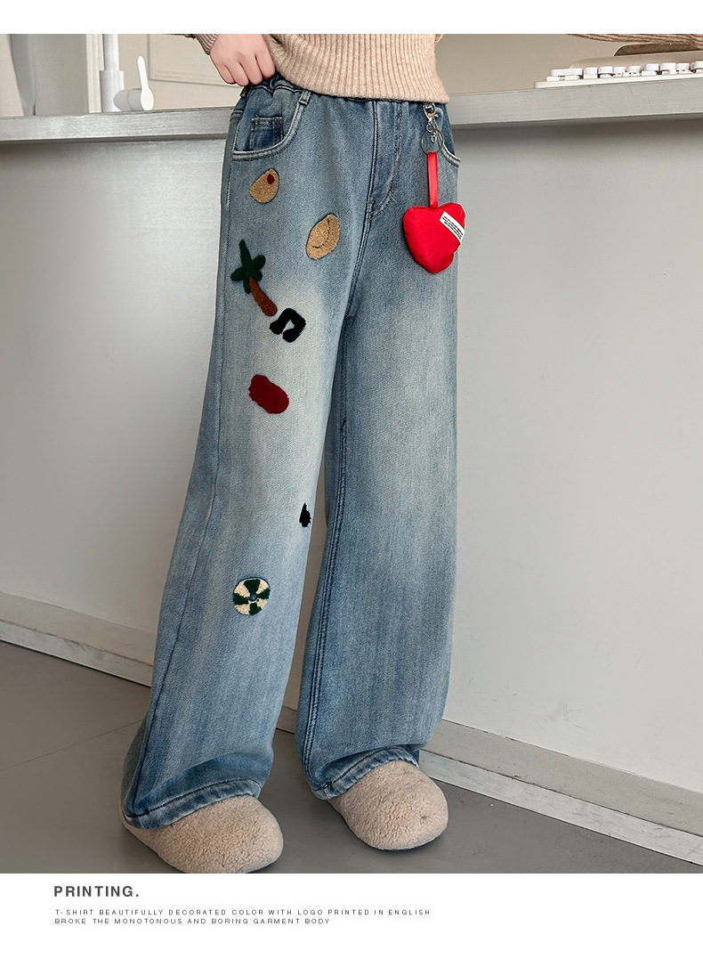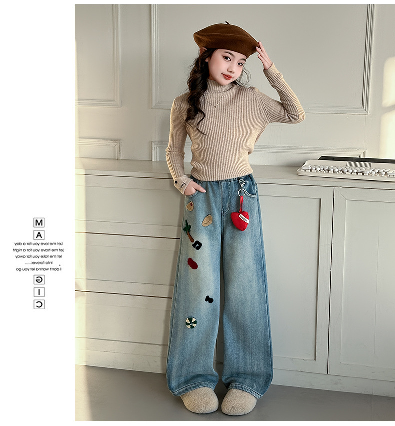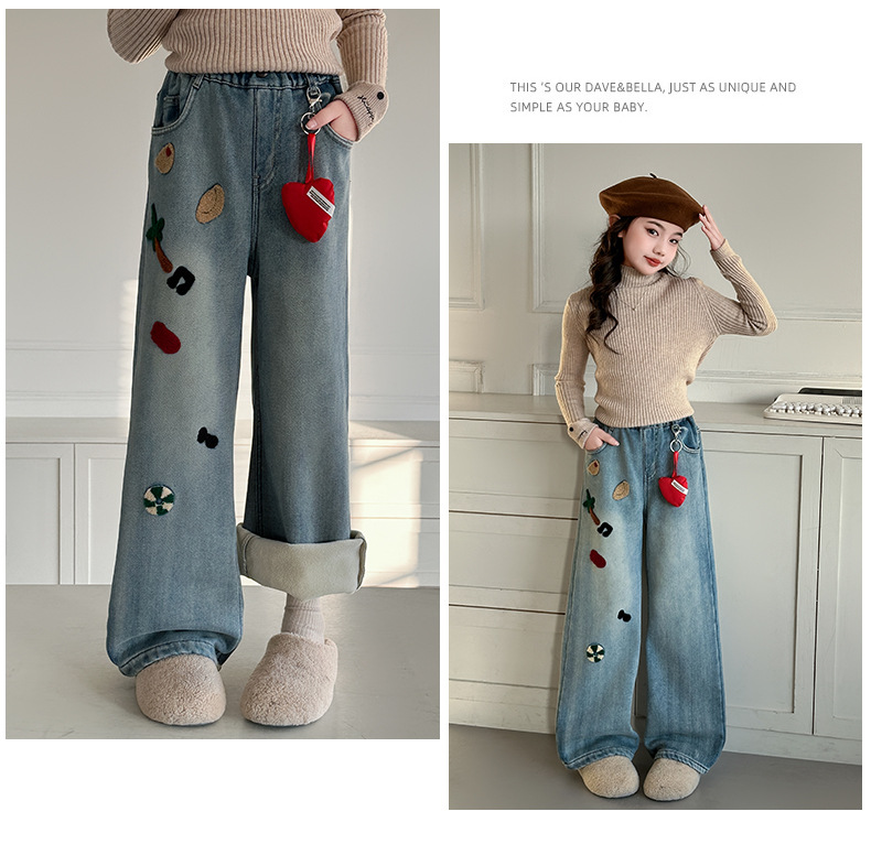 소녀들의 가을과 겨울 기모 두꺼운 넓은 다리 바지 청바지 큰 어린이 소녀의 서양식 어린이 겨울 착용 트렌디 한 바지스토어 가기