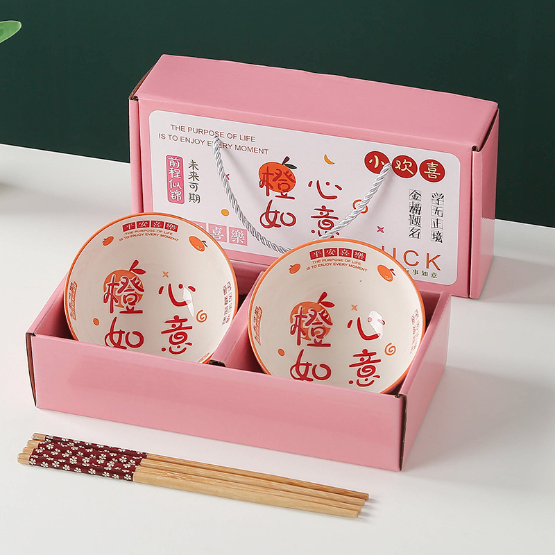 • 오렌지 하트 루이 그릇 2개 젓가락 2개 (핑크색 선물 상자)