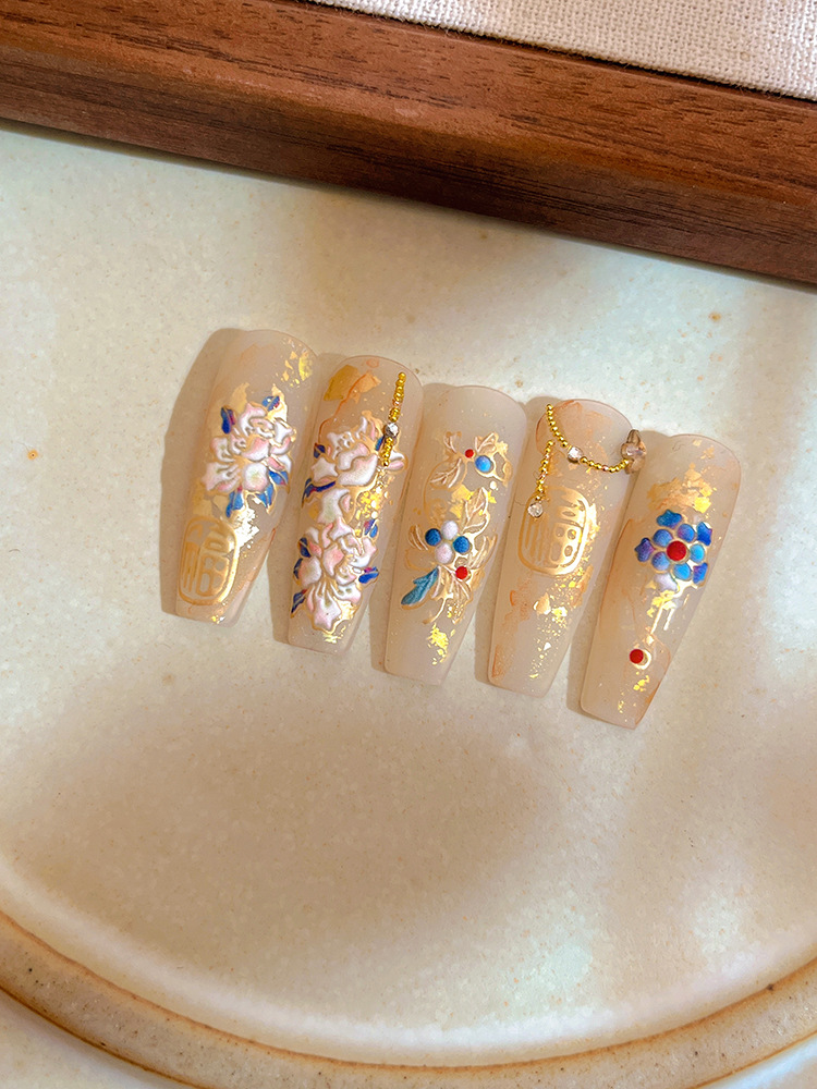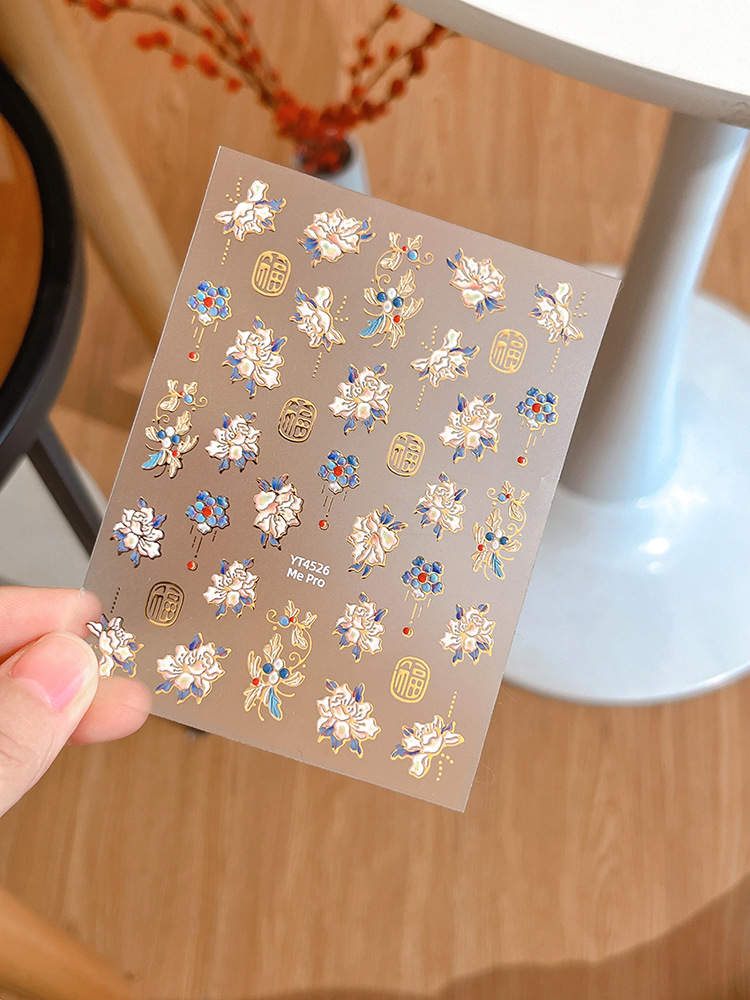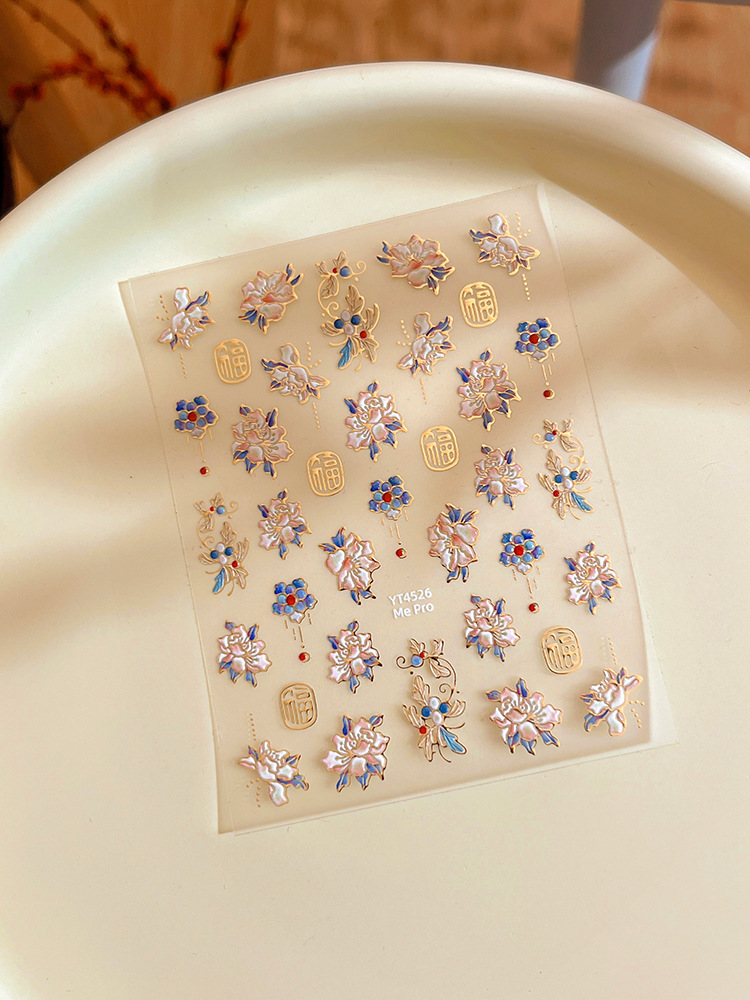 브론징 양각 모란 꽃 네일 아트 스티커 행운의 단어 절묘한 꽃 빛 럭셔리 바람 접착 네일 장식 도매