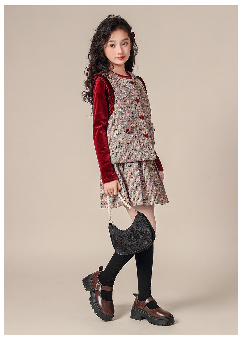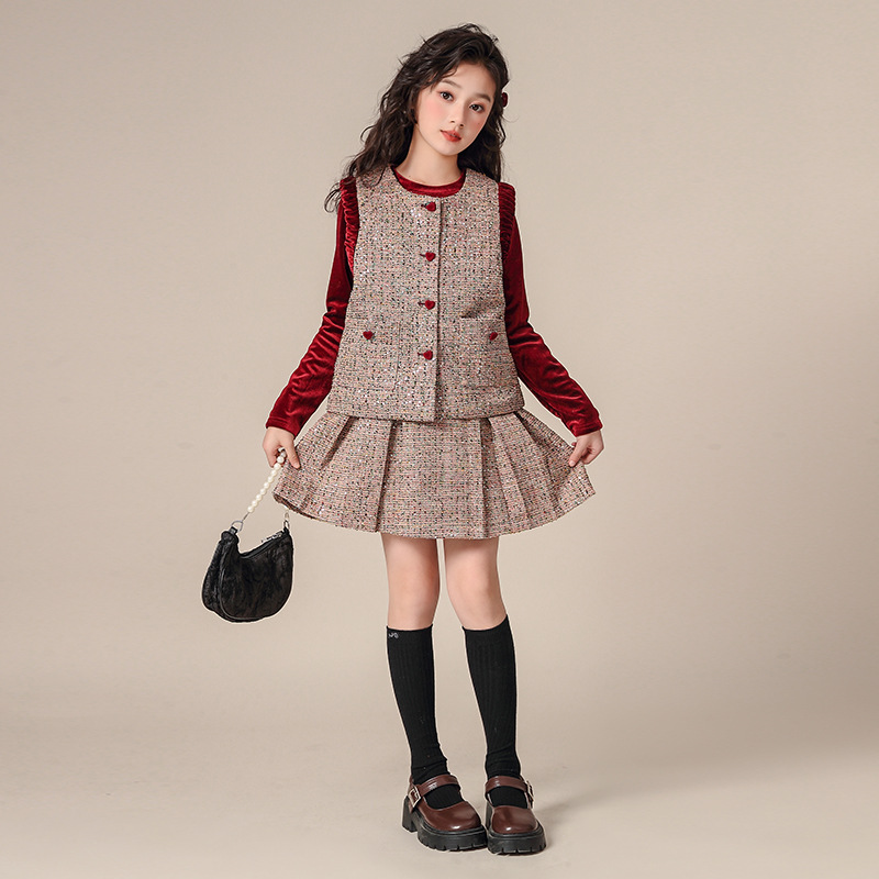 2025 년 신년 소녀 세트 큰 어린이 샤넬 스타일 조끼 속편 벨벳베이스 스커트 3 피스 세트 세트